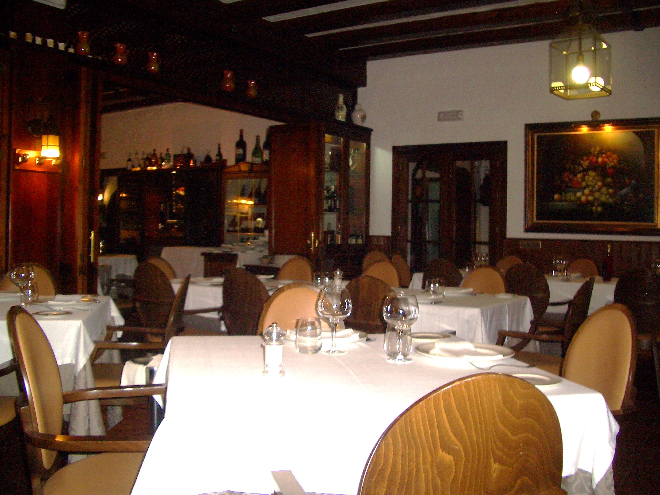 A parte de la terraza el comedor principal se subdivide en dos zonas, es muy amplio y su decoración clásica tirando a rústica. La ventaja de ser domingo a la cena me permite elegir mesa y busco la más idónea que aun no siendo terraza tiene unas magnificas vistas desde donde contemplar esas tonalidades anaranjadas con mi fiel compañera, la cerveza.
