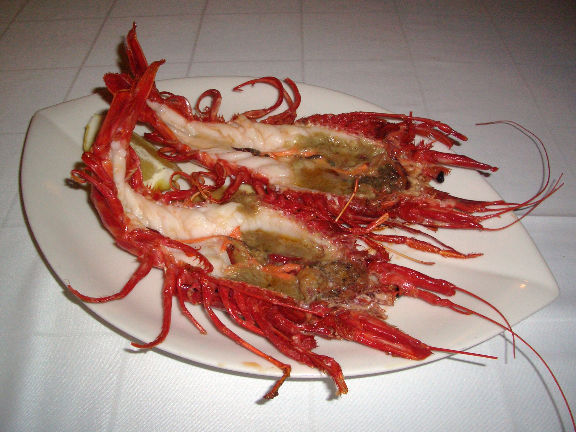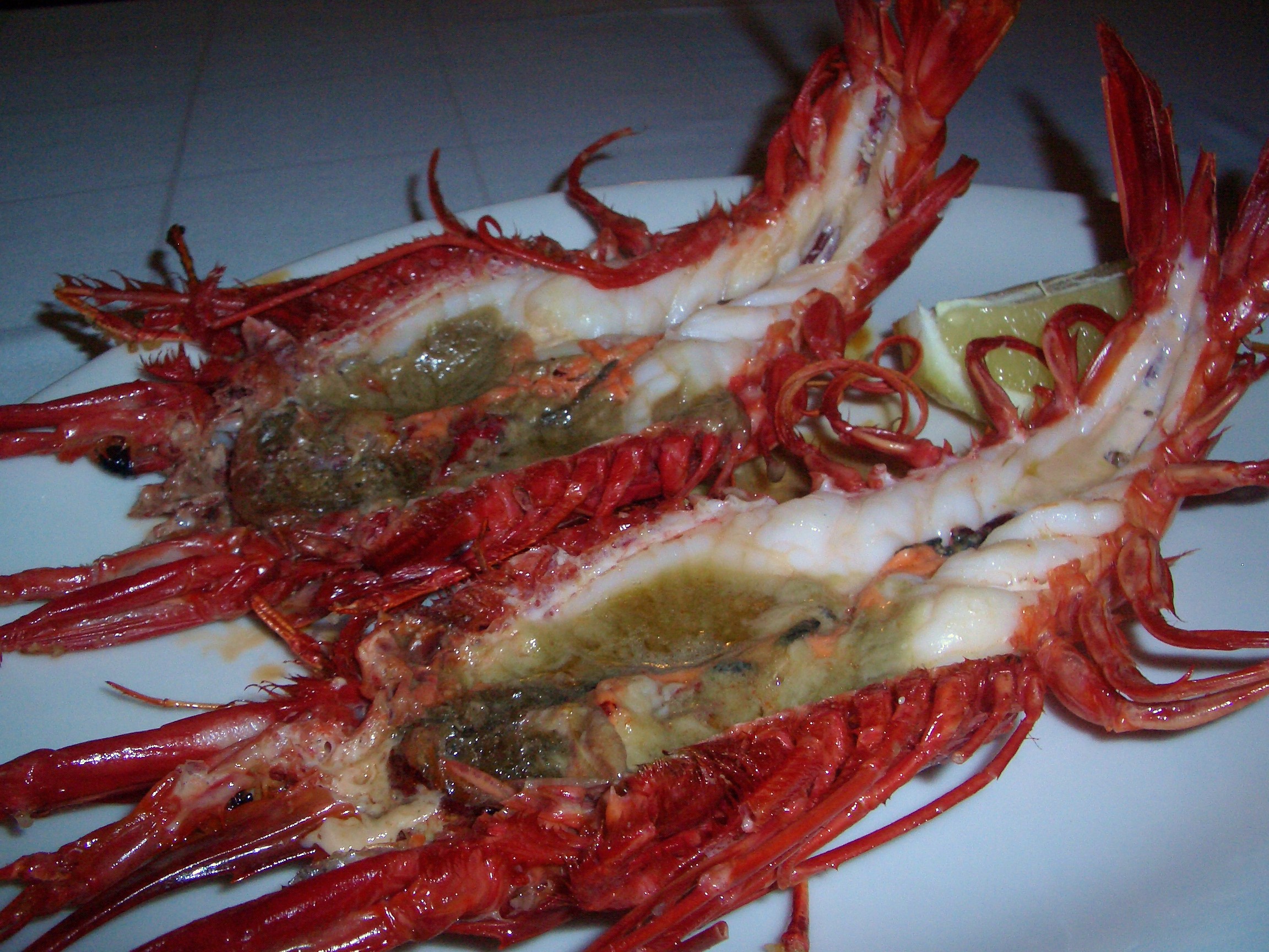 Estar en el sur y ver carabineros en la carta en un restaurante de solvencia ya sabéis lo que supone, mi incapacidad para ignorarlos así que fue mi siguiente plato. Me ofrecieron servirlos abiertos cosa que a priori rechacé matizando que no quería perder todos los jugos de la cabeza, me aseguraron que eso no iba a suceder y ante la comodidad que supone a la hora de comerlos acepte su sugerencia. Viendo el resultado se aprecia que en cocina tienen la solvencia y pericia adecuada y que mis carabineros abiertos no eran un experimento.