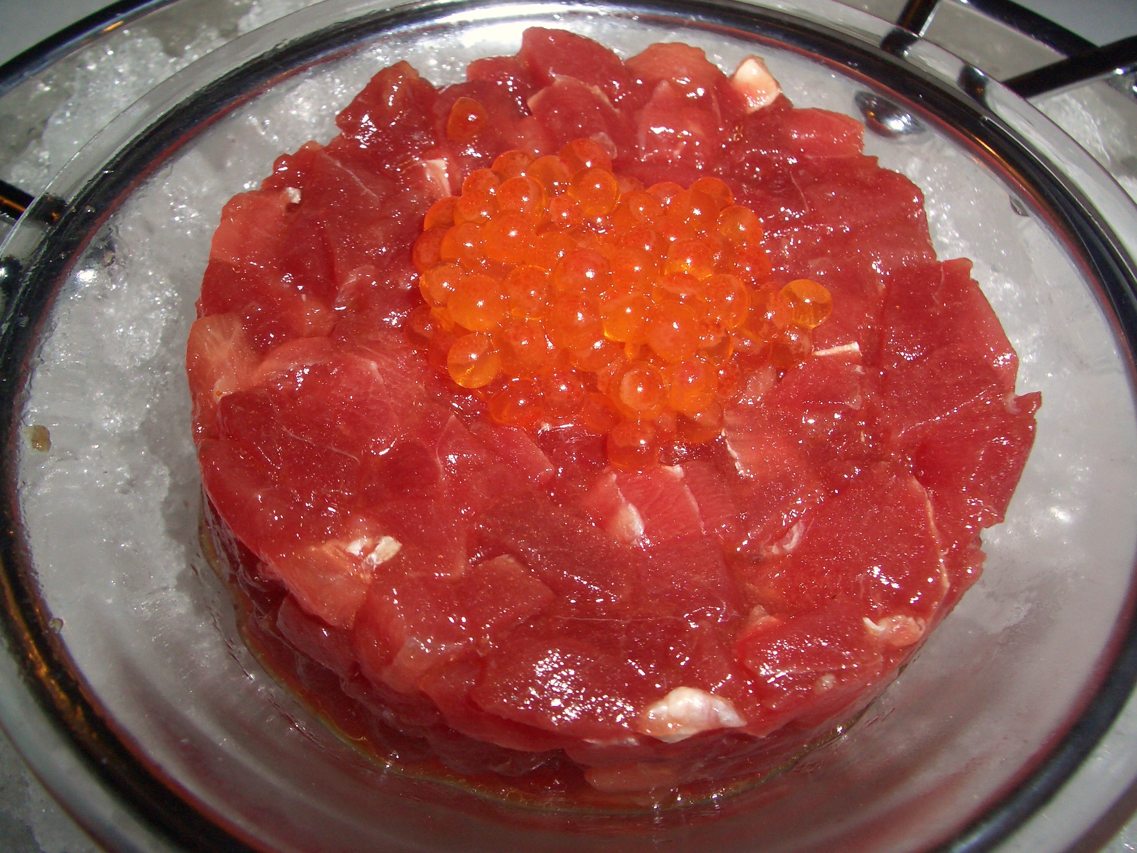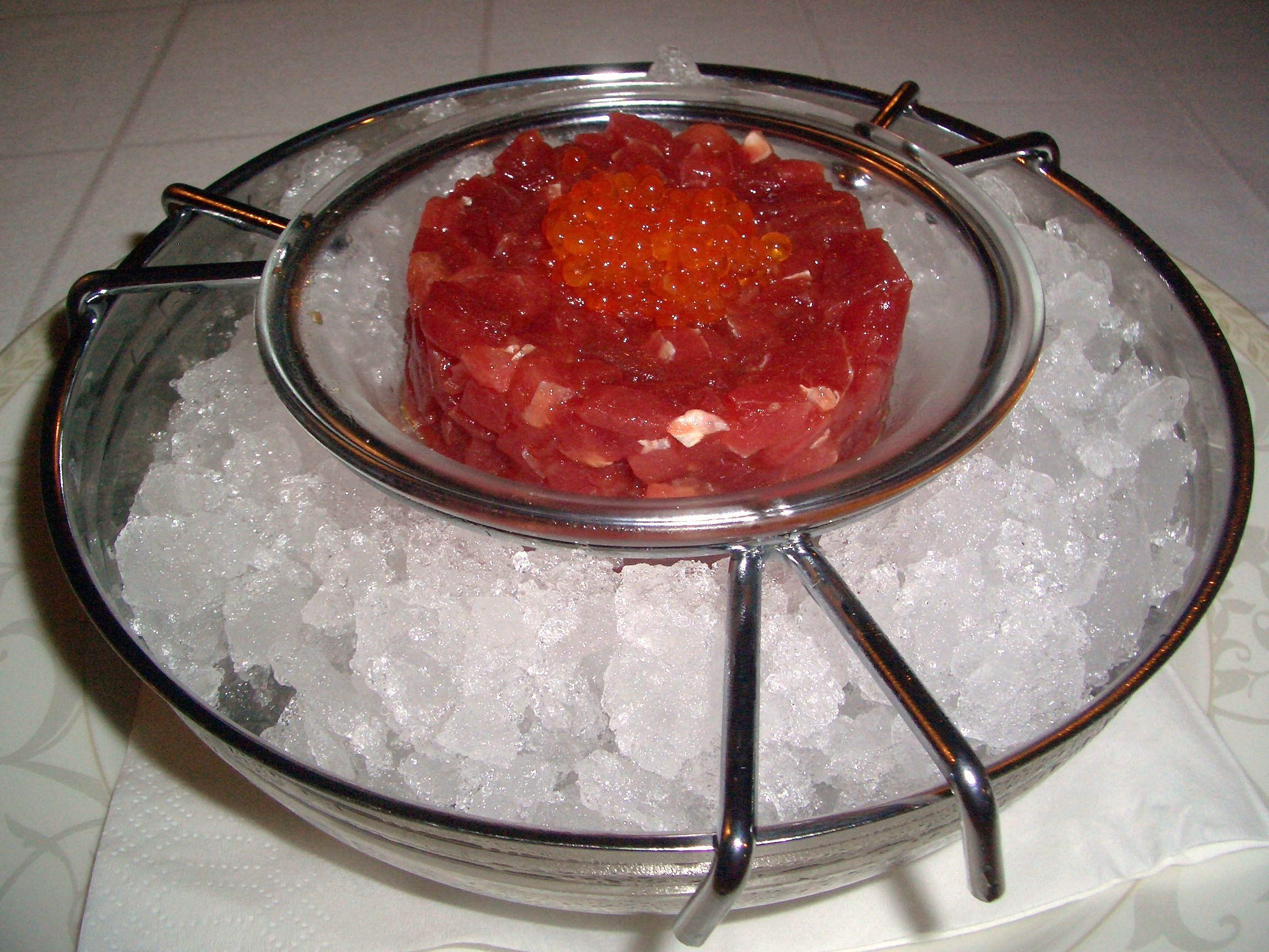 Si que tenía razón, me resulto más suave al punto que le tuve que preguntar cual era el aliño ya que era tan sutil que bien parecía un sashimi cortado en cuadraditos de perfecto tamaño. Su aliño lleva aceite, soja, balsámico y pimienta pero todo ello en proporciones muy tenues. La presentación en su recipiente de cristal con hielo triturado nos recuerda a las presentaciones del caviar, cambiamos el oro negro por el oro rojo y ya tenemos un plato espectacular.