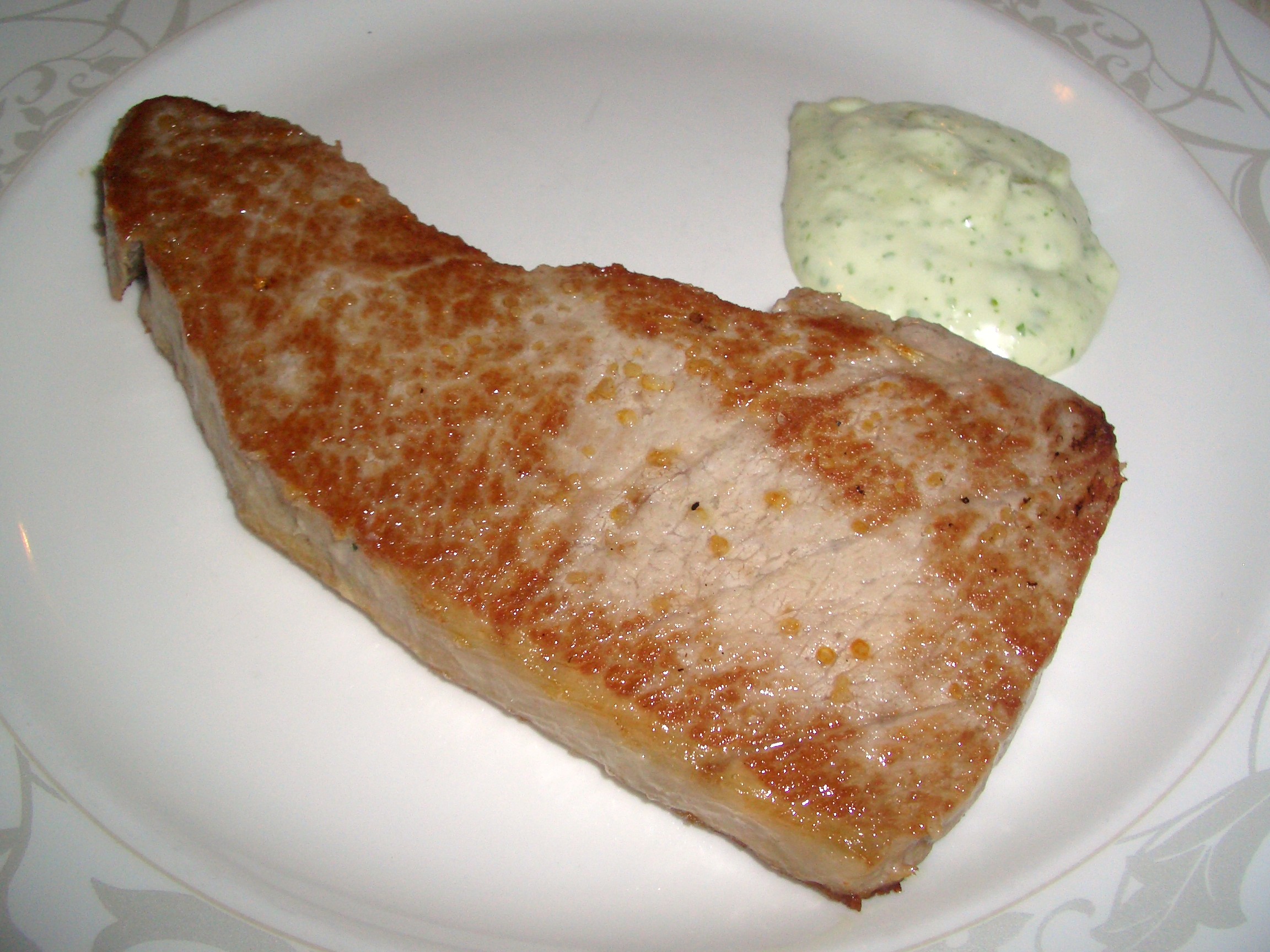 Finalice con la ventresca de atún, así la llaman en el Antonio aunque por la zona os encontrareis muchos sitios en los que la denominan barriga, son exactamente lo mismo. Una buena rodaja con el punto perfecto y esa grasilla entreverada que me vuelve a hacer babear solo con recordarlo. Vino acompañado de una guarnición de patatas y guisantes servida en plato a parte, quizás hubiese preferido una ensalada de tomate, al menos visualmente me hubiese resultado mas atractiva.