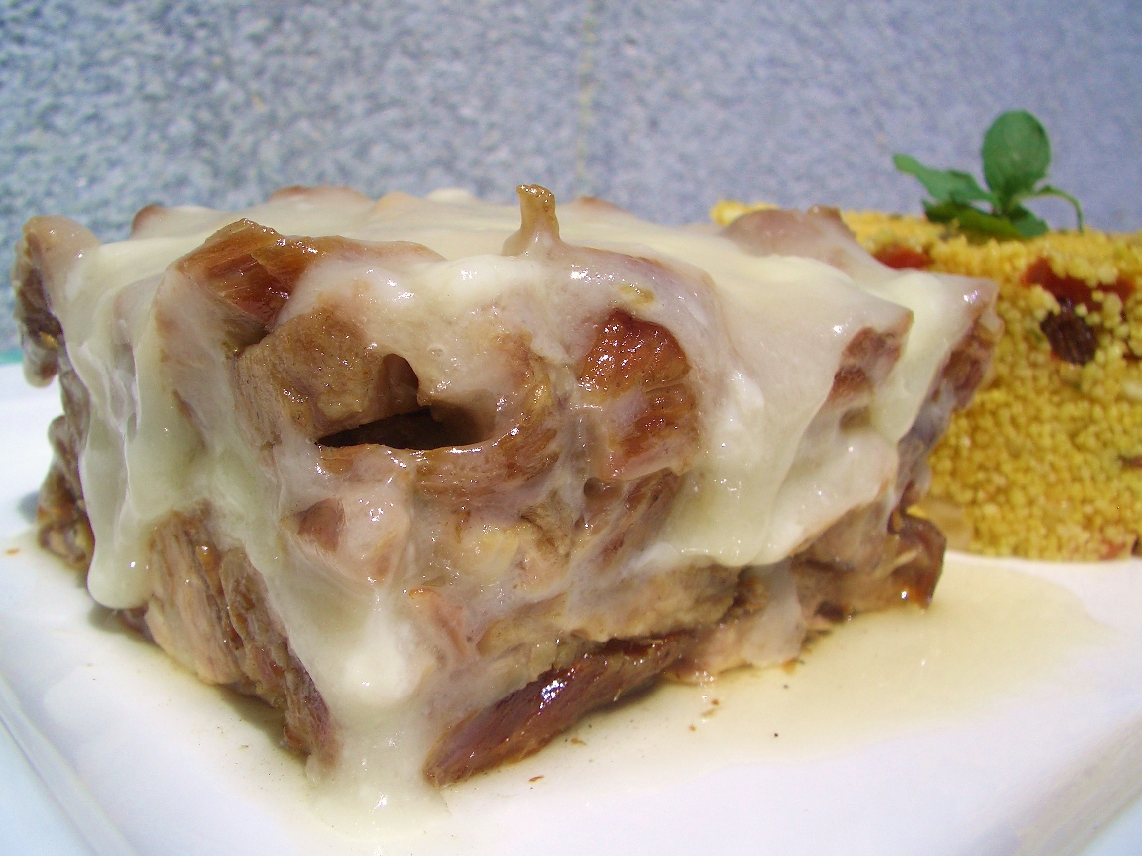Para el emplatado con la ayuda de unos aros colocamos una capa de costilla, otras de queso, una de costilla y terminamos con otra de queso. Como veréis en las fotos la cremosidad del queso junto con el calor de las costillas hace que todo quede muy ligado, no hace falta hornear para que funda.