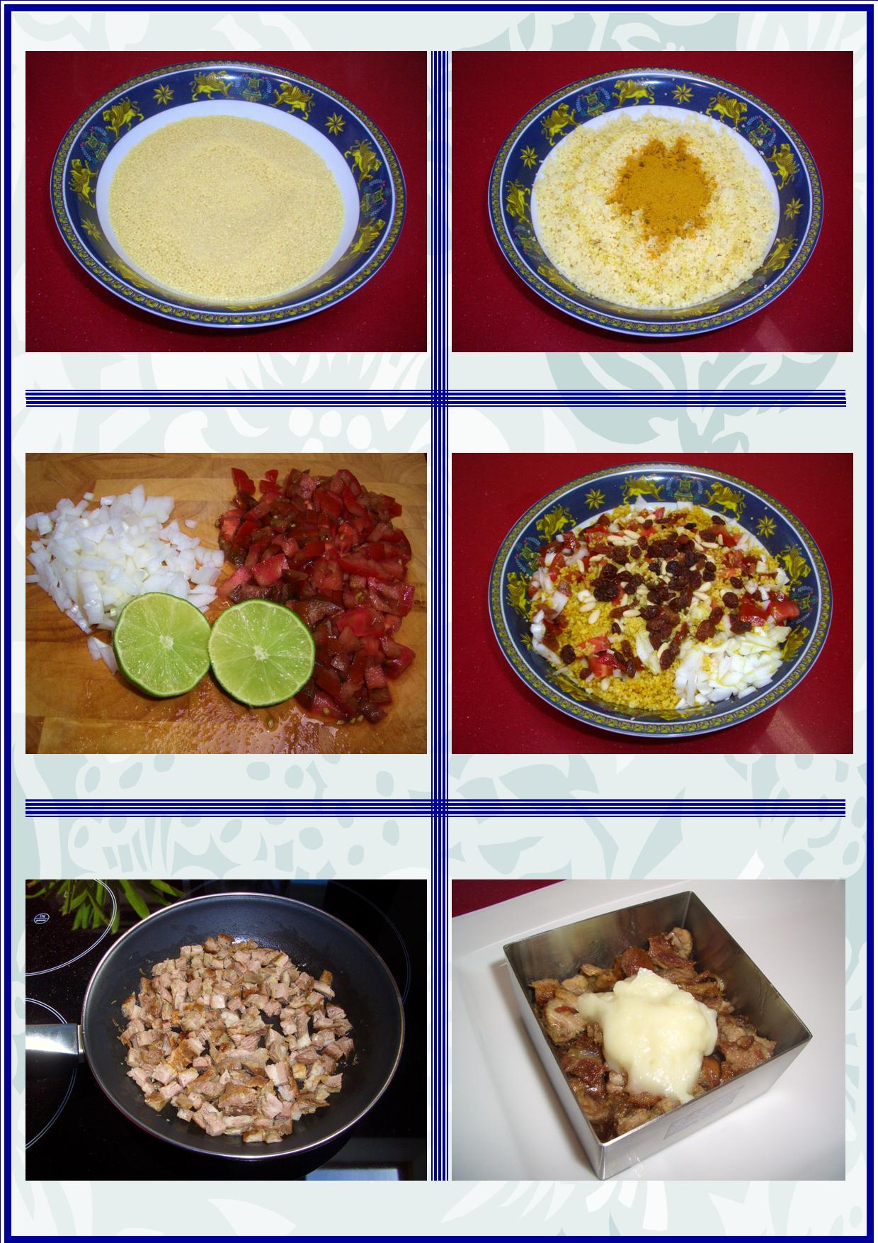 Cortamos la cebolleta y el tomate en brunoise y añadimos al couscous junto con unas pasas y piñones, exprimimos el jugo de una o dos limas dependiendo del zumo que contengan, removemos todo y guardamos en la nevera.