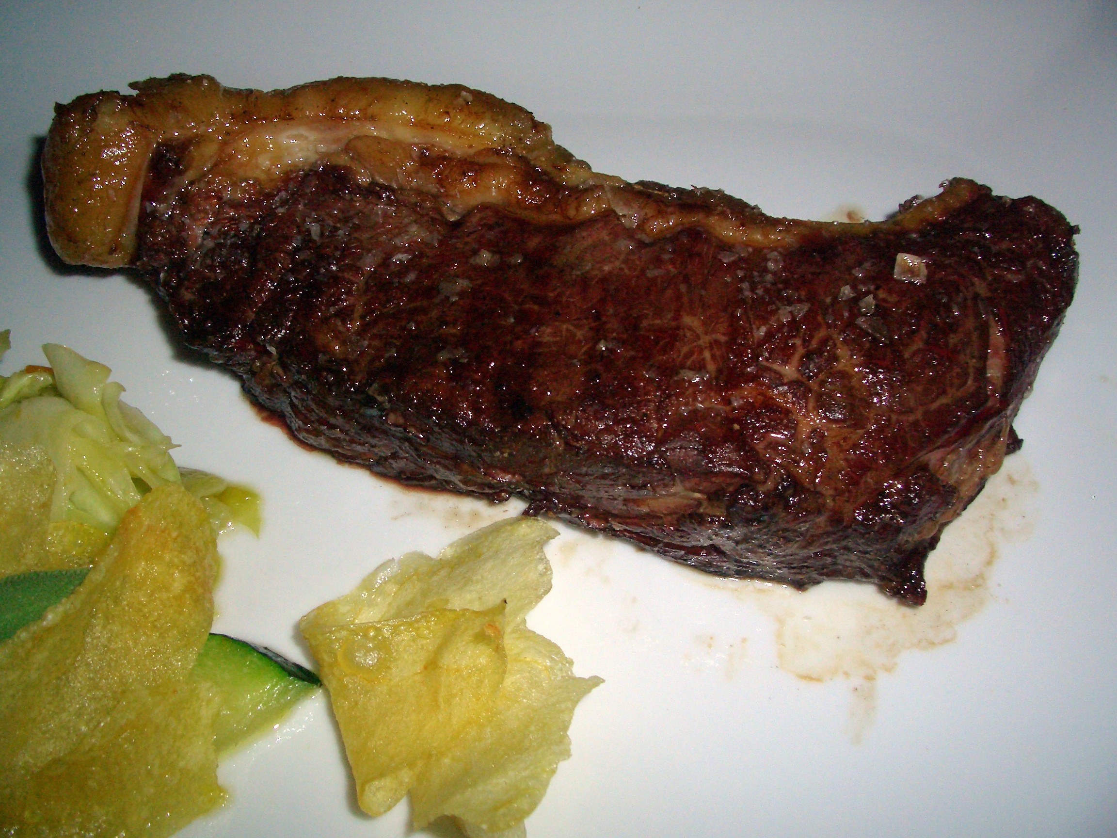 Llega el momento esperado, el lomo alto de vaca retinta de Zahara de los Atunes. Una de esas vacas que veo todos los días iba a ser mi cena, ¿pena?, ninguna, es lo que nos pasa a los predadores carnívoros. La verdad es que no se describir su sabor, simplemente comentar que resulta una carne totalmente diferente a las degustadas en otras ocasiones, tiene un sabor potente y esta muy rica.