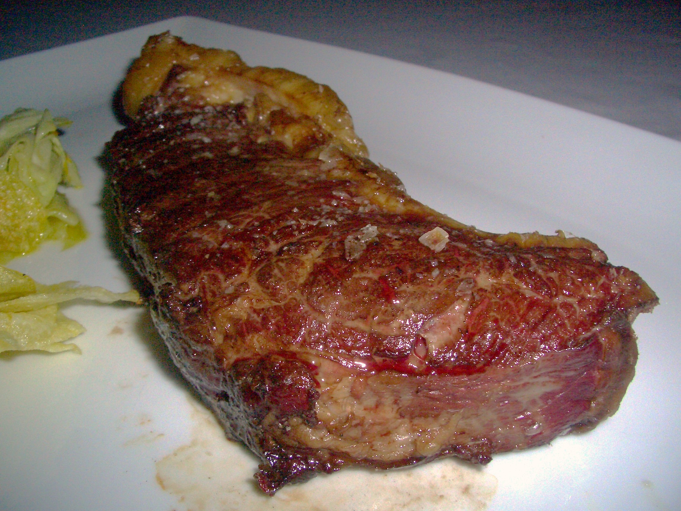 Cerramos con un lomo bajo de macho berrendo castrado de Extremadura, esta carne si que me recordó mas a los sabores a los que estoy habituado por el norte, su textura, jugosidad, color. Aquí la calidad de las fotos es bastante peor, estamos en noche cerrada y tengo poca luz pero creo que podéis intuir la belleza del corte.