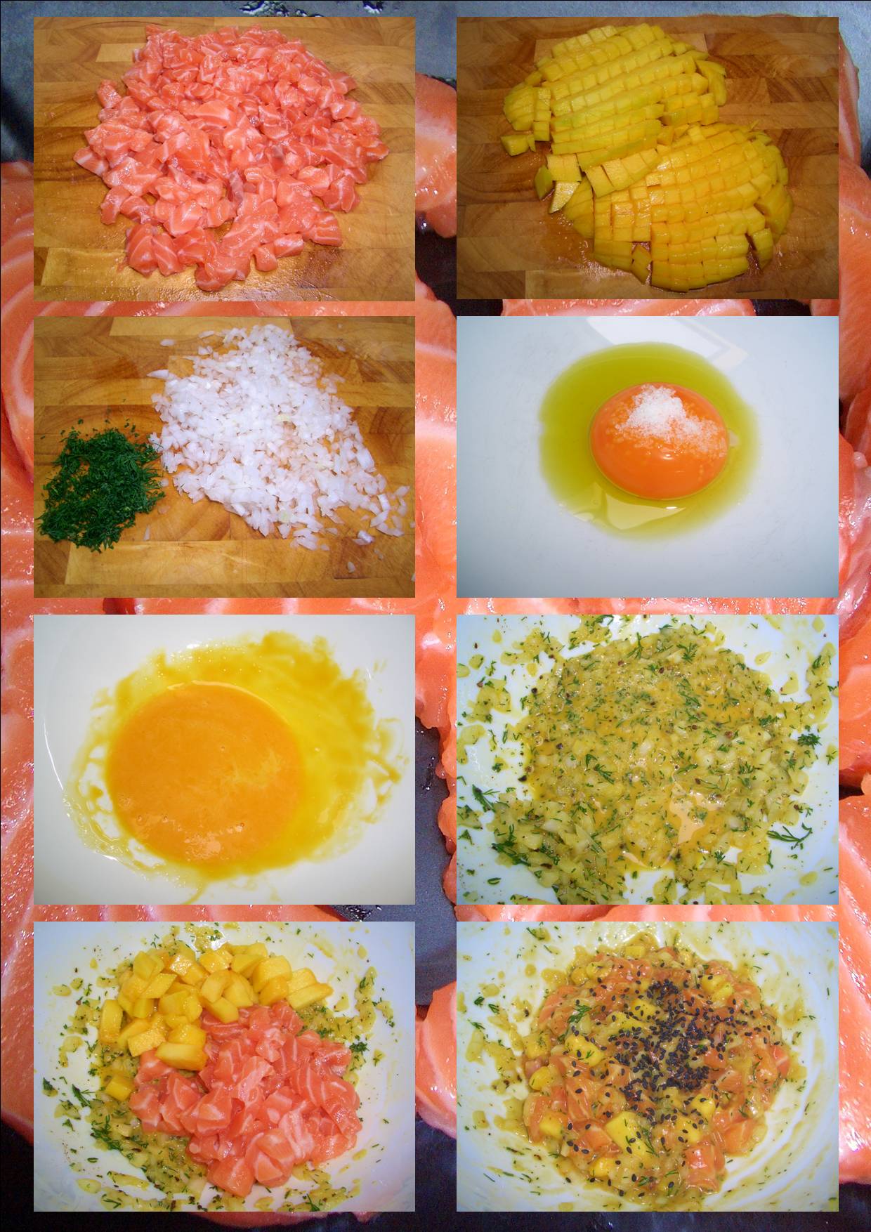 El salmón ya estará listo, cortamos en dados no muy grandes y reservamos mientras atempera. En un bowl echamos una yema de huevo, añadimos un poco de aceite y sal y mezclamos bien, añadimos el zumo de jengibre y mezclamos, incorporamos la cebolleta y eneldo, mezclamos, hora de añadir el salmón y el mango, un poco de soja, pimienta negra, sésamo negro revolviendo hasta que nos quede un conjunto compacto sin excesos de liquido, rectificamos sal (esto hacerlo al final porque la soja ya es bastante salada). Listo para emplatar.