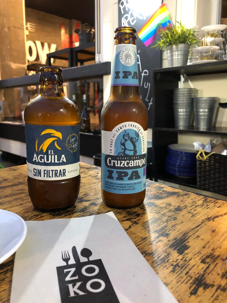 Ubicados en la terraza, mientras nos refrescamos con una Cruzcampo IPA y una Aguila sin filtrar nos sirven unas buenas olivas para ir escudriñando la carta.
