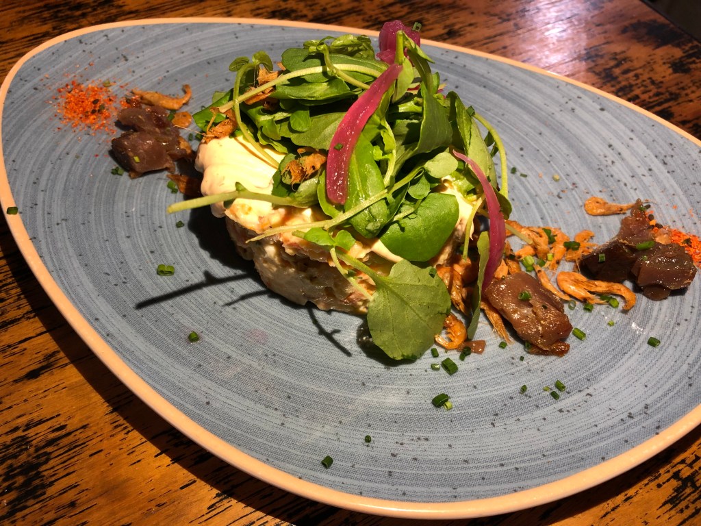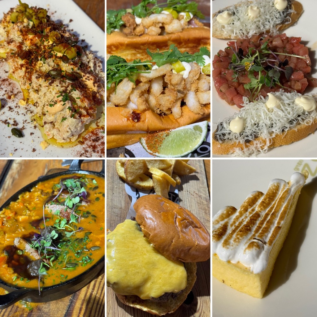 Como en cualquier buen restaurante, la carta y sus platos van evolucionando y en este caso yo diría que subiendo el listón. Inserto este collage de mi visita más reciente en agosto de 2024 y 2023 aunque os invito a leer el resto de platos y visitas en las que observareis la evolución. Aquí os muestro su kebab de pollo y langostinos que sirven en un pan de mollete, la brutal hamburguesa de vaca madura, la ensaladilla rusa de autor con corazón de atún rallado, brioche de calamar y morcilla, tartar de atún rojo y el sobresaliente y meloso arroz de presa ibérica y atún, para rematar con una lemon pie.