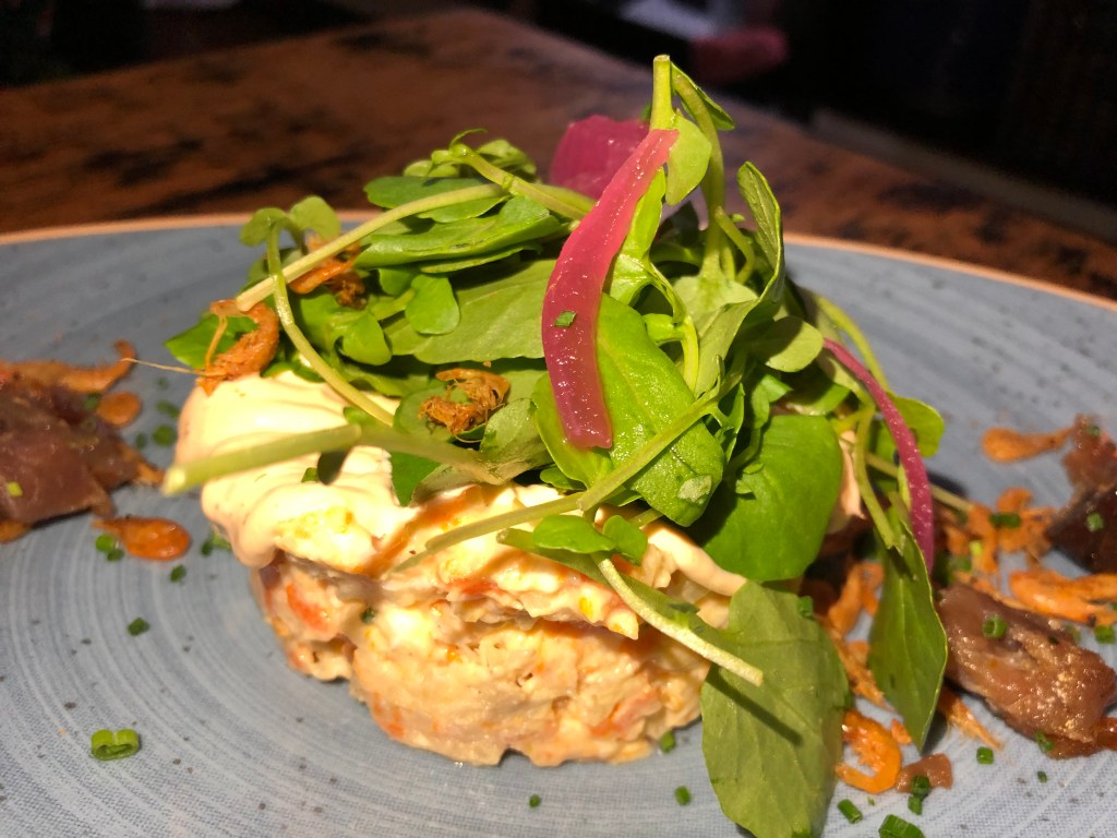 Comenzamos con una ensaladilla de mojama y camarones fritos.