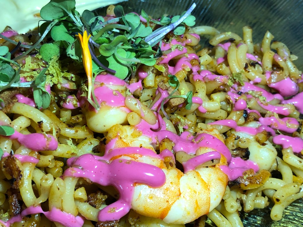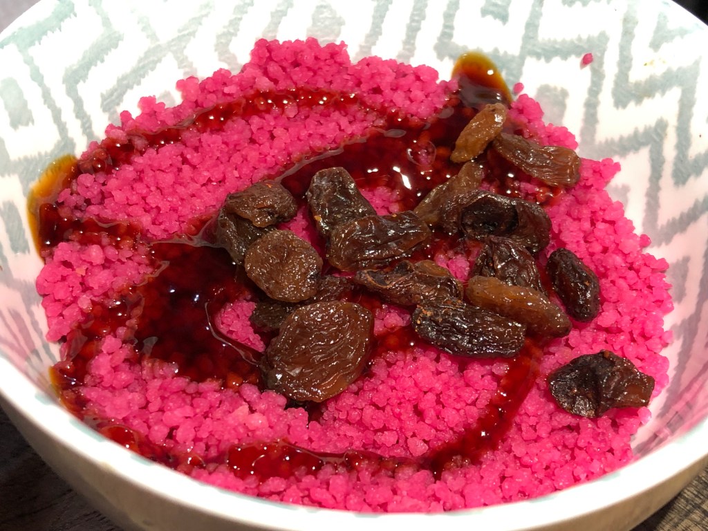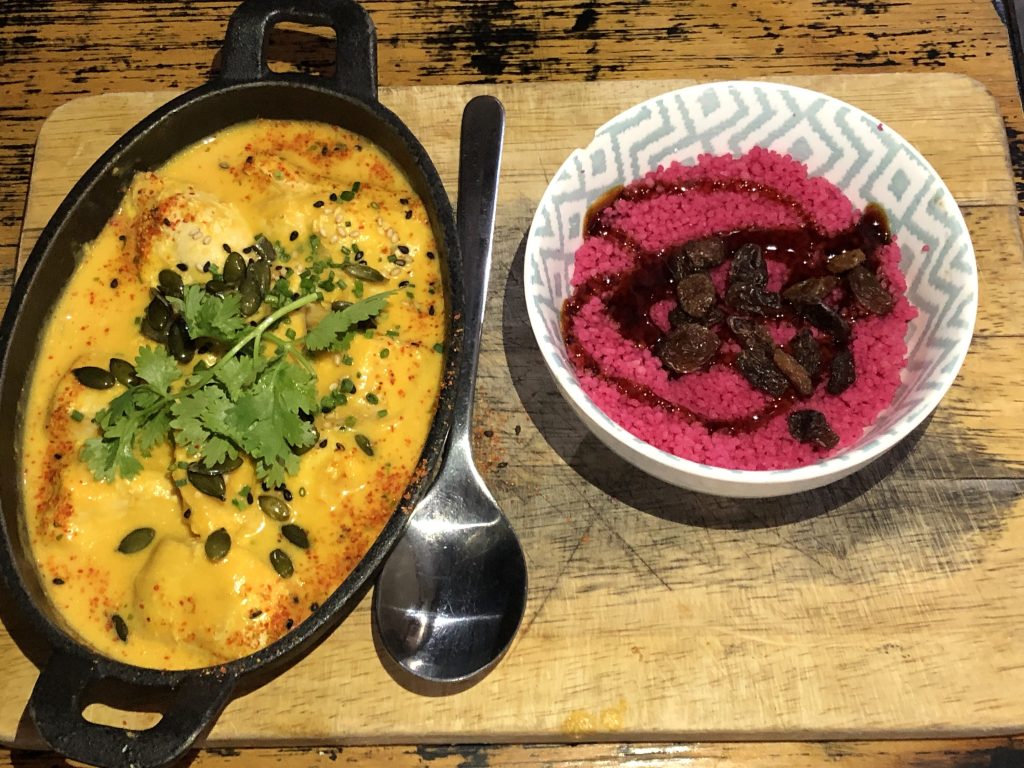 El pollo al curry rojo que es un guiño por el acompañamiento del cous cous teñido con remolacha.