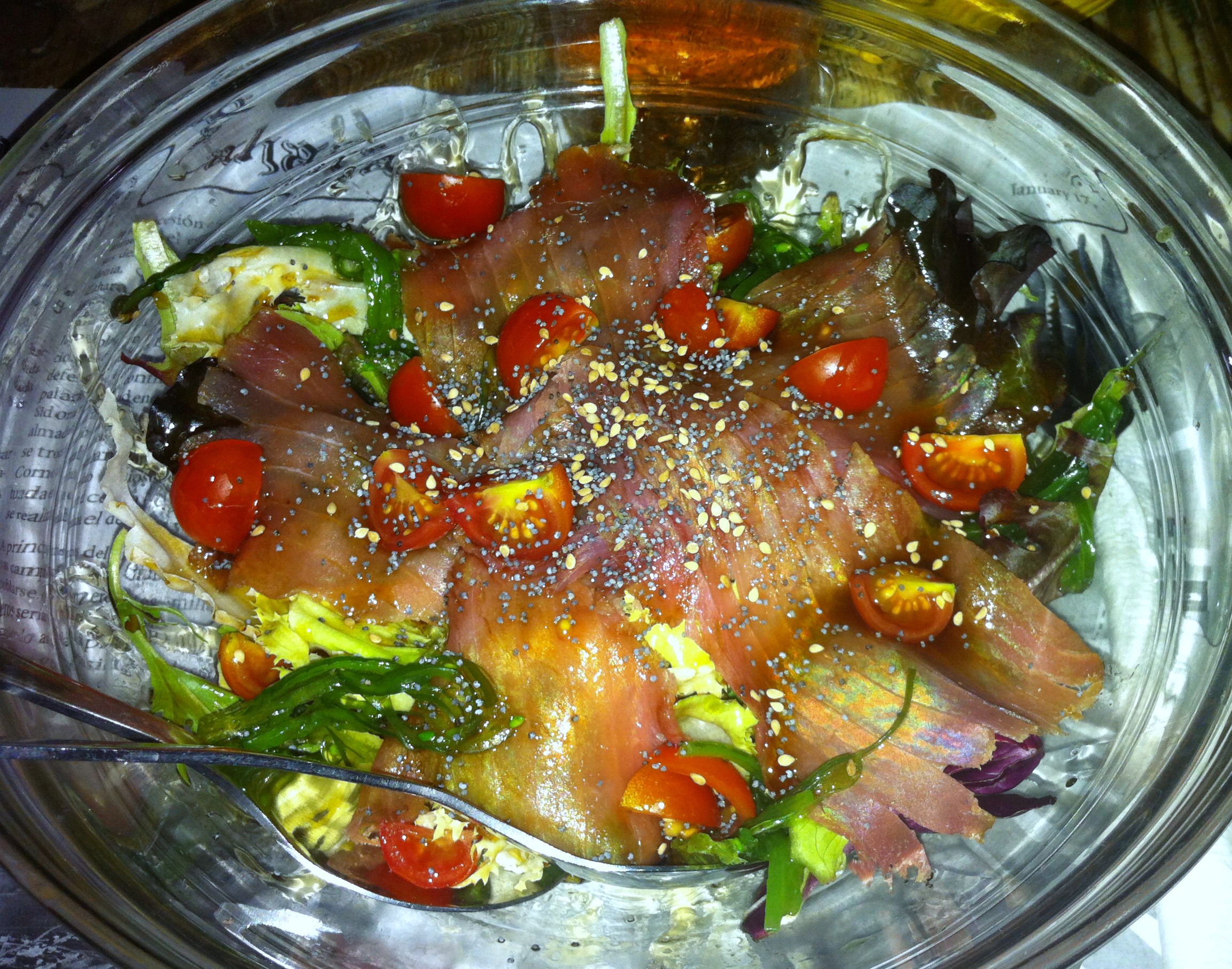 Comenzamos con una ensaladilla de mojama y camarones fritos.