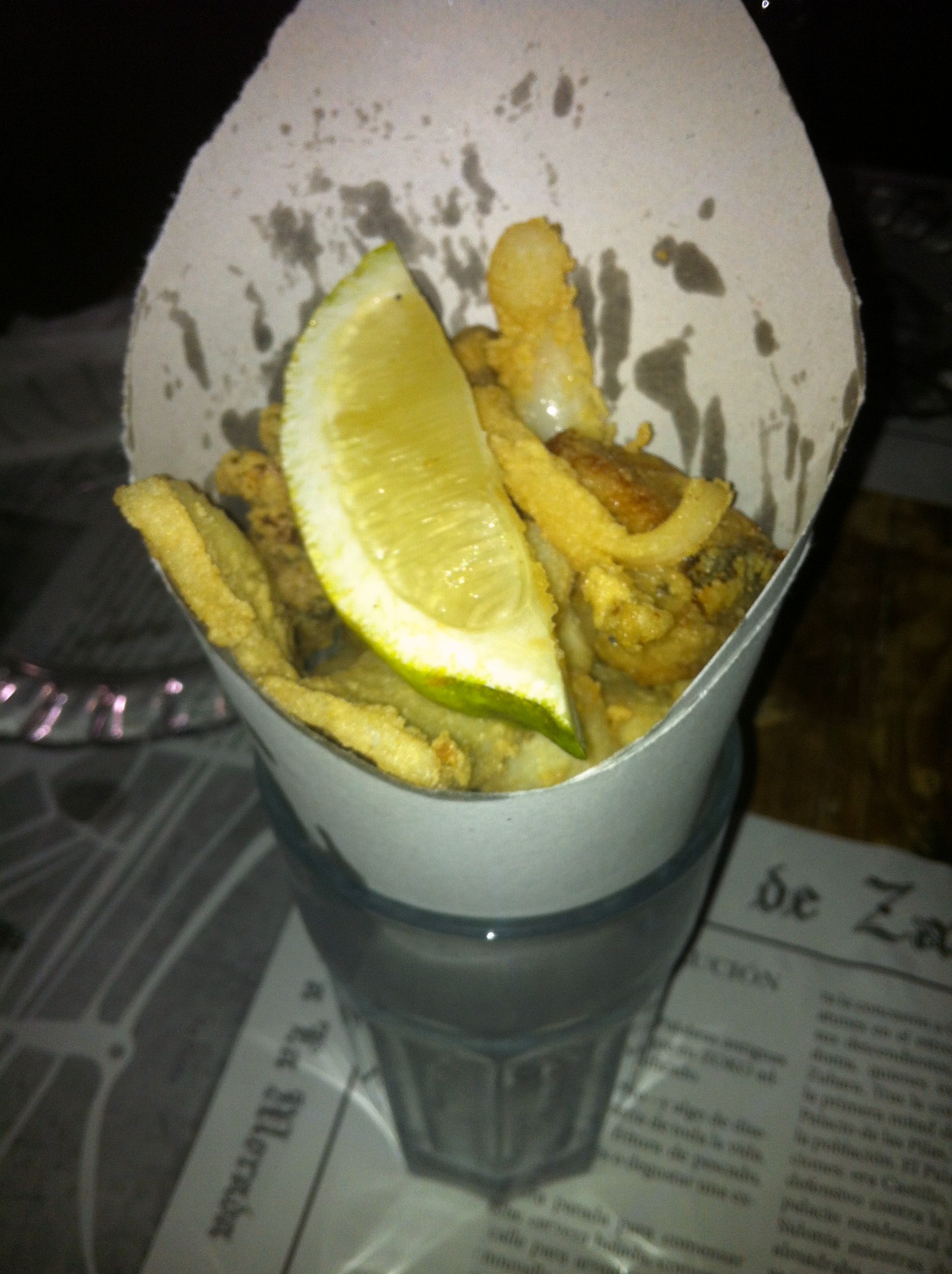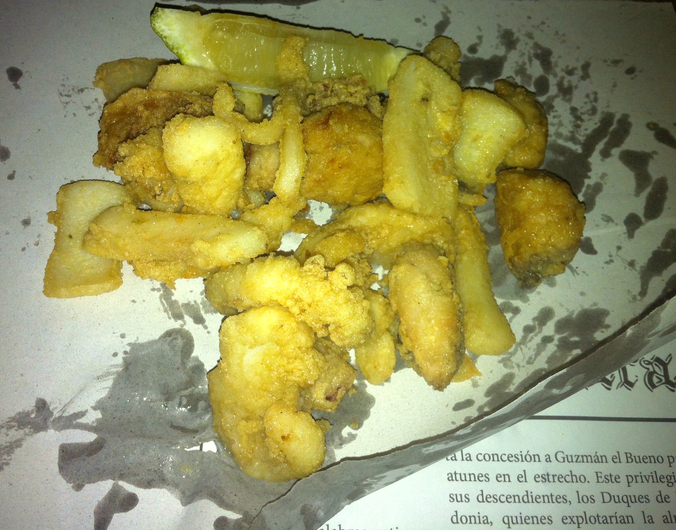 Comenzamos por un papelón de calamares servido al puro estilo de las freidurías de la Bahía de Cádiz.