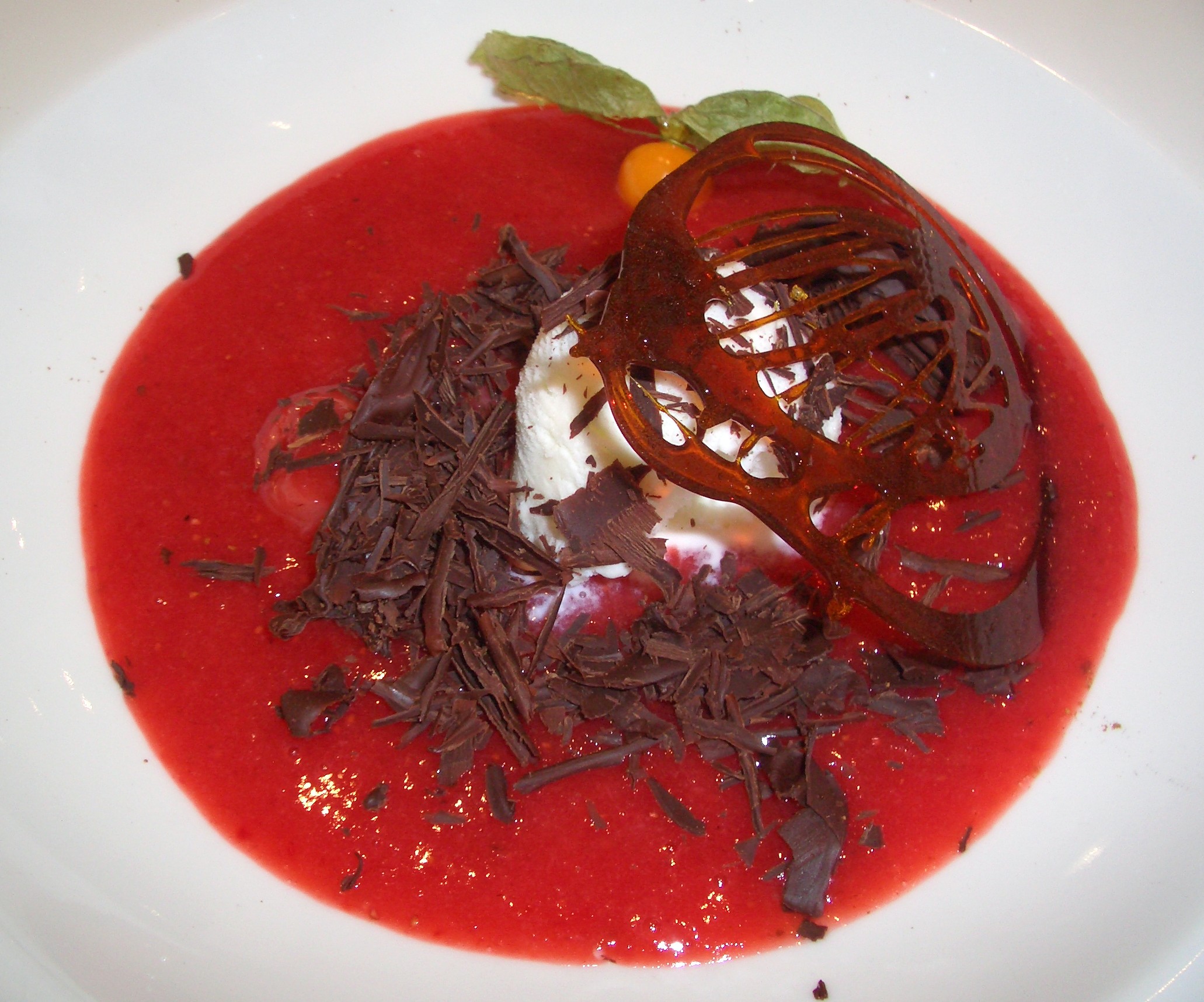 Sopita de fresas con helado de coco y virutas de chocolate. Muy refrescante y atractivo con la decoración del enrejado de caramelo.