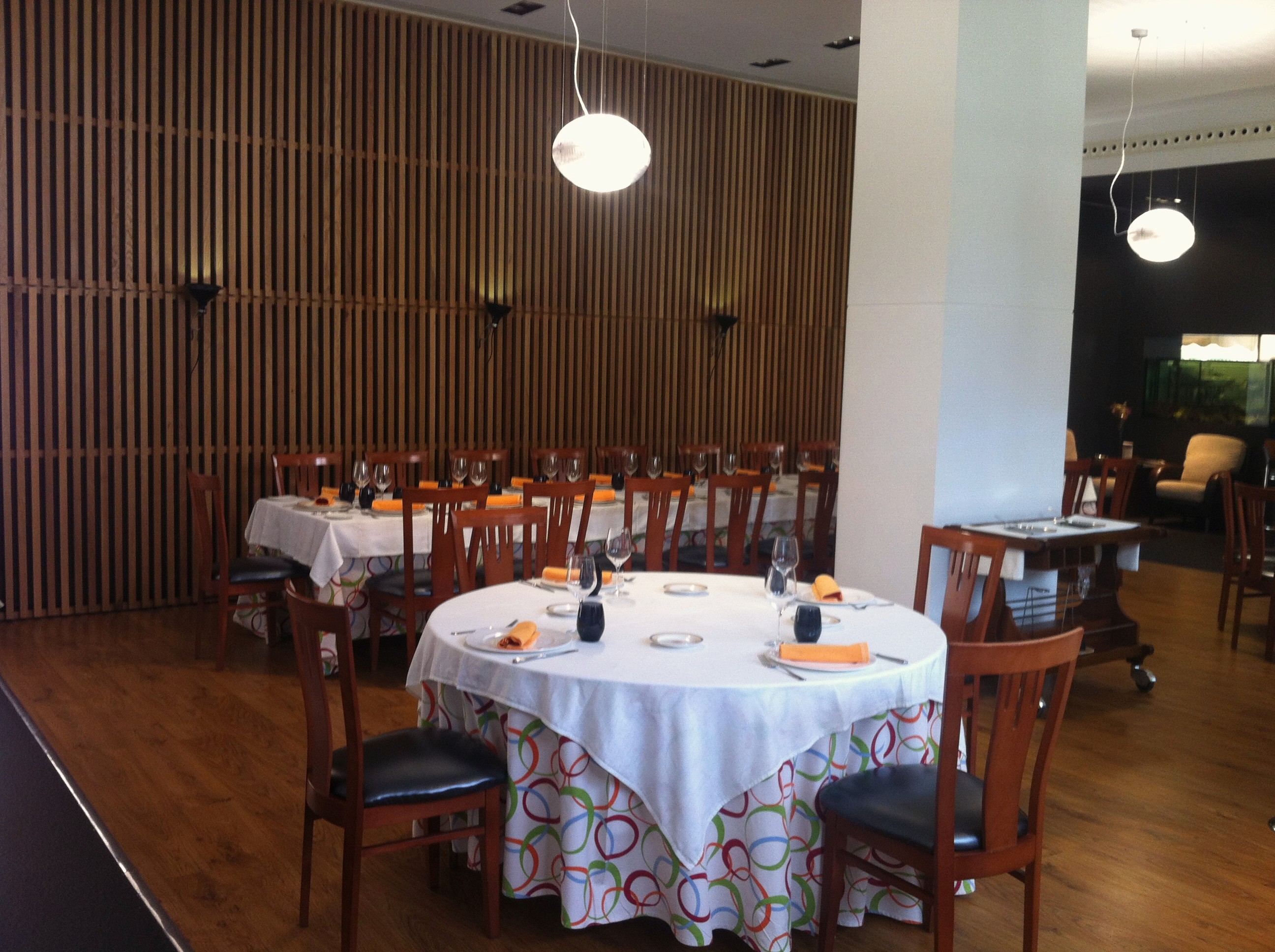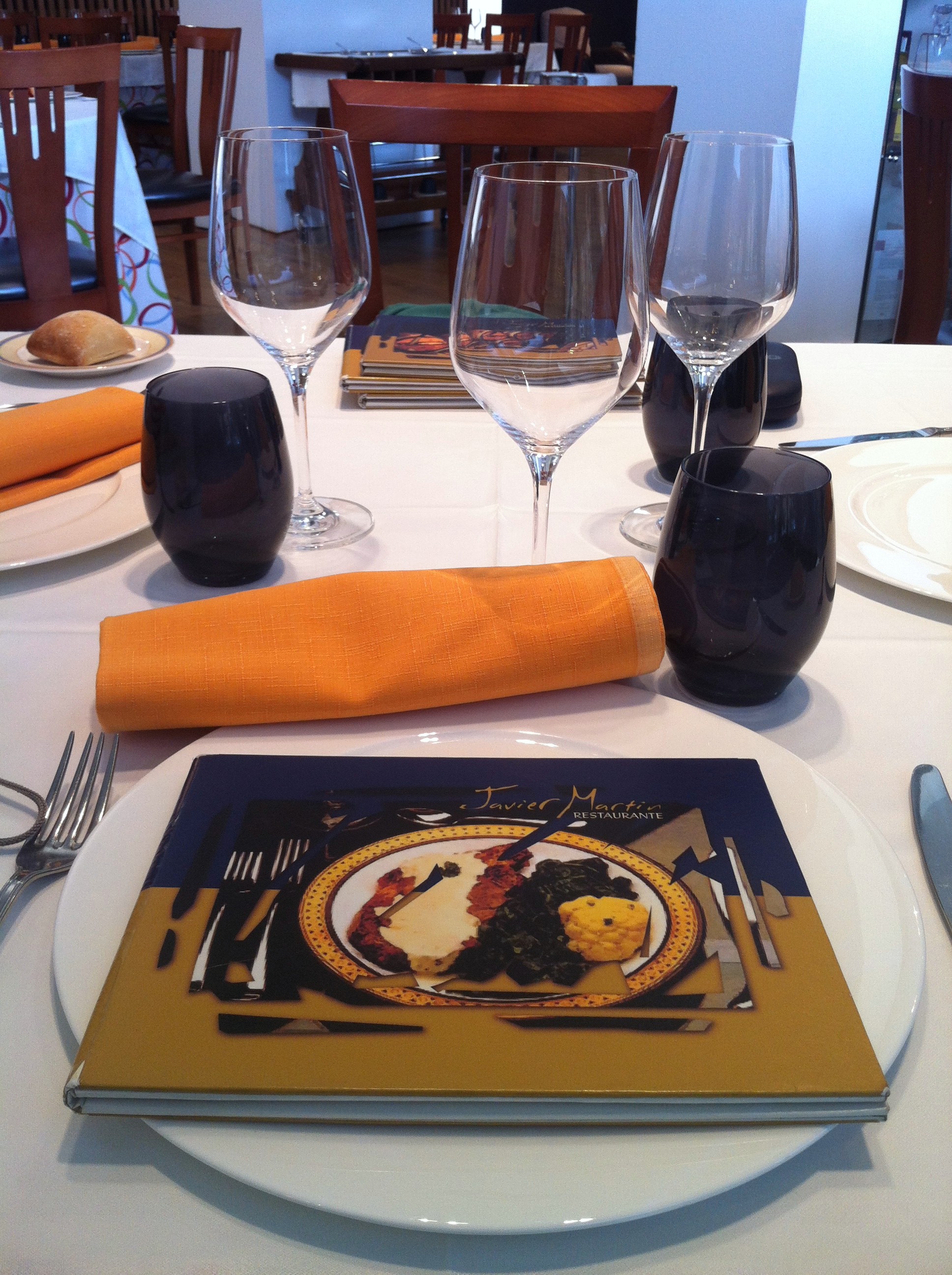 La entrada e interior destacan por el enrejado de listones verticales de madera y unos grandes y luminosos ventanales que junto con unos techos altos dan gran sensación de amplitud. Antes de ir había leído algunos comentarios del Tripadvisor y recuerdo uno del típico hater que se ensañaba con la mantelería, personalmente me gusto mucho, me pareció atrevida, divertida y moderna acorde con el tipo de comida fusión entre tradición y vanguardia que Javier nos ofrece. No queda otra cosa que pensar que este hater seguro tiene en su casa sofas de skay con cabeceros de ganchillo, una televisión con antena de cuernos y probablemente hasta la tapa del inodoro tapizada.