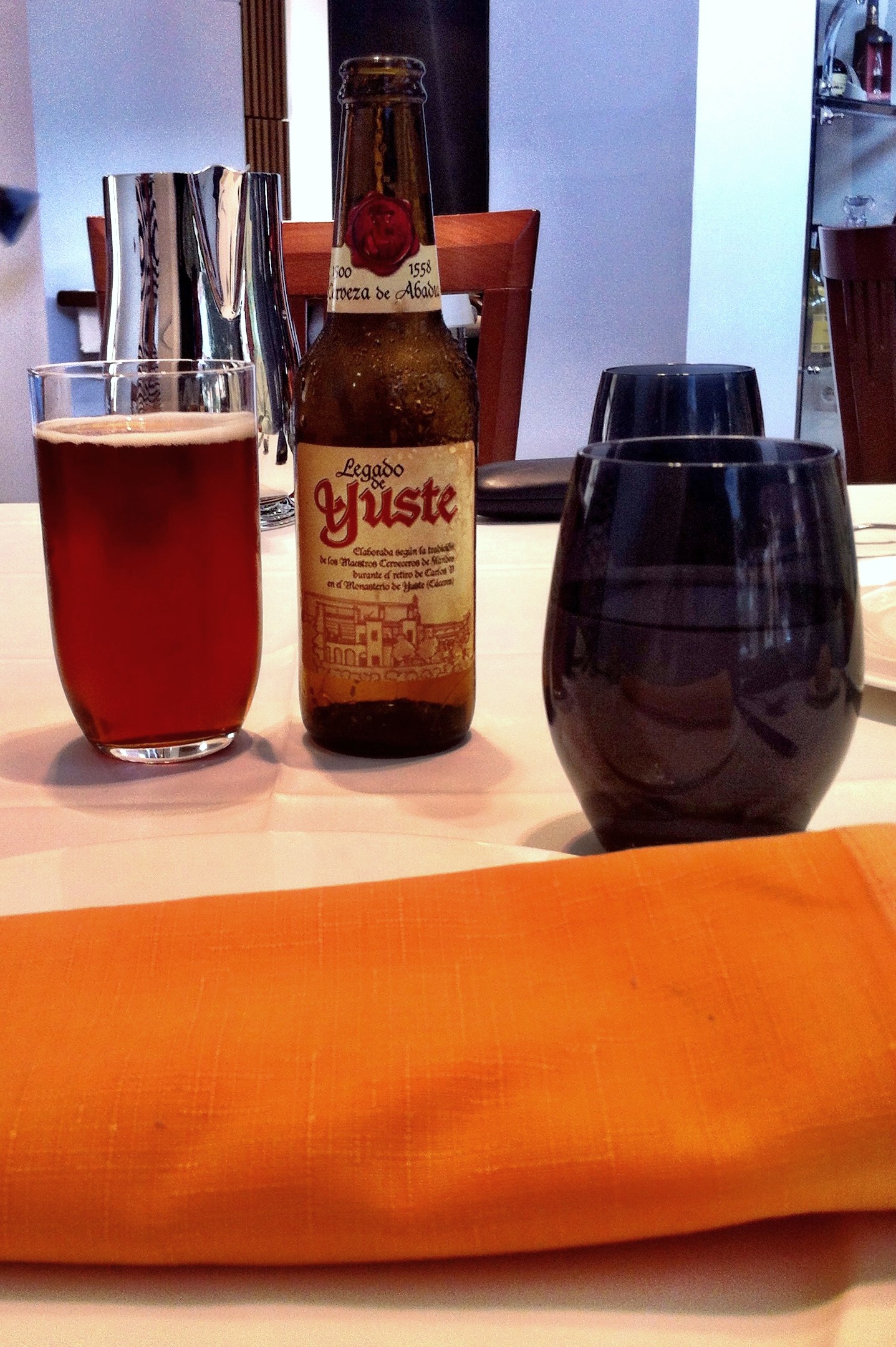 Dos menús degustación de diferente composición, ambos igual de sugerentes pero optamos por el que no incluía bebida ya que mis padres tenía aún ruta por delante. Yo sigo fiel a mi cerveza, en este caso una Legado de Yuste de estilo abadía belga, una lager de tono ambar sin demasiado cuerpo.