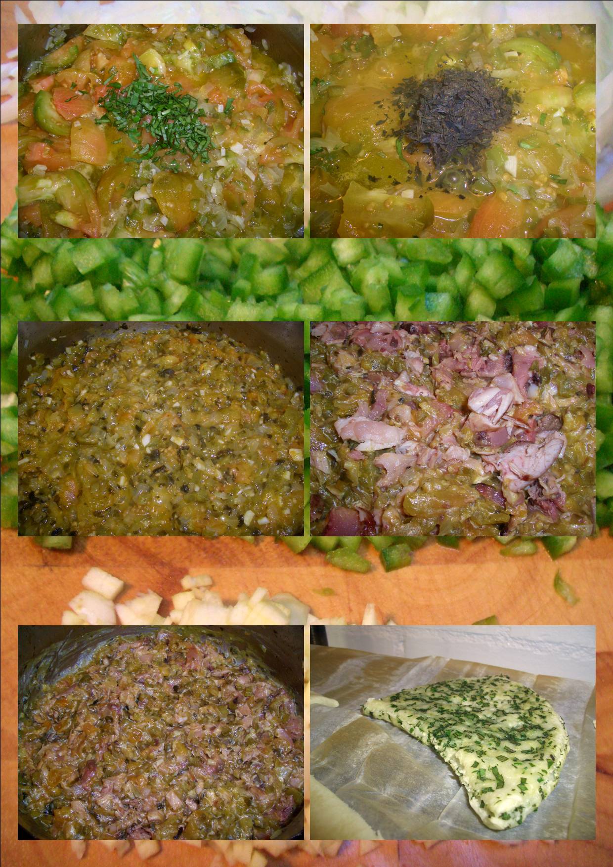 2 contra morros, 1kg de tomate verde Raf, 1 cebolla, 2 dientes de ajo, 1 pimiento verde, albahaca y cebollino fresco, masa de empanada, 20grs de alga wakame, sal y aceite de oliva virgen extra.