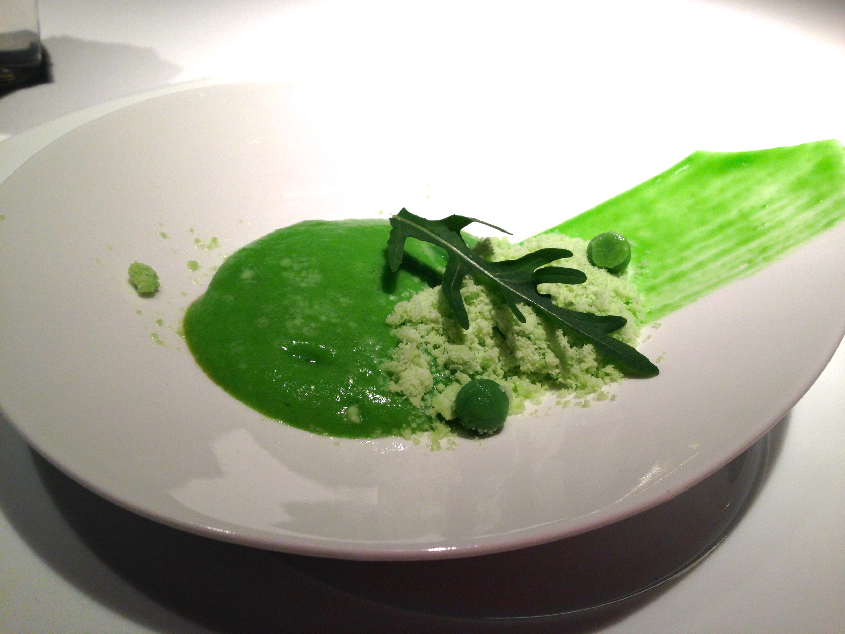 Guisantes falsos, cochinito crujiente y crema de guisantes. Nos encontramos ante unos guisantes en tres texturas que se compone de una tierra de guisantes, una mantequilla de guisantes y unos falsos guisantes de wasabi que cubren un crujiente de cochinillo.