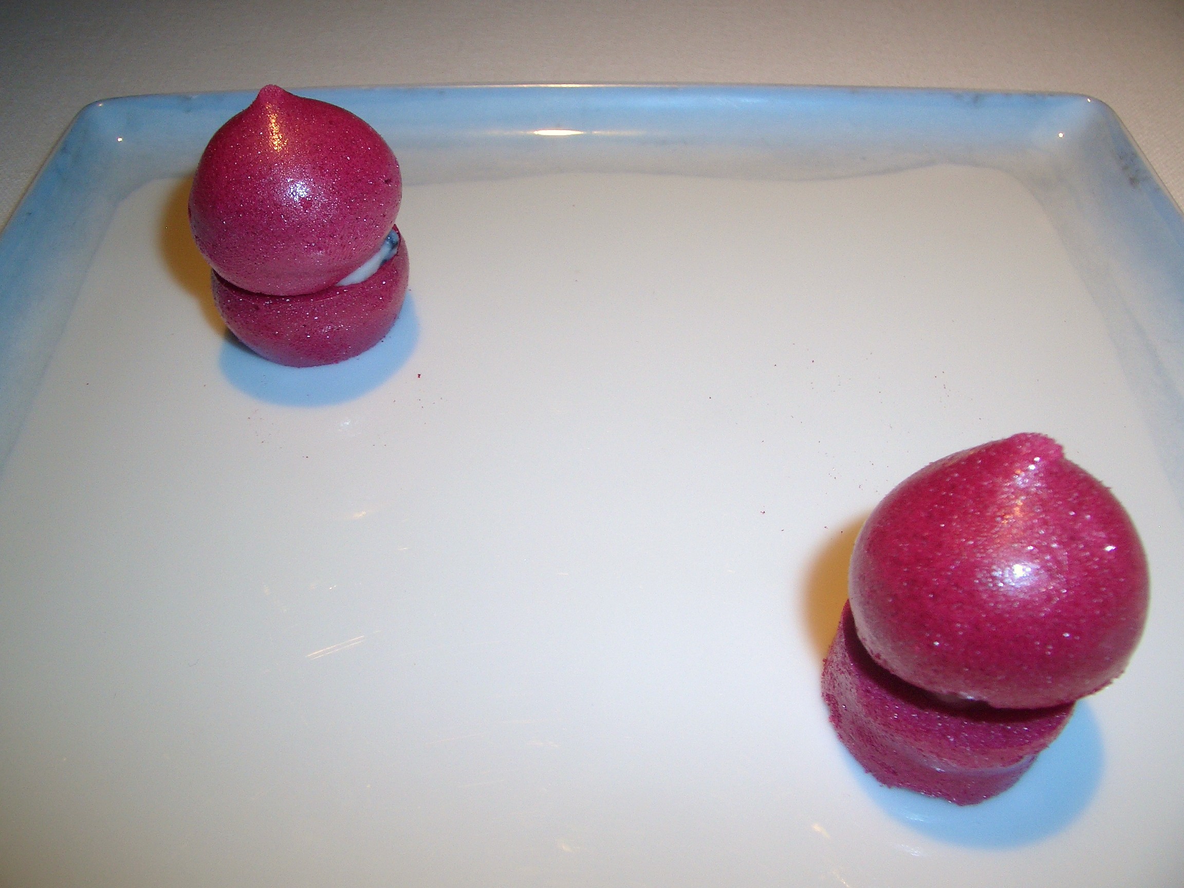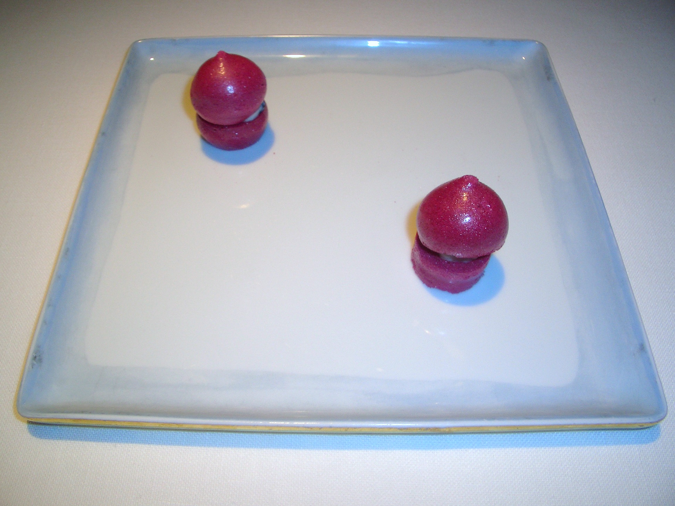 Comenzamos con un aperitivo formado por unos macaron de remolacha con apionabo y caviar.