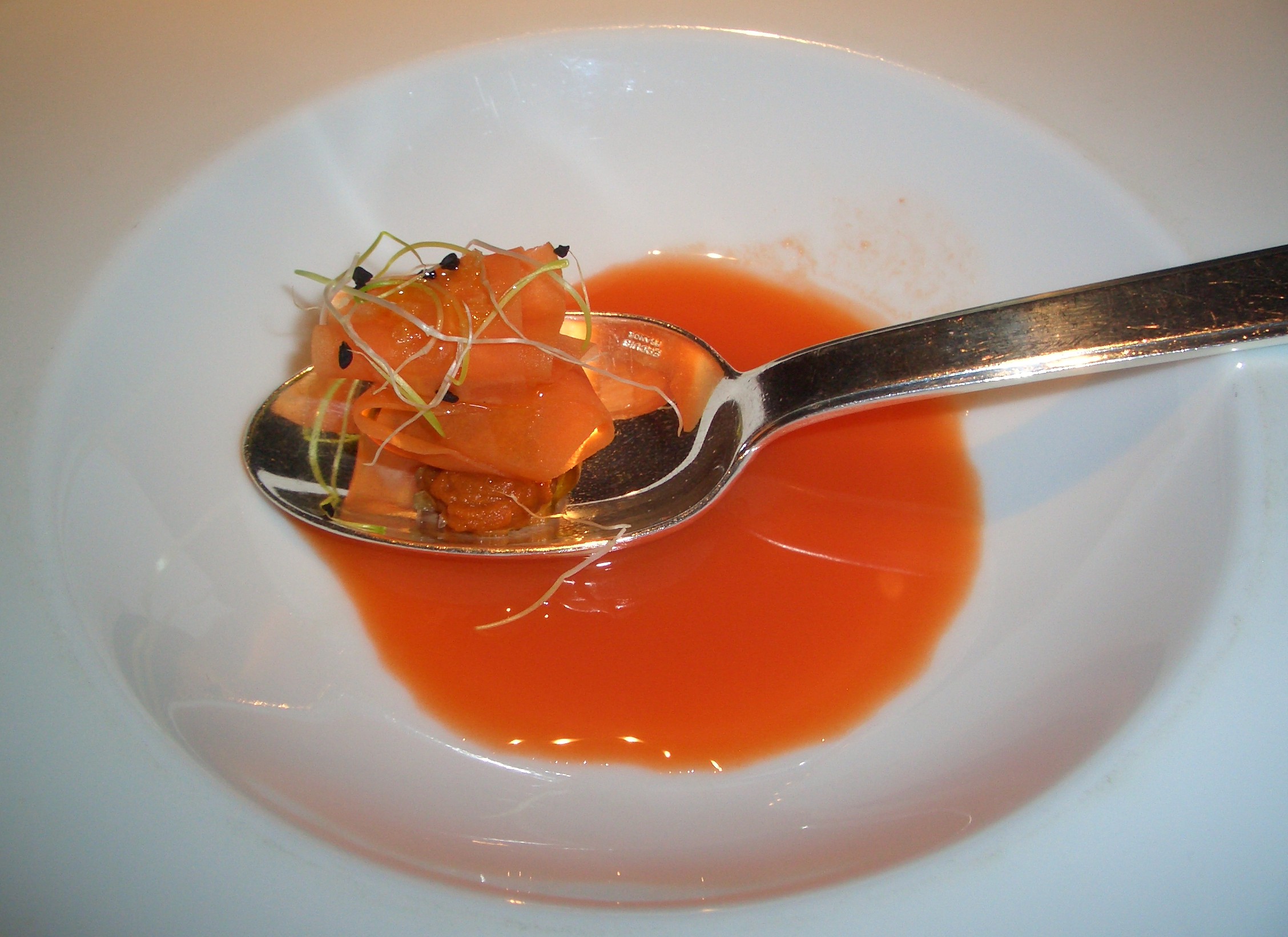Hasta la elaboración del artículo no me había dado cuenta del juego cromático y puede que Toño nos haya querido decir algo. El comienzo del viaje y a modo de semáforo nos advierte precaución con el naranja de la zanahoria, después nos da luz verde con los guisantes y después nos indica una pausa con el rojo del Bloody Mary en lo que podríamos denominar como entrantes.