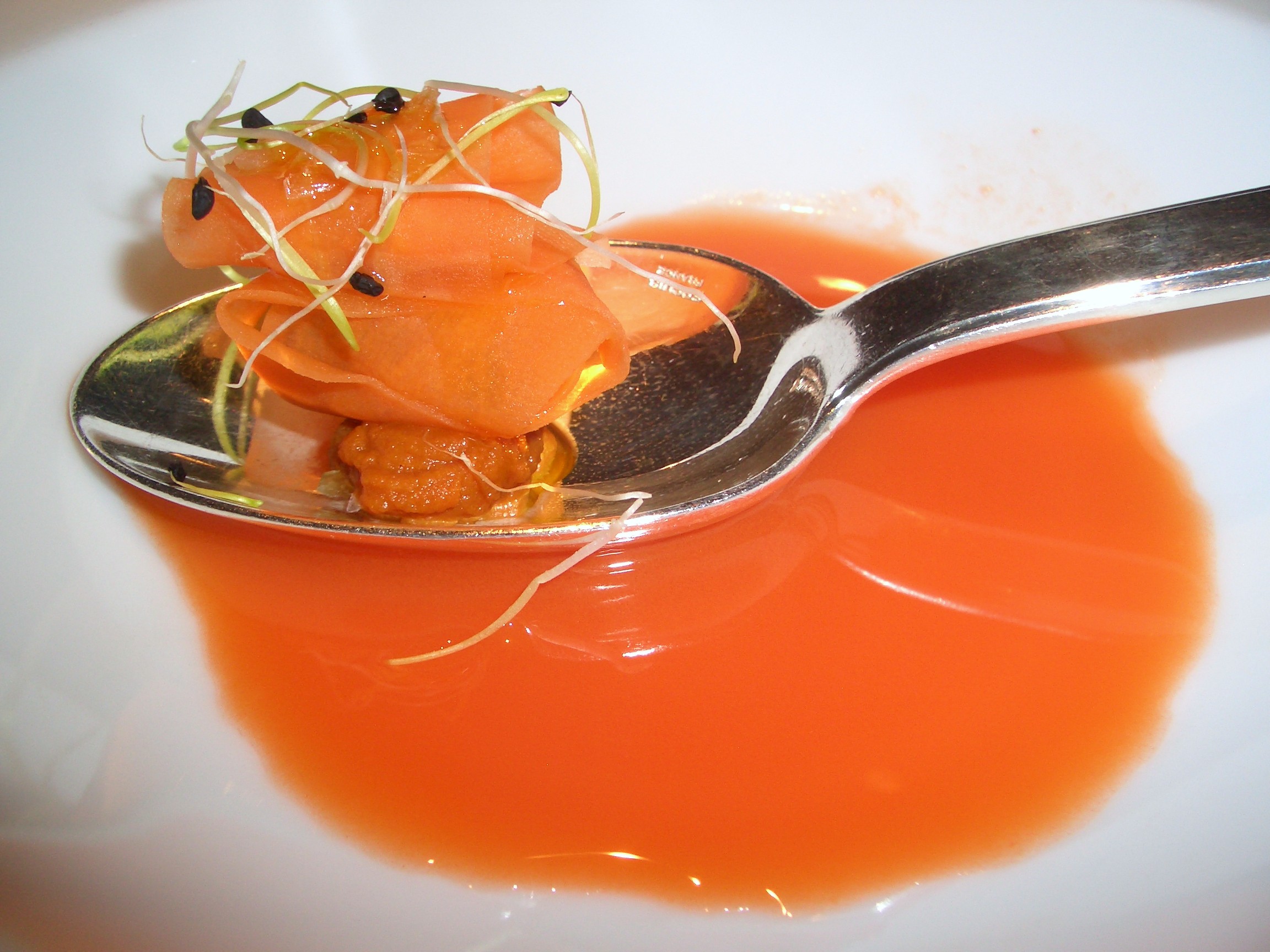 El inicio del menú propiamente dicho empieza con Zanahoria, con ortiguilla e hinojo. Se trata de un ravioli de zanahoria relleno de ortiguilla al que acompaña un caldo de zanahoria e hinojo.