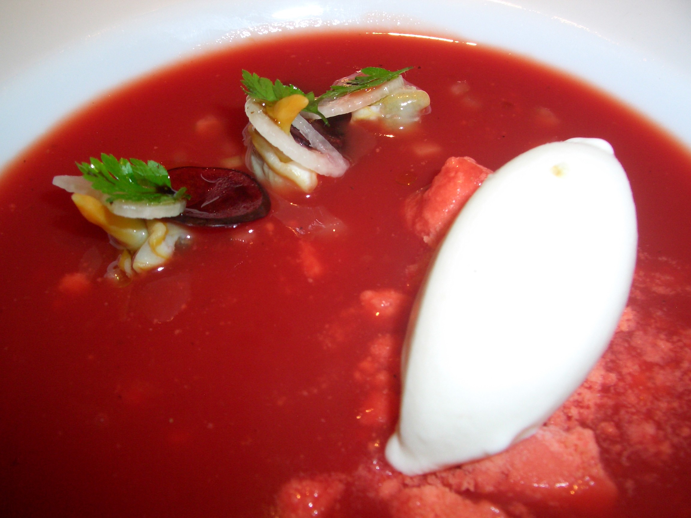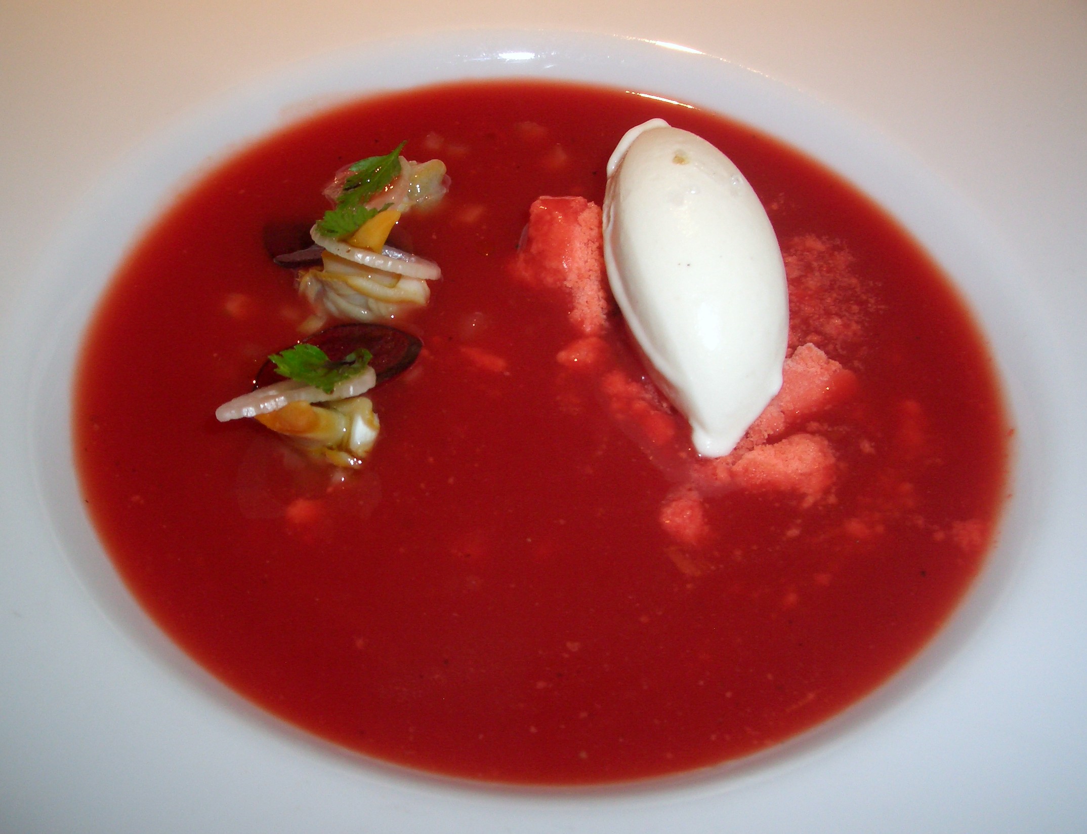 Bloody Mary, con helado de cebolletas. Lleva una tierra de tomate, berberechos y un sorbete de cebolleta a modo de islas en medio del mar rojo.
