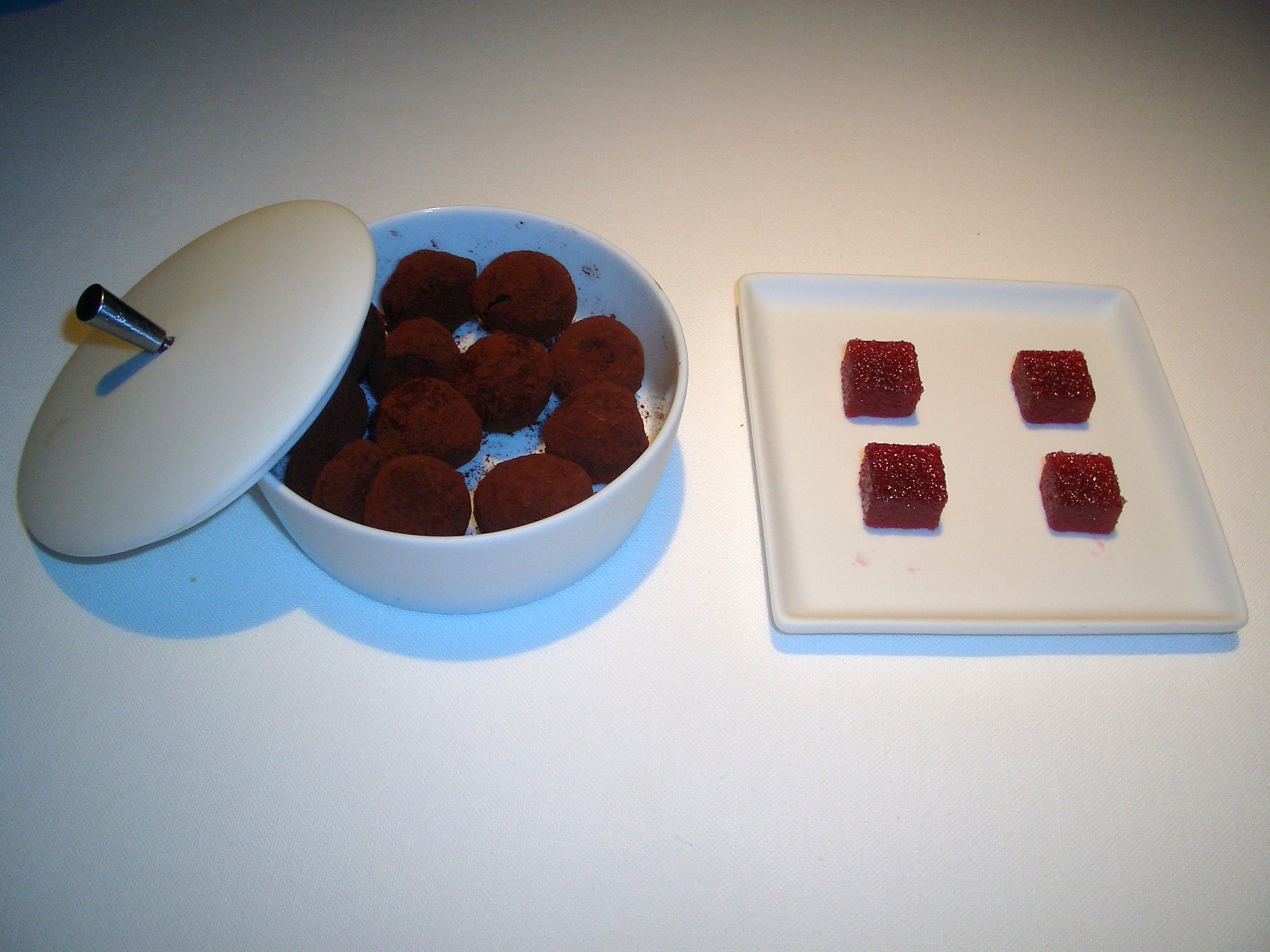 Quitamos la llave del contacto con un café y Las golosinas y entretenimientos de sobremesa. Mini magdalenas, macaron de limón, trufas y gominolas de frambuesa.