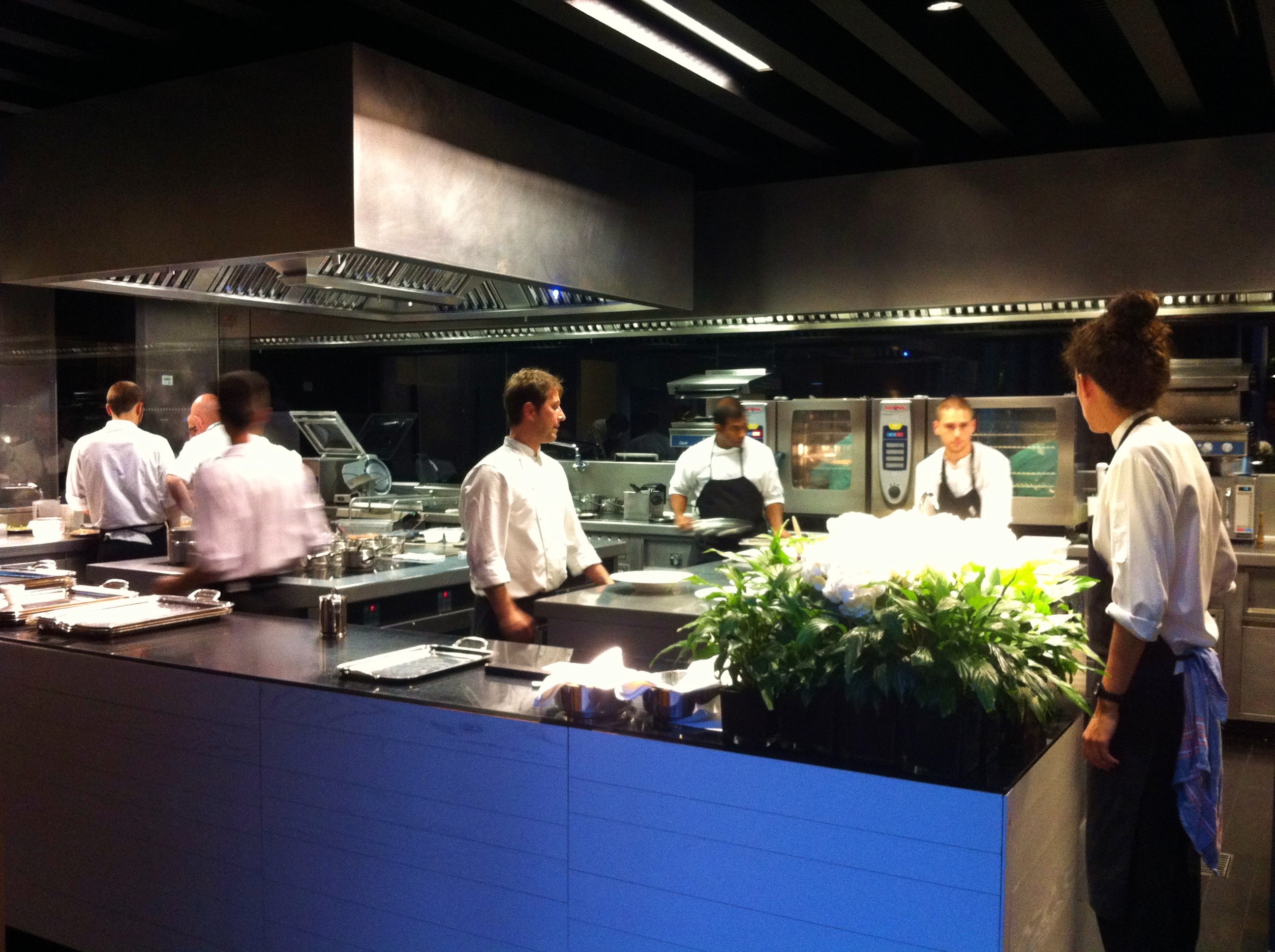 Llego con tiempo de antelación suficiente para poder tomar un aperitivo antes de cenar, la temperatura invita a disfrutar en su terraza de una cerveza bien fría. Mi inquietud hace que me asome a la cocina, ver como funciona la sala de maquinas es toda una experiencia, es una coreografía digna de los mejores ballet y al frente Toño, el bailarín principal, el Nuréyev de los fogones. En un momento dado vino José para invitarme a conocer la bodega algo que hice al final de la cena acompañado por Jesús, el responsable de presentarme y explicarme la mayoría de platos y con el que mantuve interesantes conversaciones.