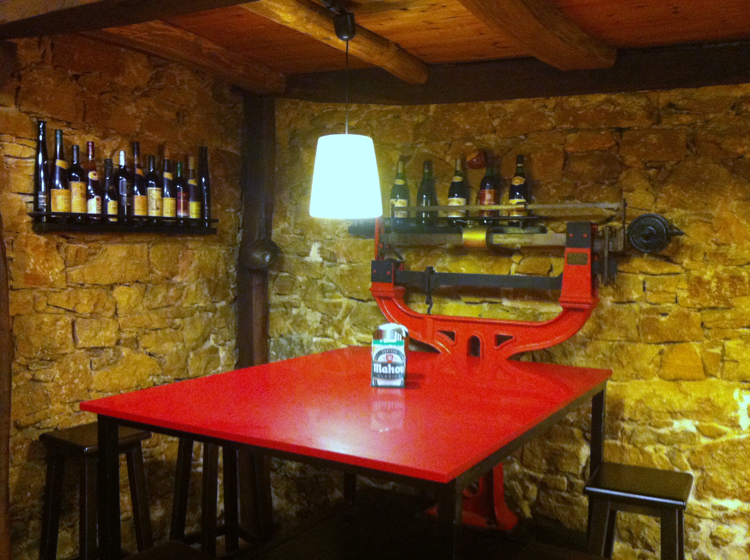 Esta mesa me gusta especialmente, me parece una belleza, haber reconvertido esta báscula industrial en parte del mobiliario es un gran acierto.