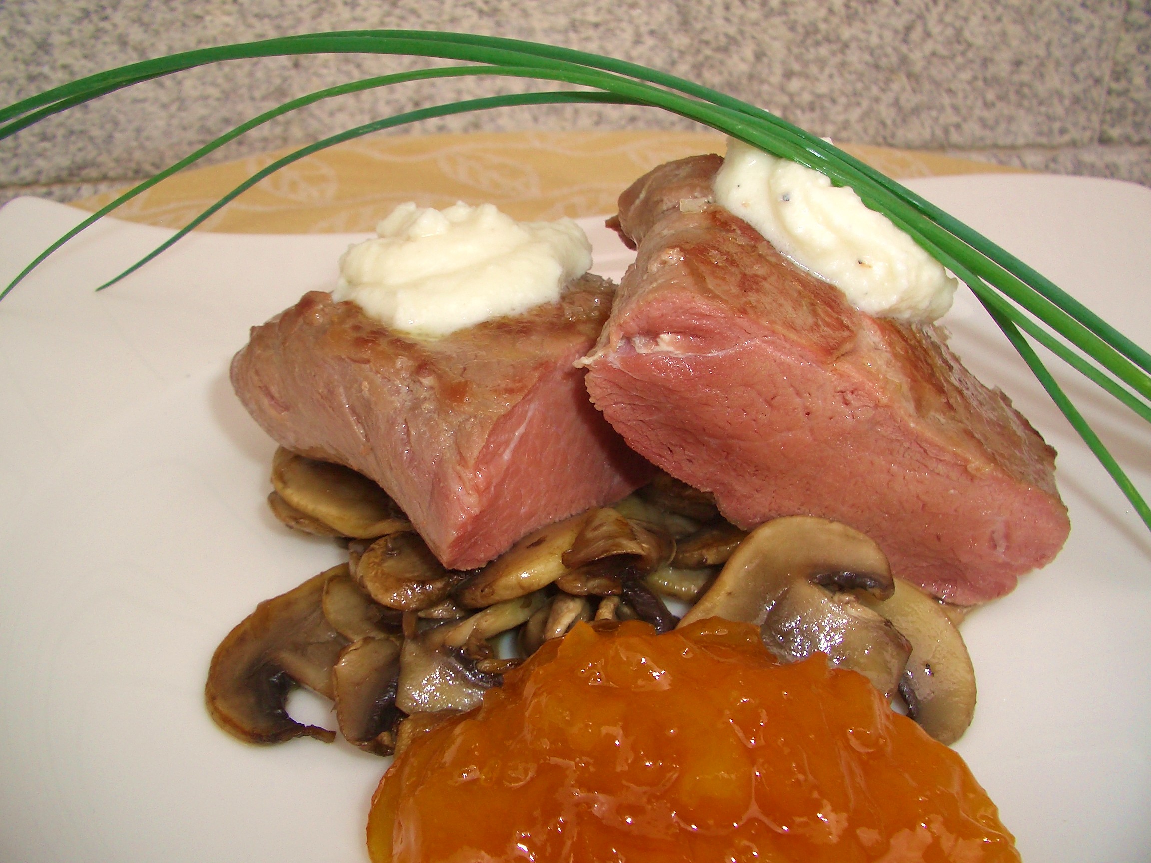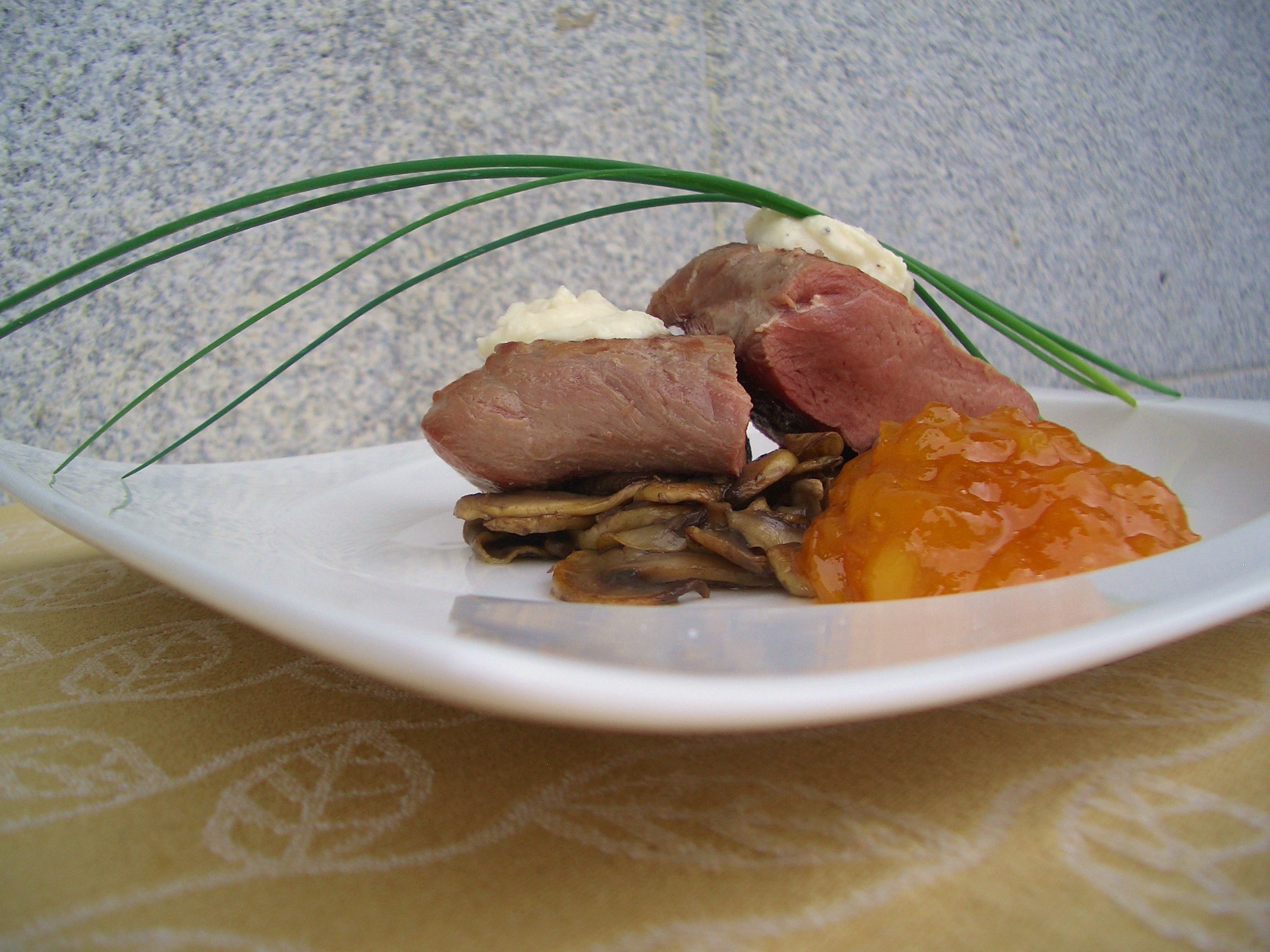 Cortamos el lomo a la mitad y lo colocamos sobre una base de champiñones, ponemos un poco de crema de queso en ambos trozos, decoramos con unas ramas de cebollino y la mermelada.