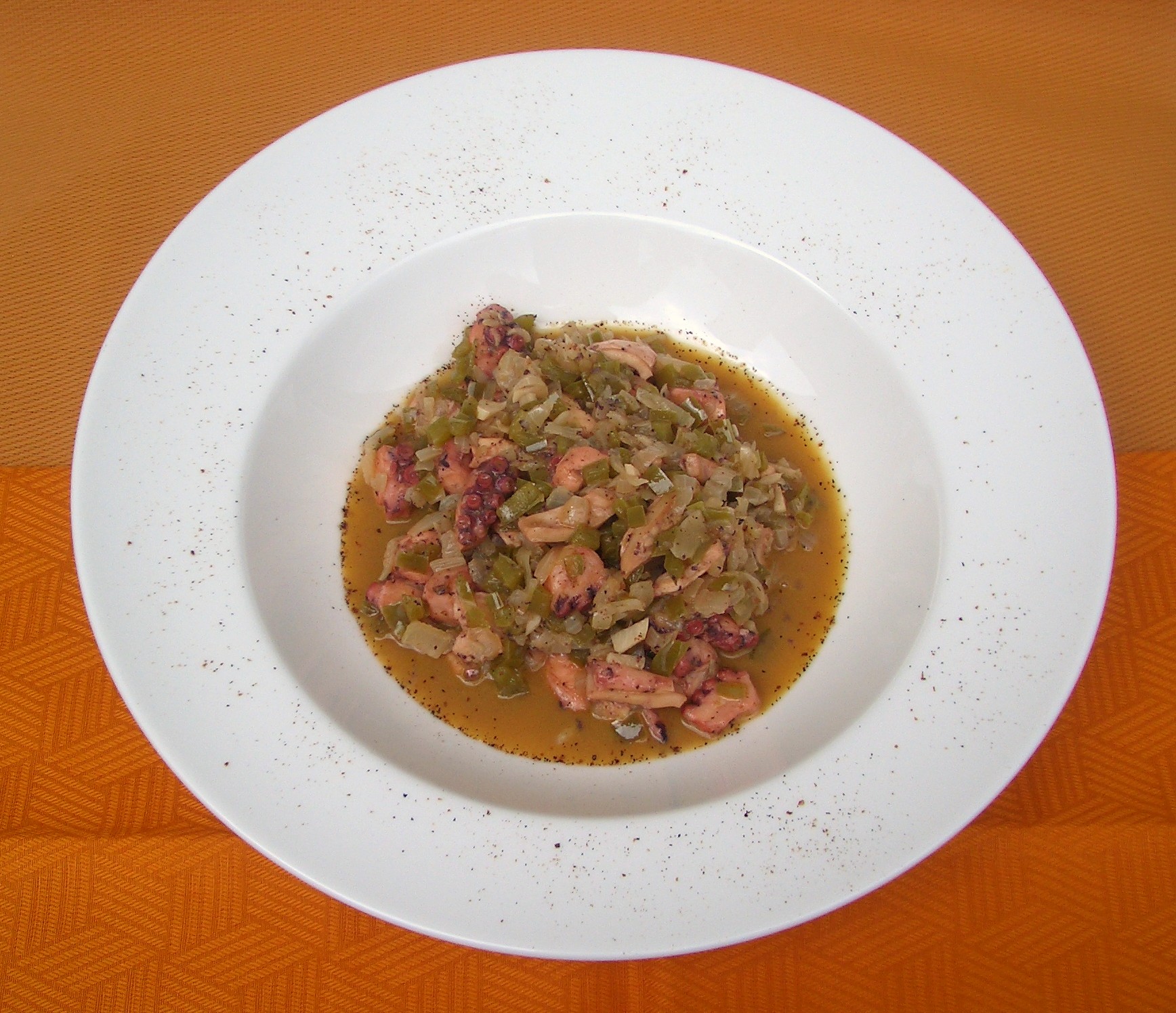 200grs de pulpo cocido, 1 cebolla, 1 pimiento verde, 1 diente de ajo, 1 rama de canela, 1 vaso de vino blanco (Albariño), 2 cuacharadas de vinagre, pimienta de canelo, sal, aceite de oliva virgen extra.
