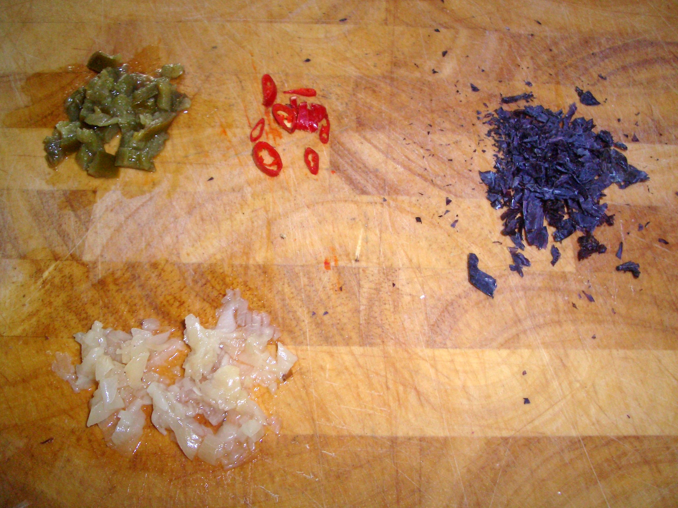 Para Japón preparé dos versiones ya que me parecía muy recargado meter todo en una y además no tenía sake que sin duda hubiese utilizado. La primera lleva soja, alga nori y wasabi en polvo. La segunda, va con soja, alga nori y shichimi togarashi.