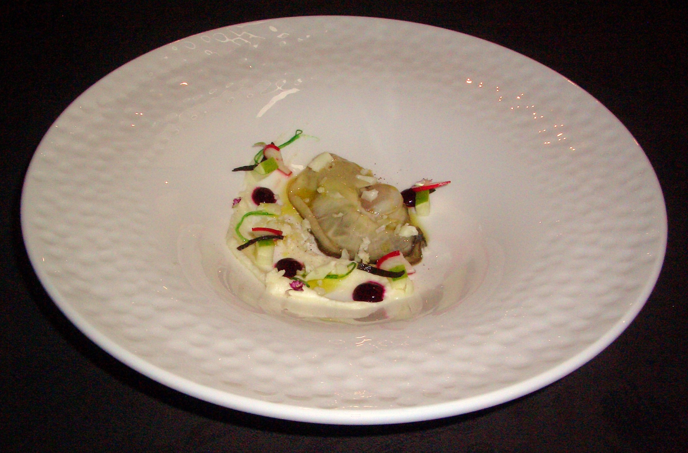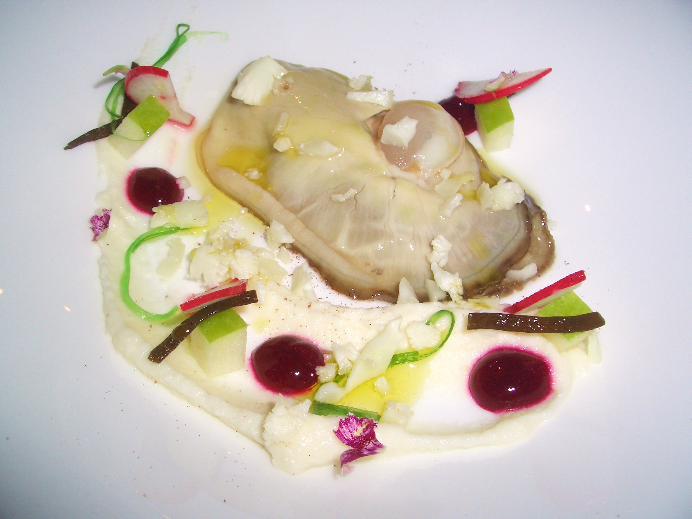 Comenzamos con una magnífica en tamaño y sabor ostra del Éo con coliflor en texturas, algas wakame y lechuga de mar y una emulsión de remolacha.