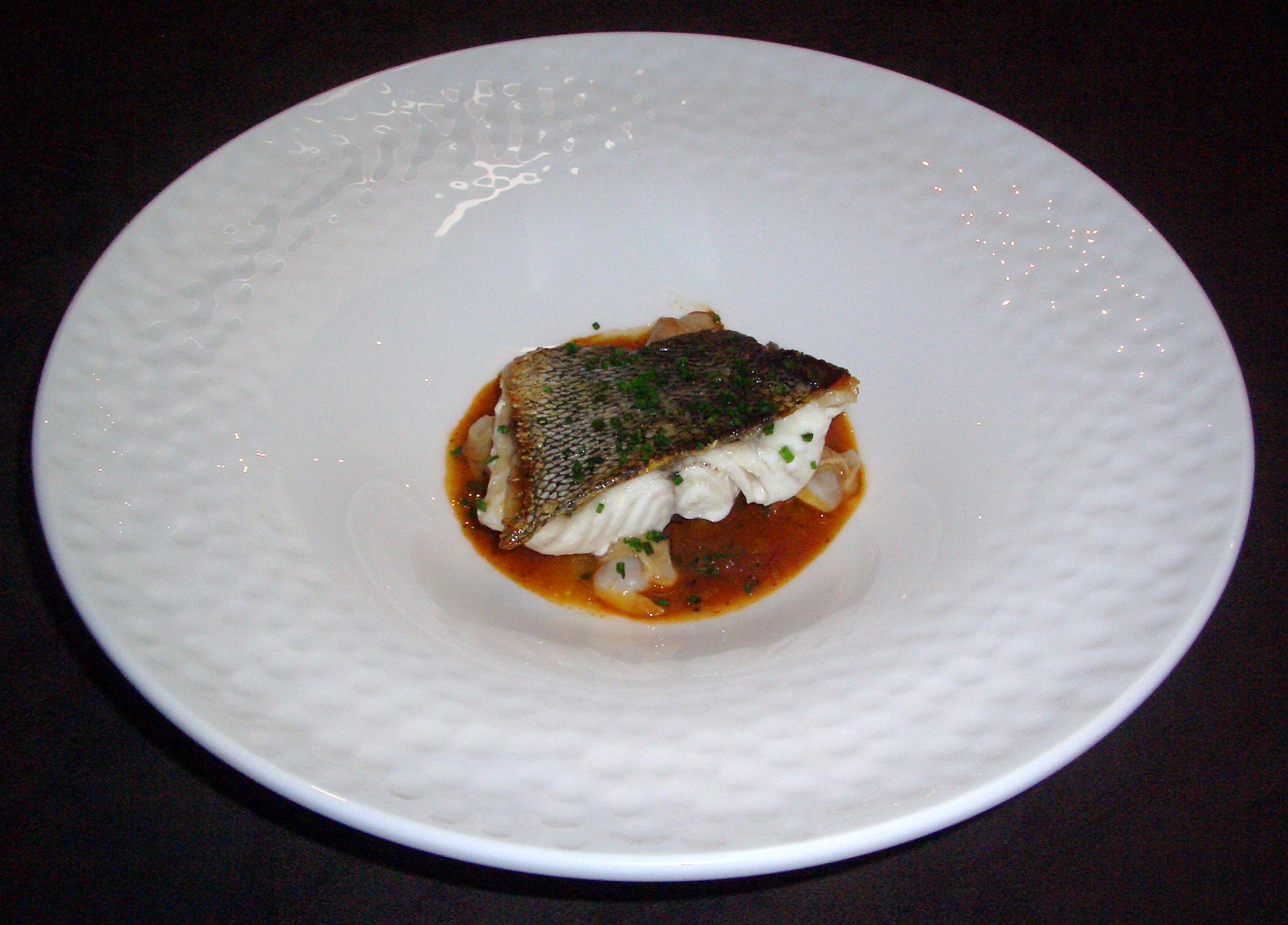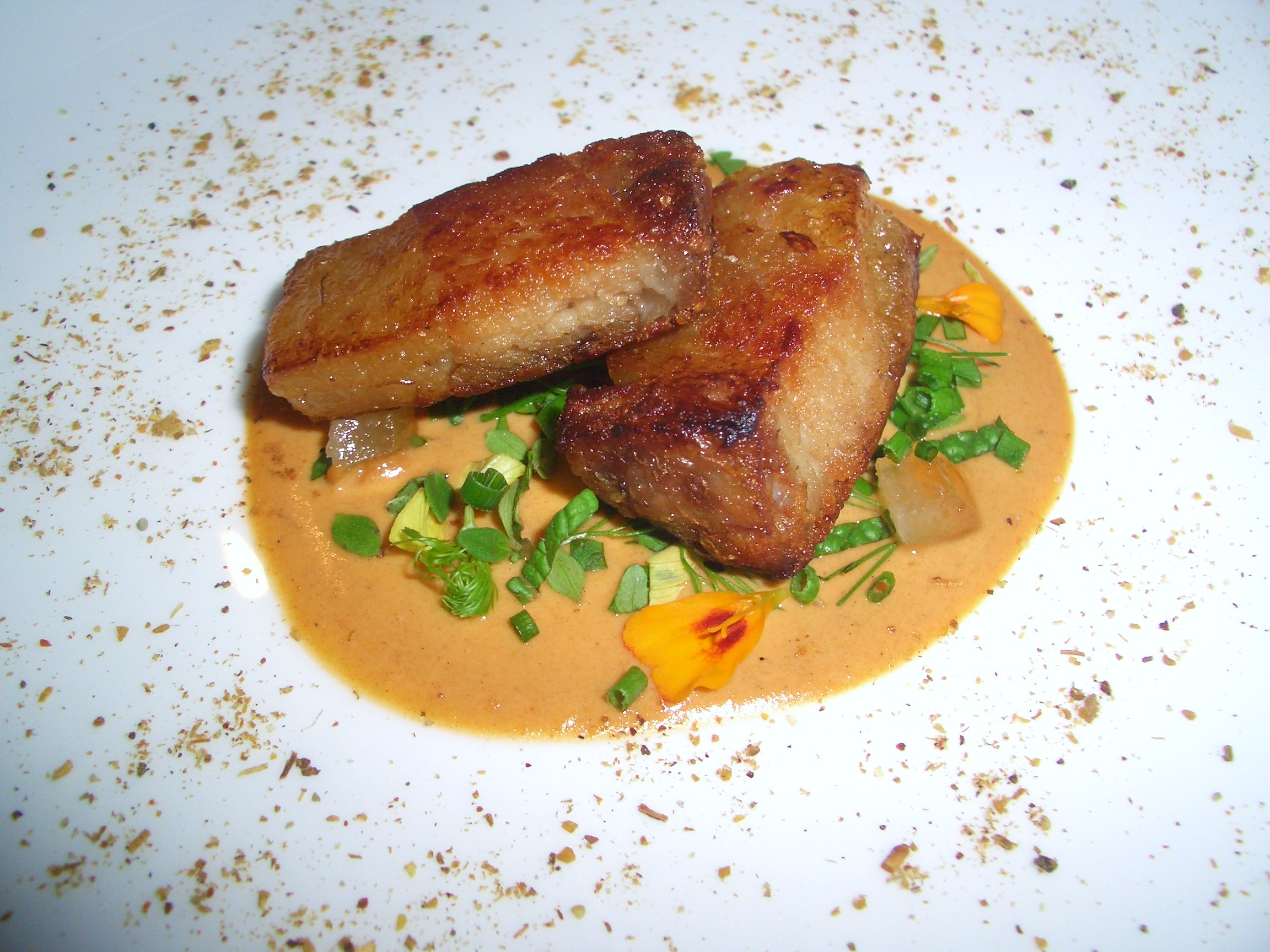 A continuación una base de emulsión de mejillones en escabeche con hierbas (hinojo, cebollino, menta, albahaca, eneldo y tomillo), confitura de limón, sobre la que se acuesta una papada de cerdo cocida de manera tradicional, enfriada y pasada por sartén para dar el toque crujiente.