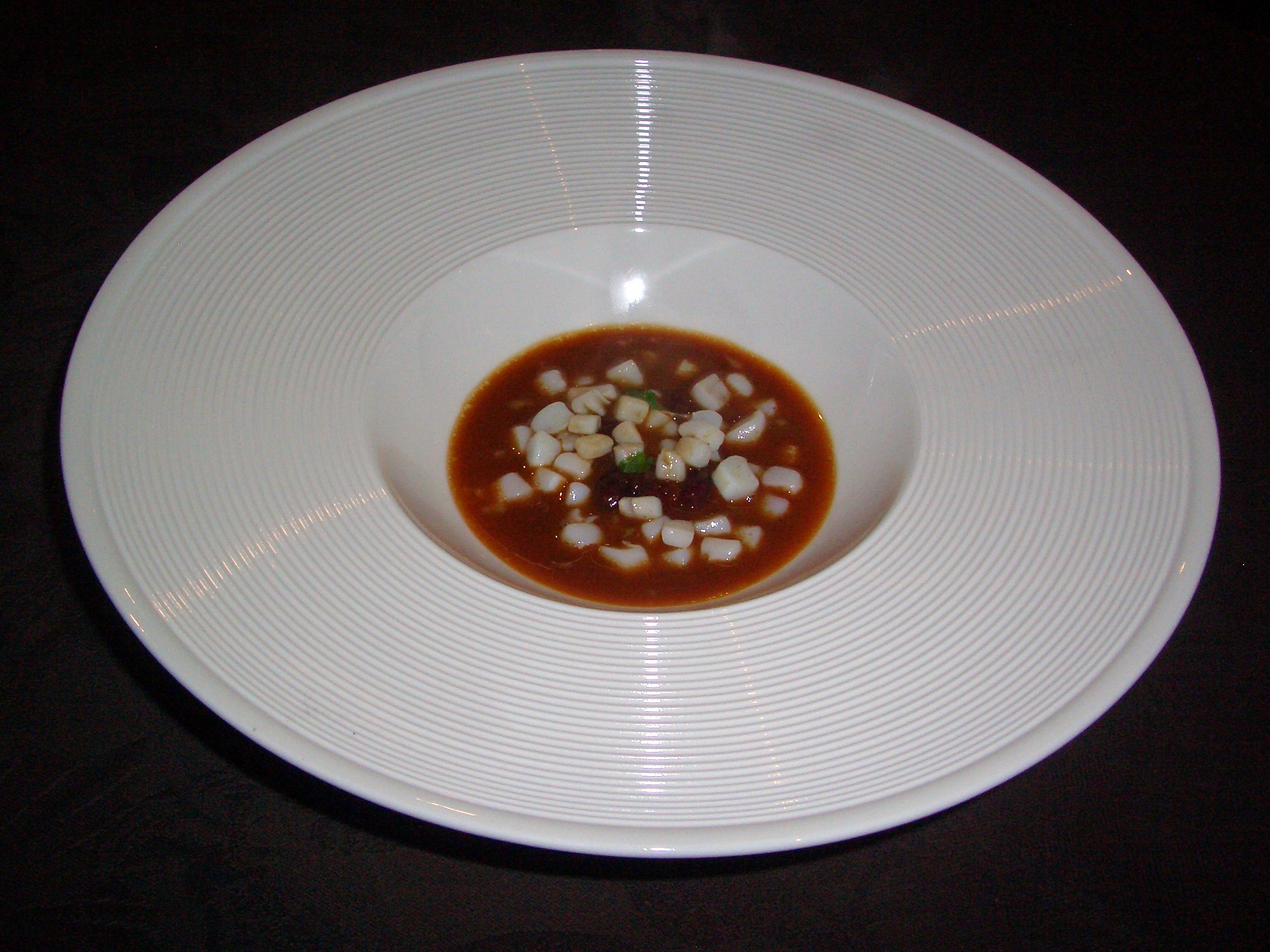 Turno del calamar con jugo de fabes rojas y vinagreta de chíles dulces y picantes. El jugo se sirve en jarra y tiene una potencia de sabor increíble que con los matices dulces y picantes del chíle hacen que resalte el calamar al dente.