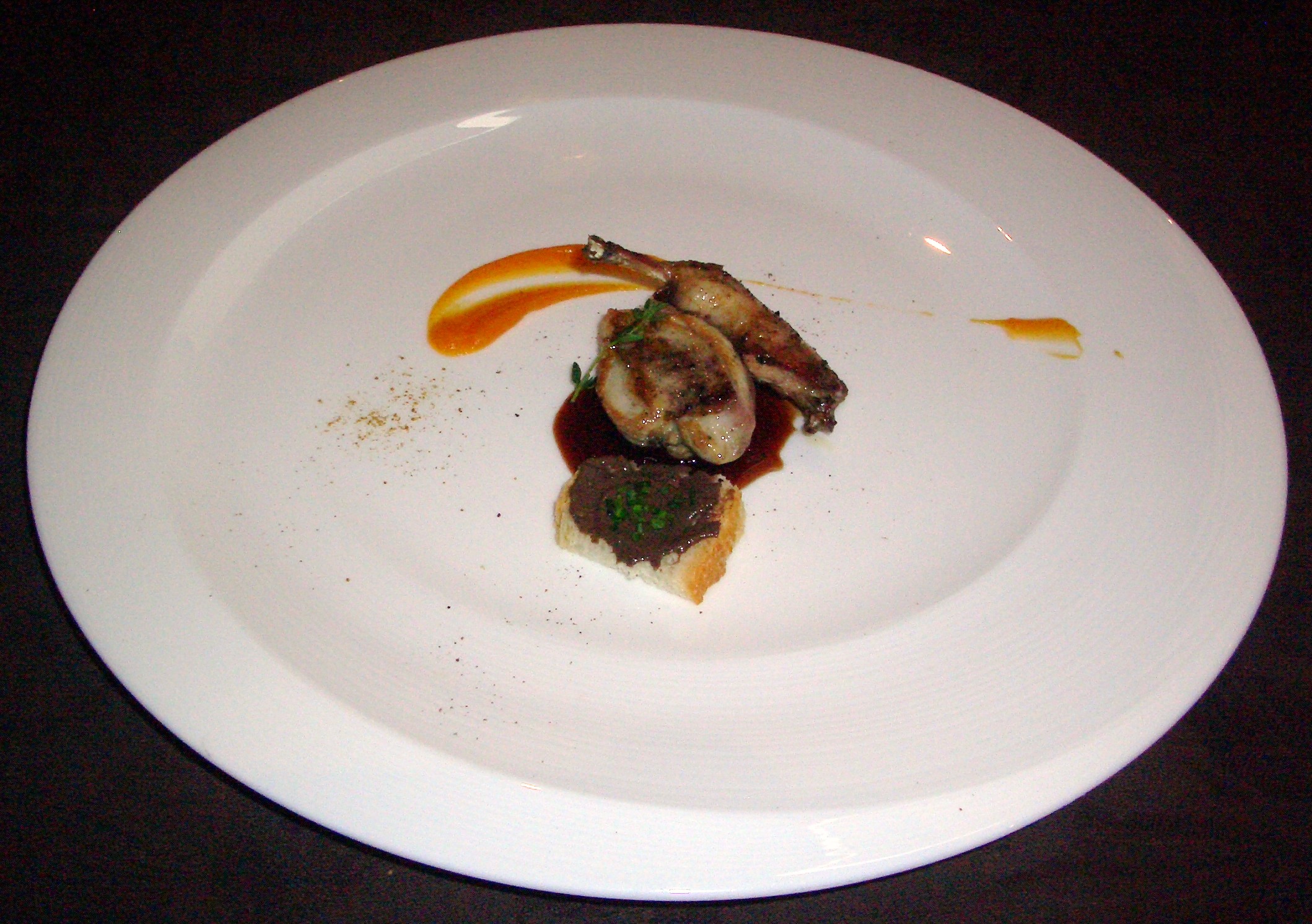 Terminamos con una codorniz royal, puré de boniatos y tosta de sus higaditos. Marinada en especias variadas y con una salsa de jugos reducidos y filtrados tiene un punto sonrosado con mucho sabor.