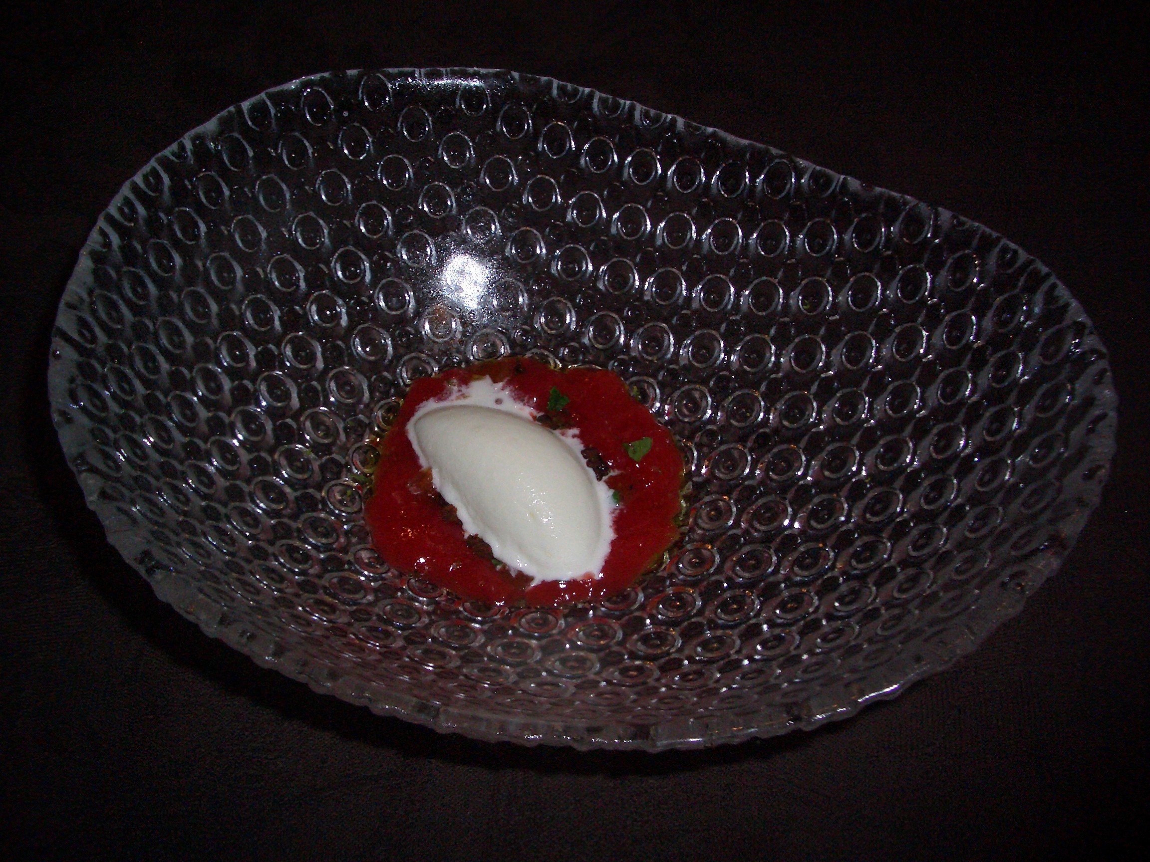 Con los postres tengo la extraña sensación de no saber cual de los dos era el más refrescante. Comenzamos por el tocinillo, maracuyá, mango y naranja sanguina que equilibraba muy bien el dulce del tocinillo con los ácidos de las frutas en diferentes texturas.