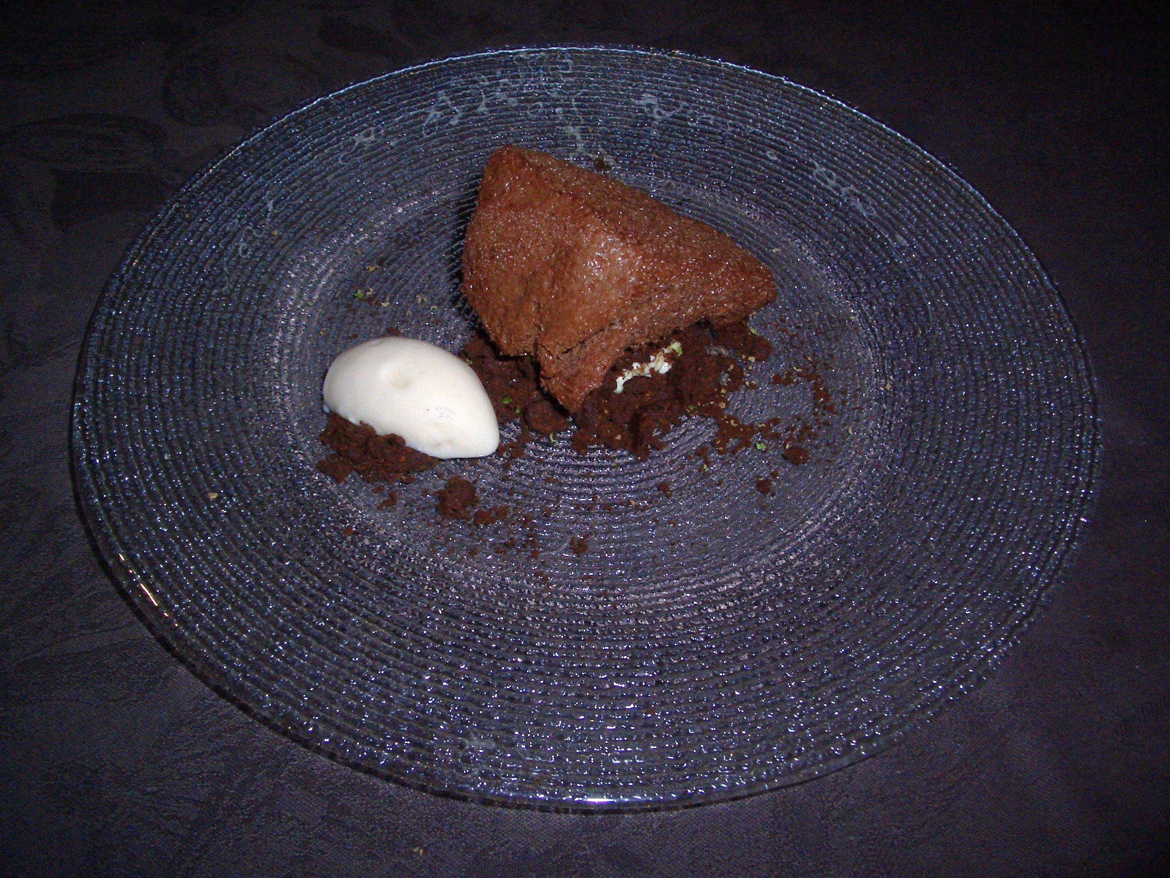 Concluye el menú con un «bizcocho» de chocolate muy especial, al meterlo en la boca se funde al instante y el aspecto de postre pesado deja paso a la sutileza de una especie de mousse, va con unos frutos secos y plátano ácido.
