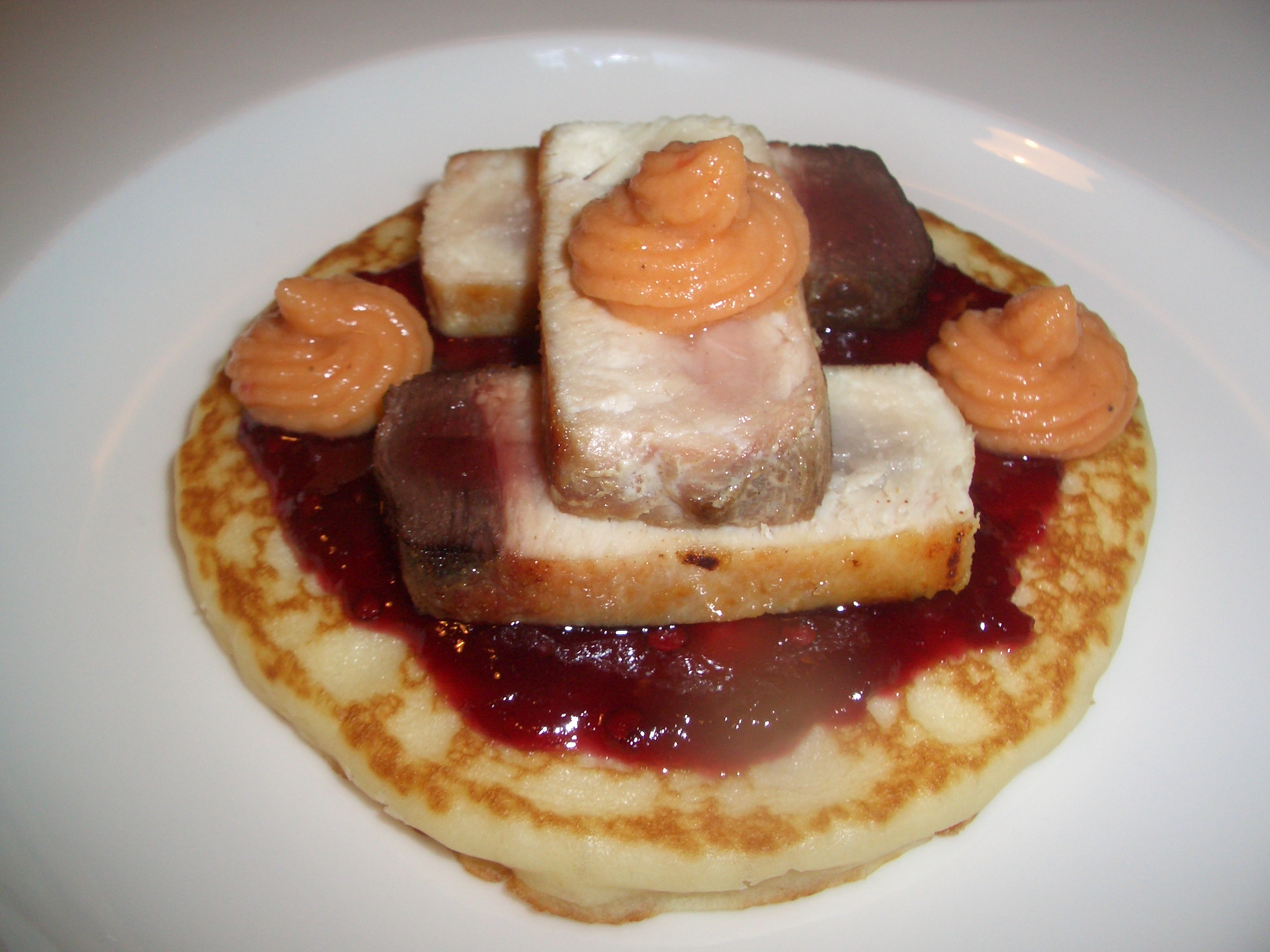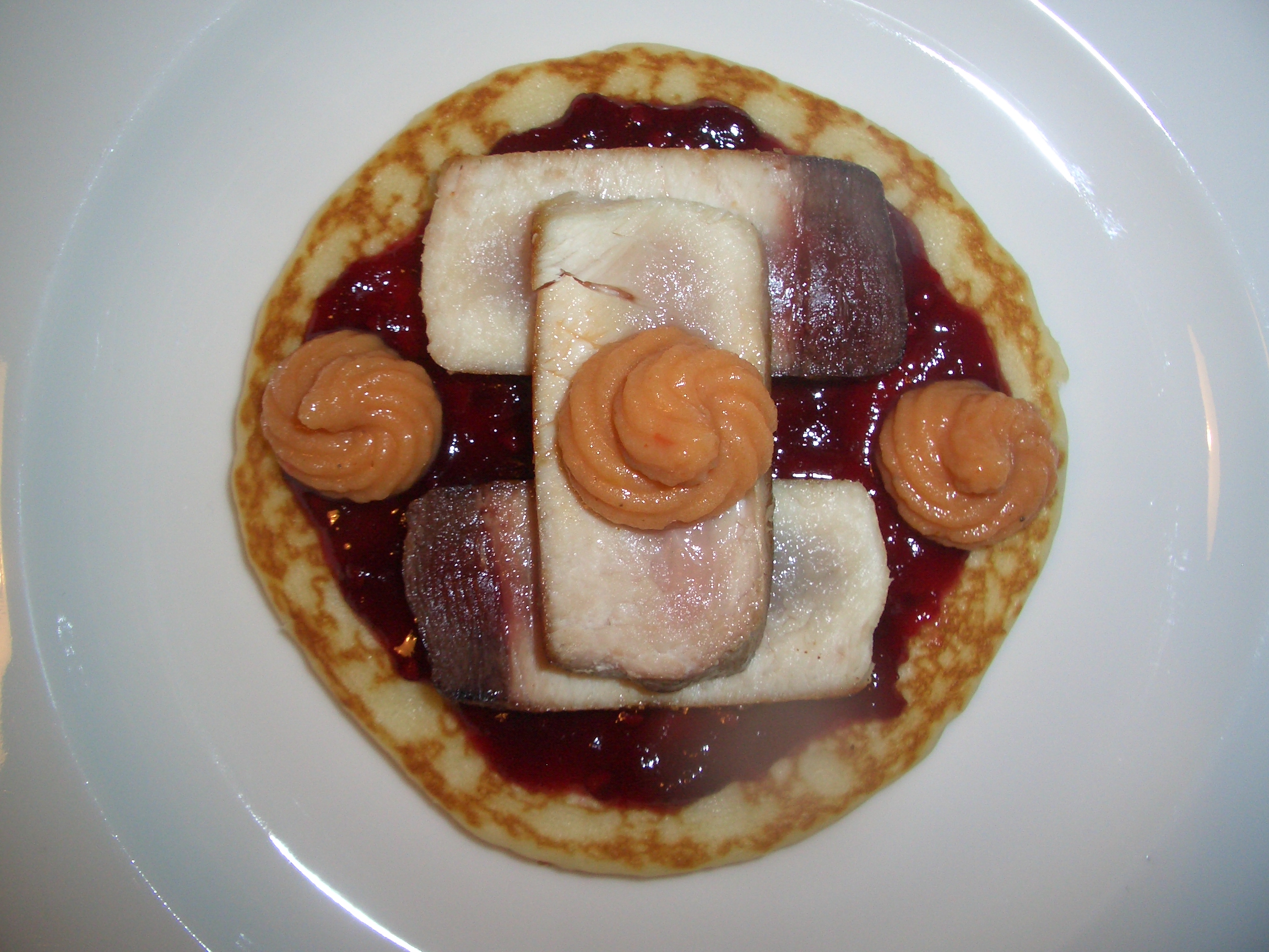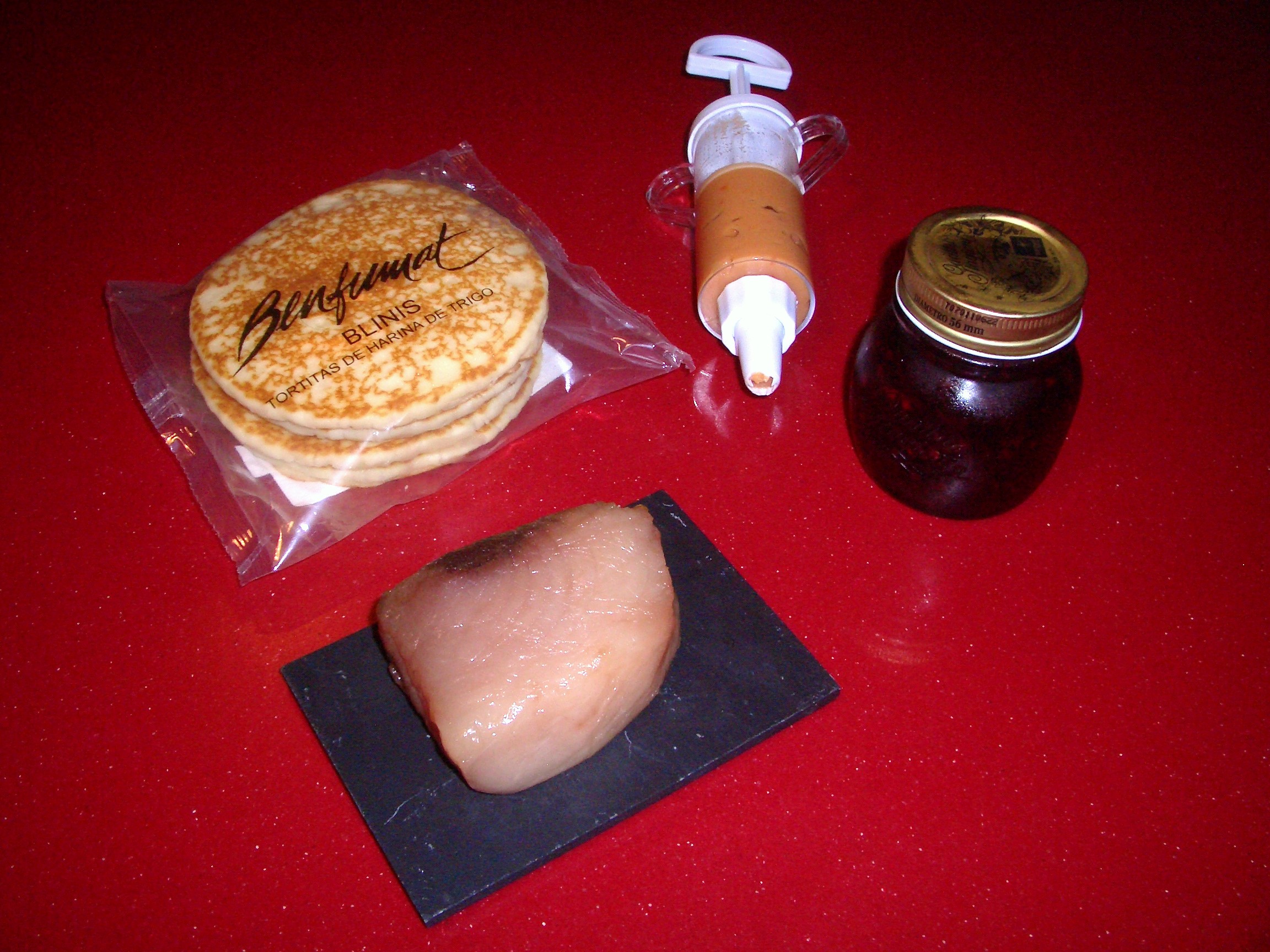 Primero pensé en unos blinis que para los que no lo sepáis es una tortita fina (especie de Crêpe) de origen principalmente eslavo a base de harina, huevos, leche y levadura que puede comerse cocida en el horno o frita, con o sin relleno alguno. Los blinis sirven como base para diferentes tipos de pescados ahumados (salmón, arenque, trucha, esturión); crème fraîche (nata agria) y huevos de pescado, y se acompañan con té de hierbas, compota o con vino o cava. La bebida depende del tipo de relleno.
