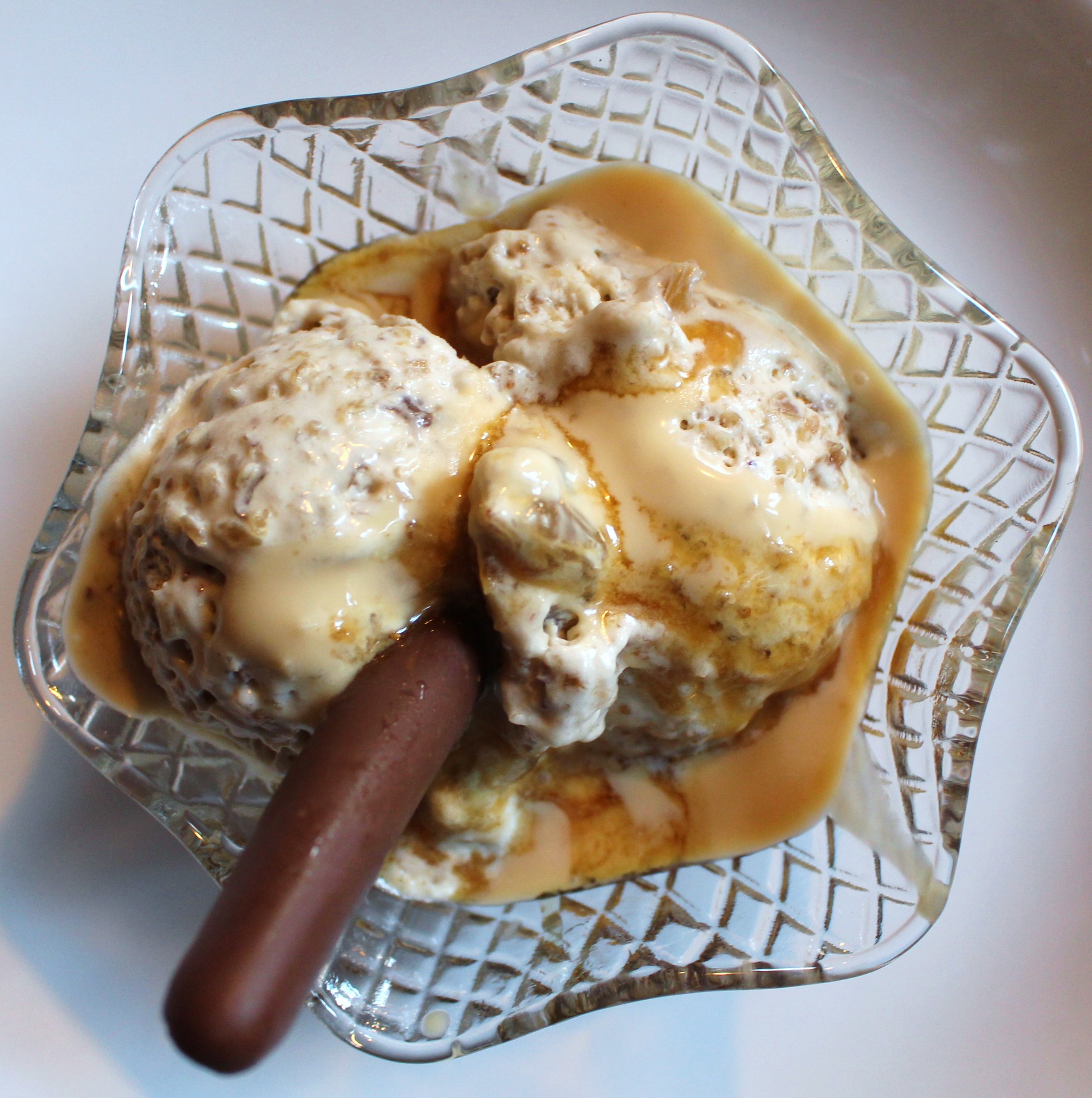 ¿Postre?, pues va a ser que sí. No soy nada llambión (goloso) pero desde que leí la carta tenía claro que debía probar ese flan de castañas «Michigrin». Viene acompañado de un par de bolas de helado de mandarina para hacer más llevadera la densidad del flan al que atacamos y ofrece resistencia a la cuchara. Mejor no pensar en las calorías.