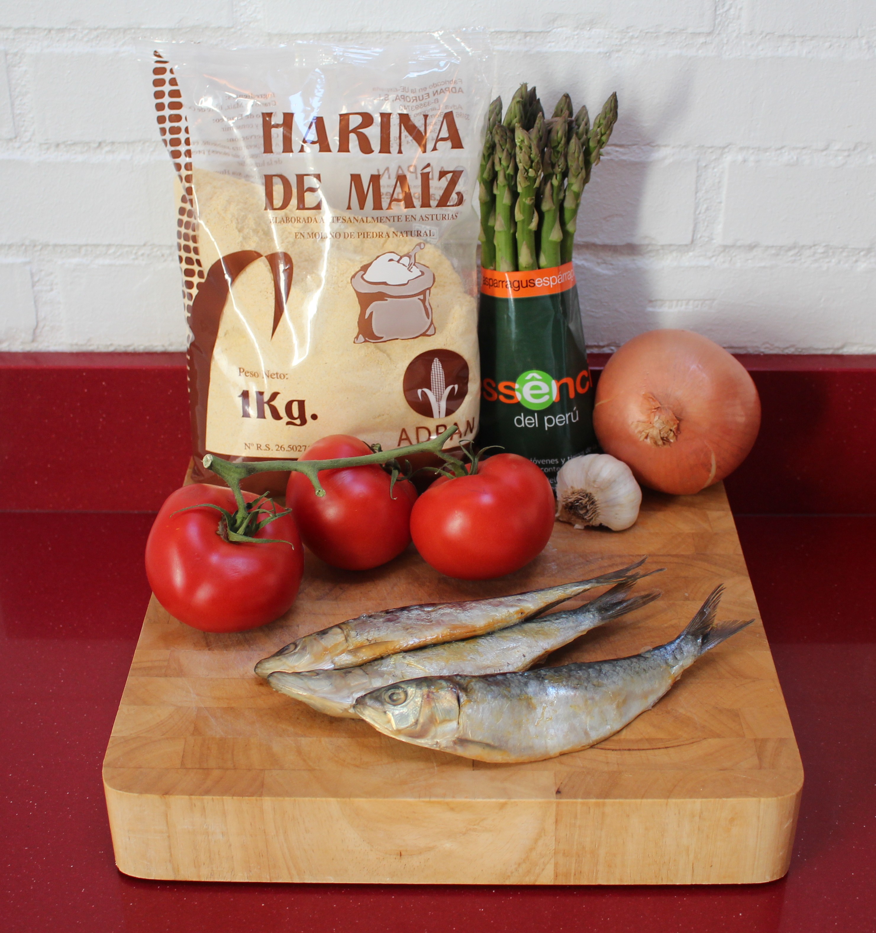 1/2 docena de sardinas salonas, 1 tomate, espárragos trigueros, 2 dientes de ajo, 1/2 cebolla, 250grs de harina de maíz, agua, sal y aceite de oliva virgen extra.