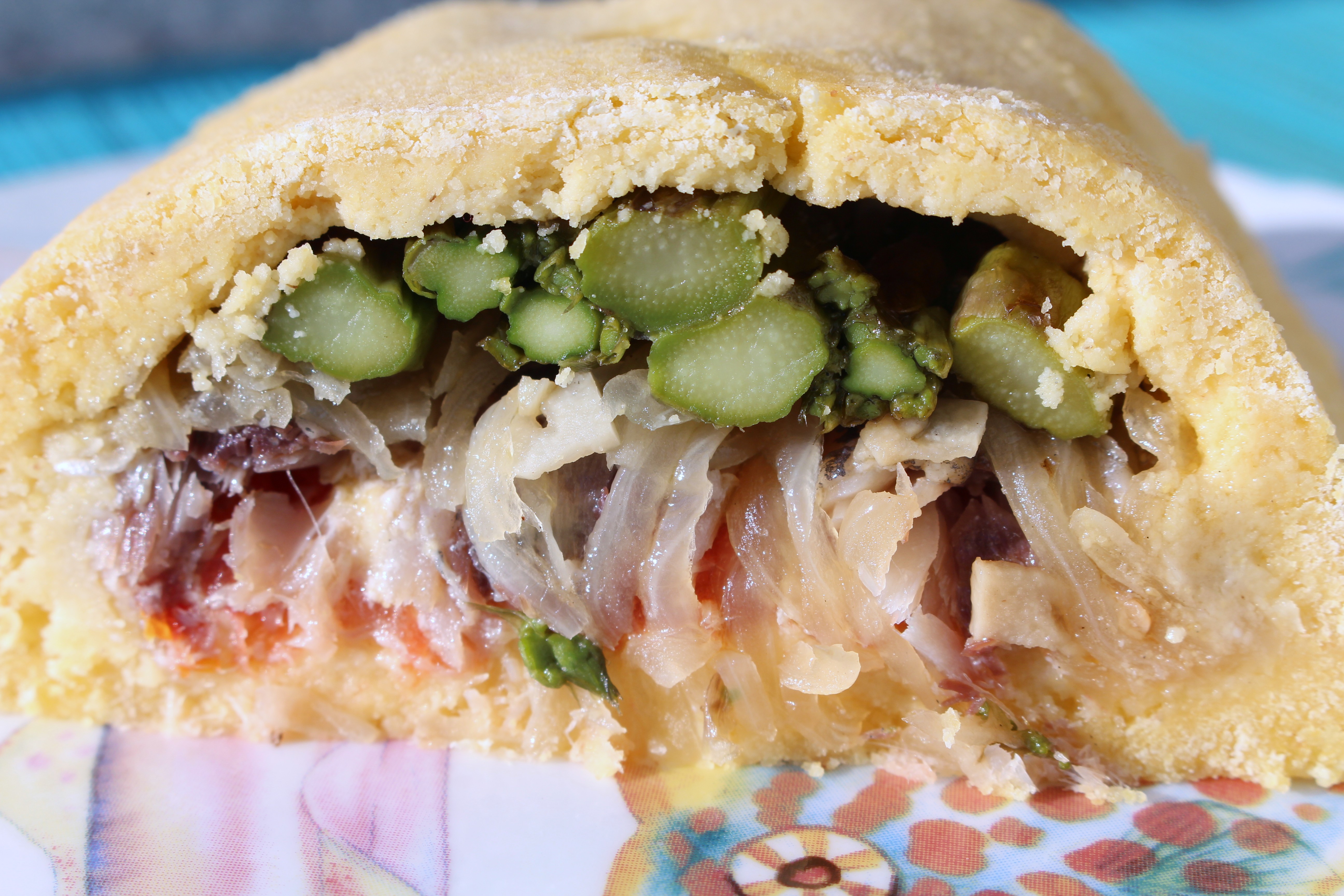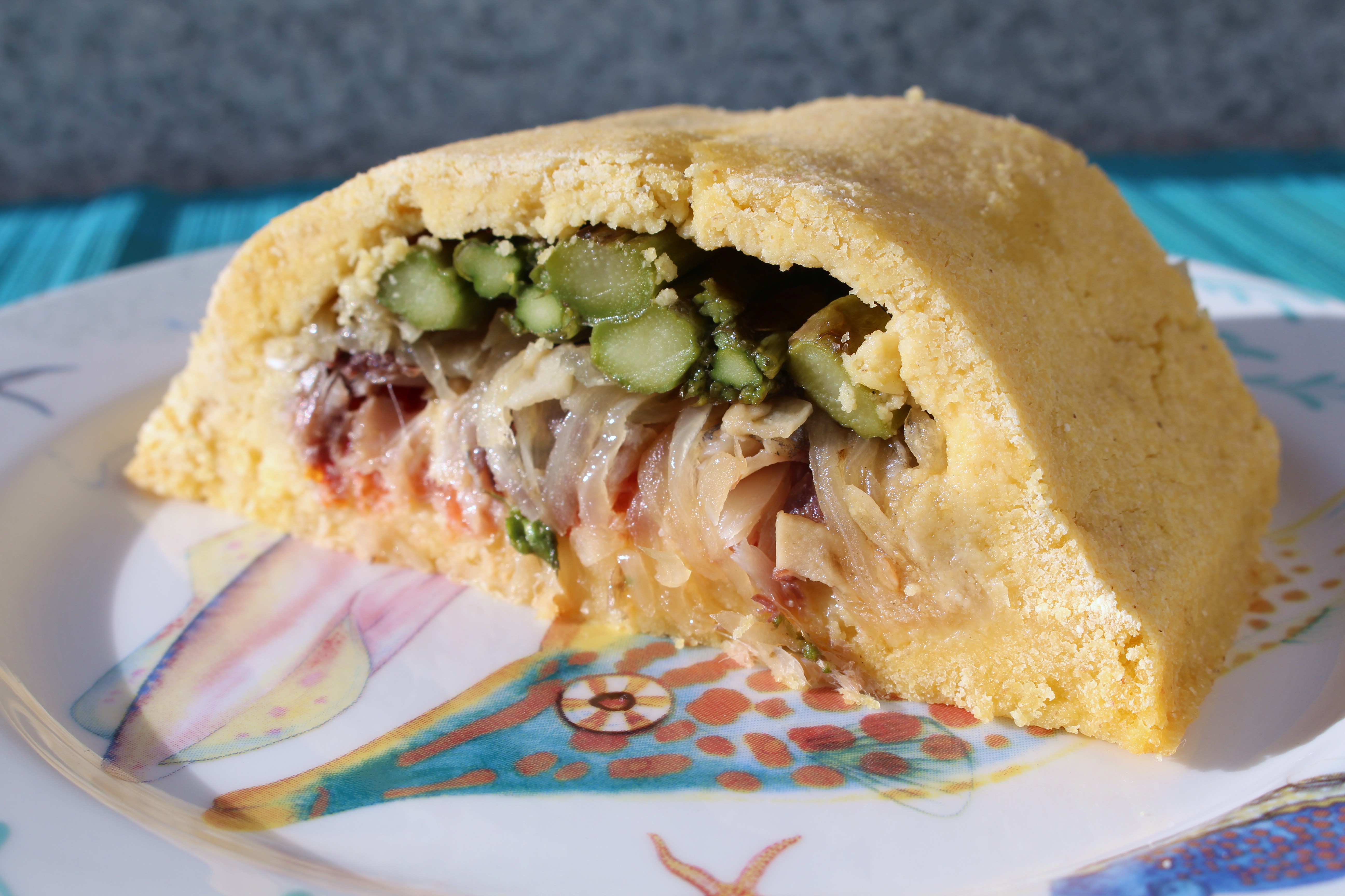 Preparamos la otra mitad con el mismo procedimiento y tapamos, procuramos cerrar bien los bordes para que se concentre todo el calor en el interior y no se escapen los jugos. Con el horno precalentado horneamos a 160º una media hora, podéis comprobar que se va haciendo cuando se va secando. No añadí levadura por lo que no subirá como si fuese un pan, no queremos una masa demasiado gruesa ya que nos puede cansar al comerla.