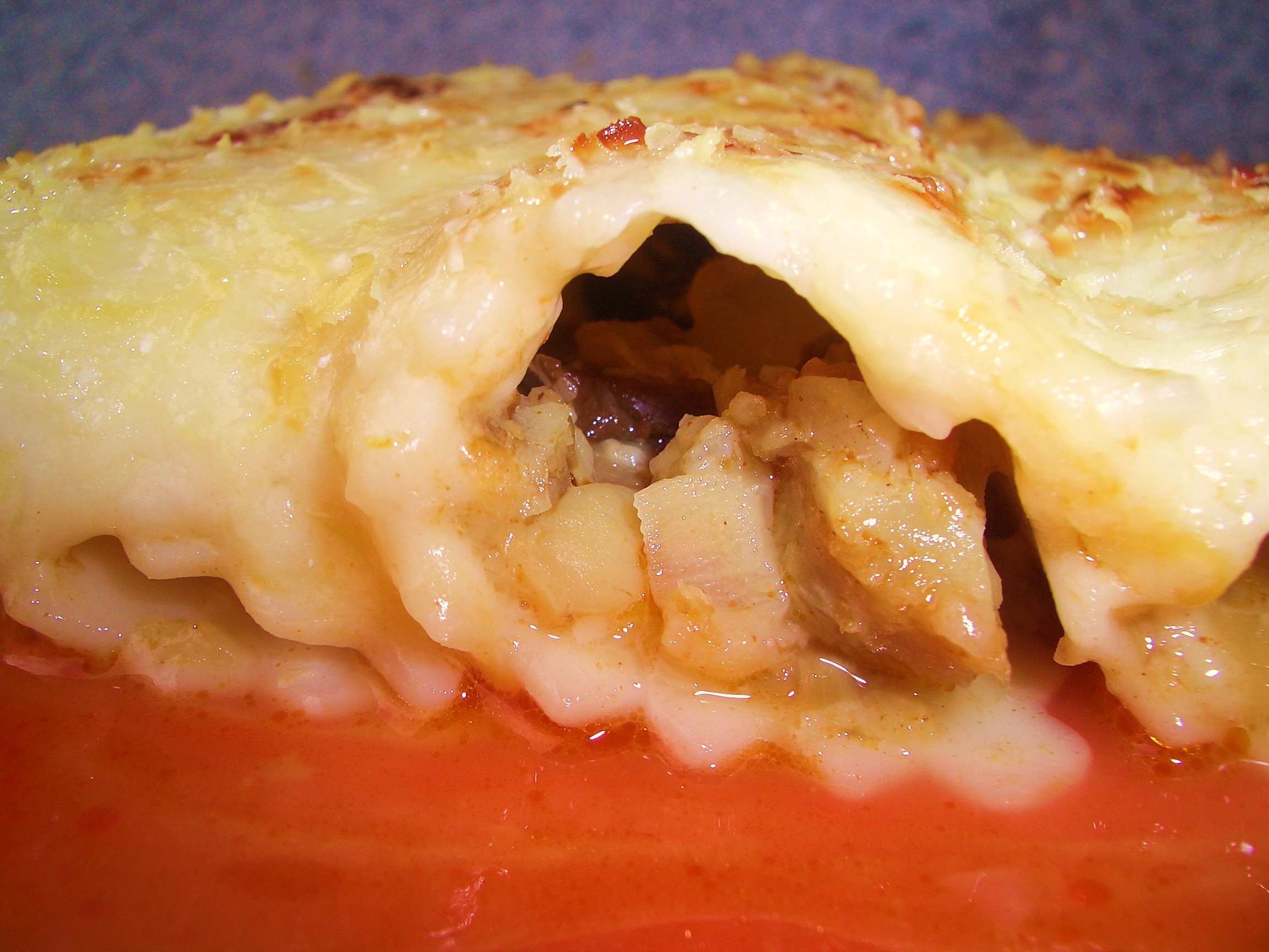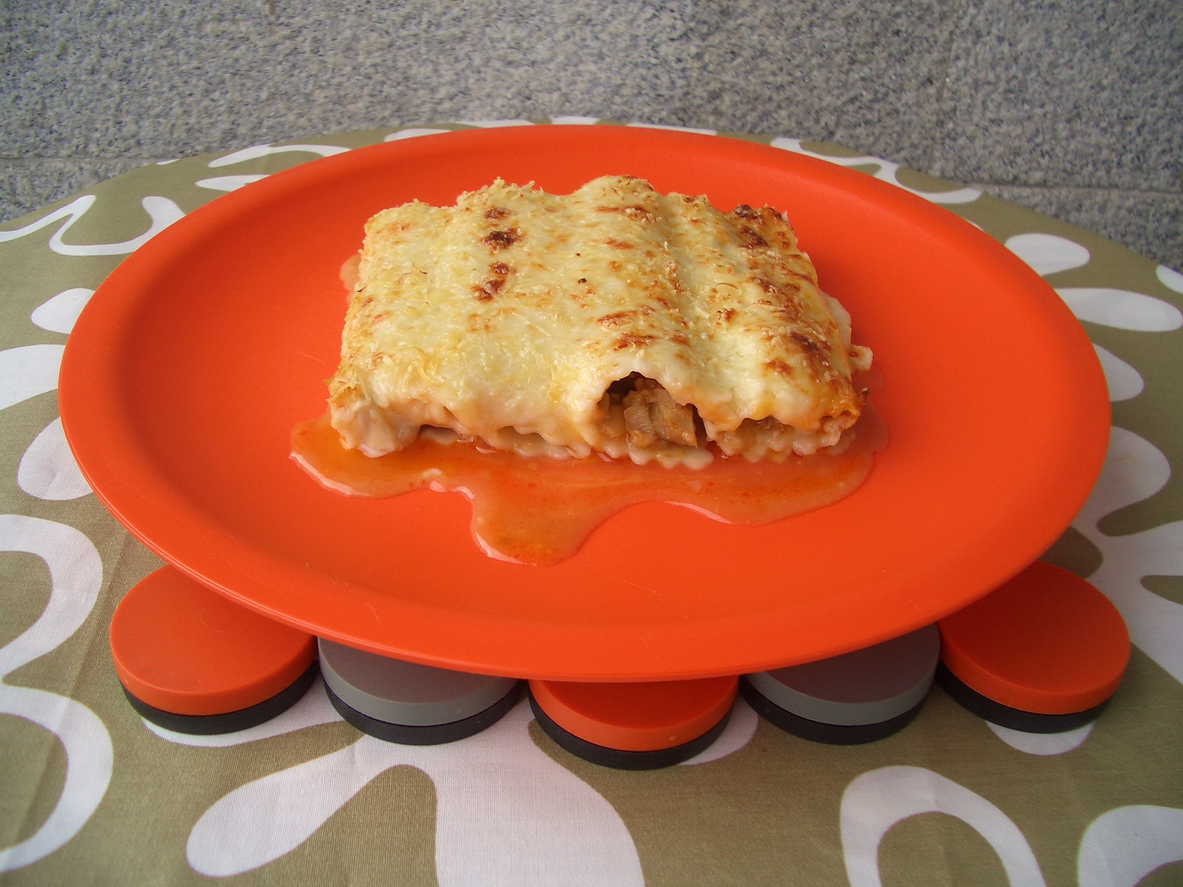 Necesariamente prescindiremos de la salsa de tomate para no disipar sabores y podría ser que el queso hilado para gratinar sobrara dejando simplemente la bechamel y parmesano rallado pero yo opté por añadirlo, no me imaginaba unos canelones o lasaña sin queso aunque en dosis moderada.