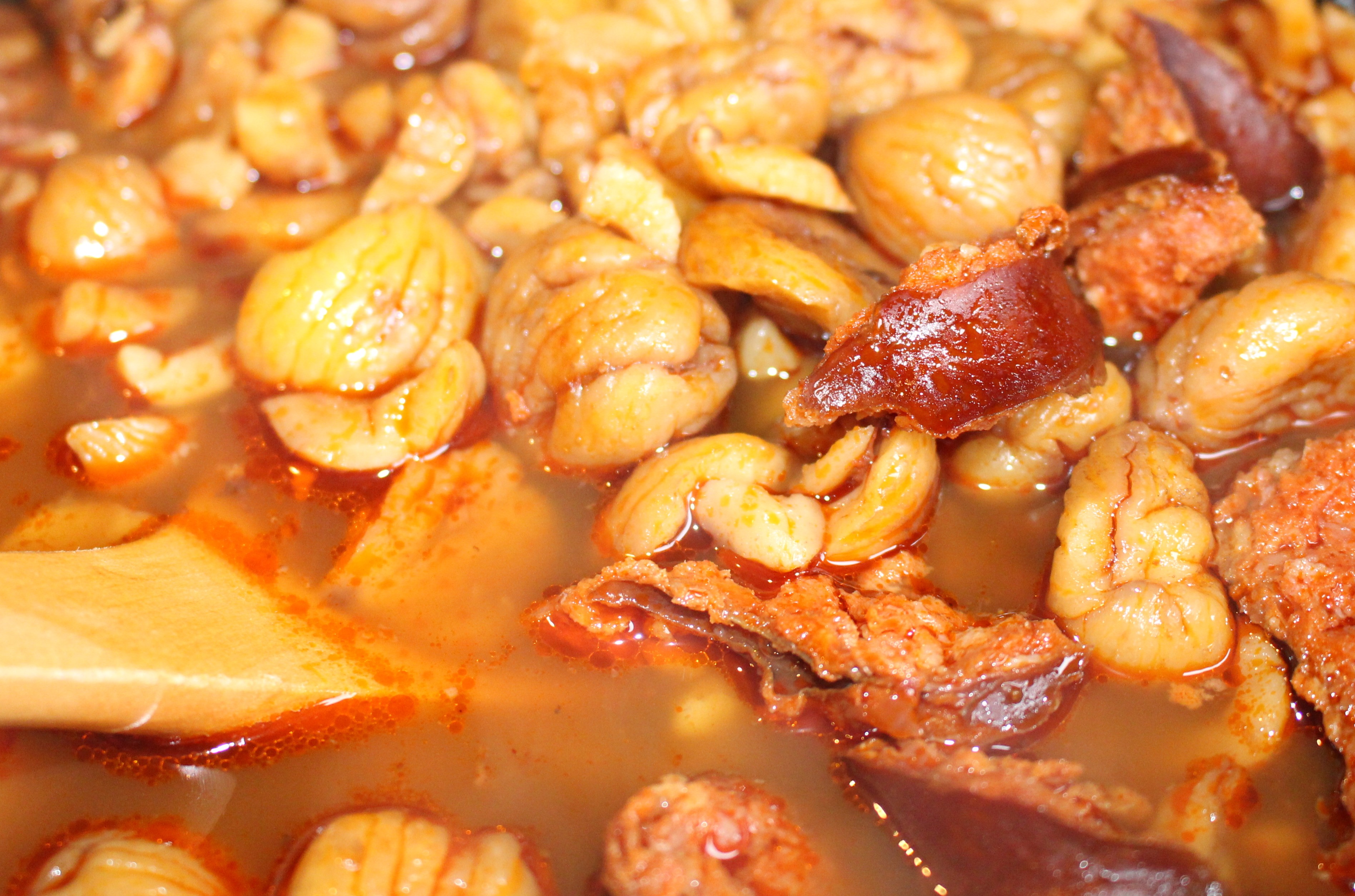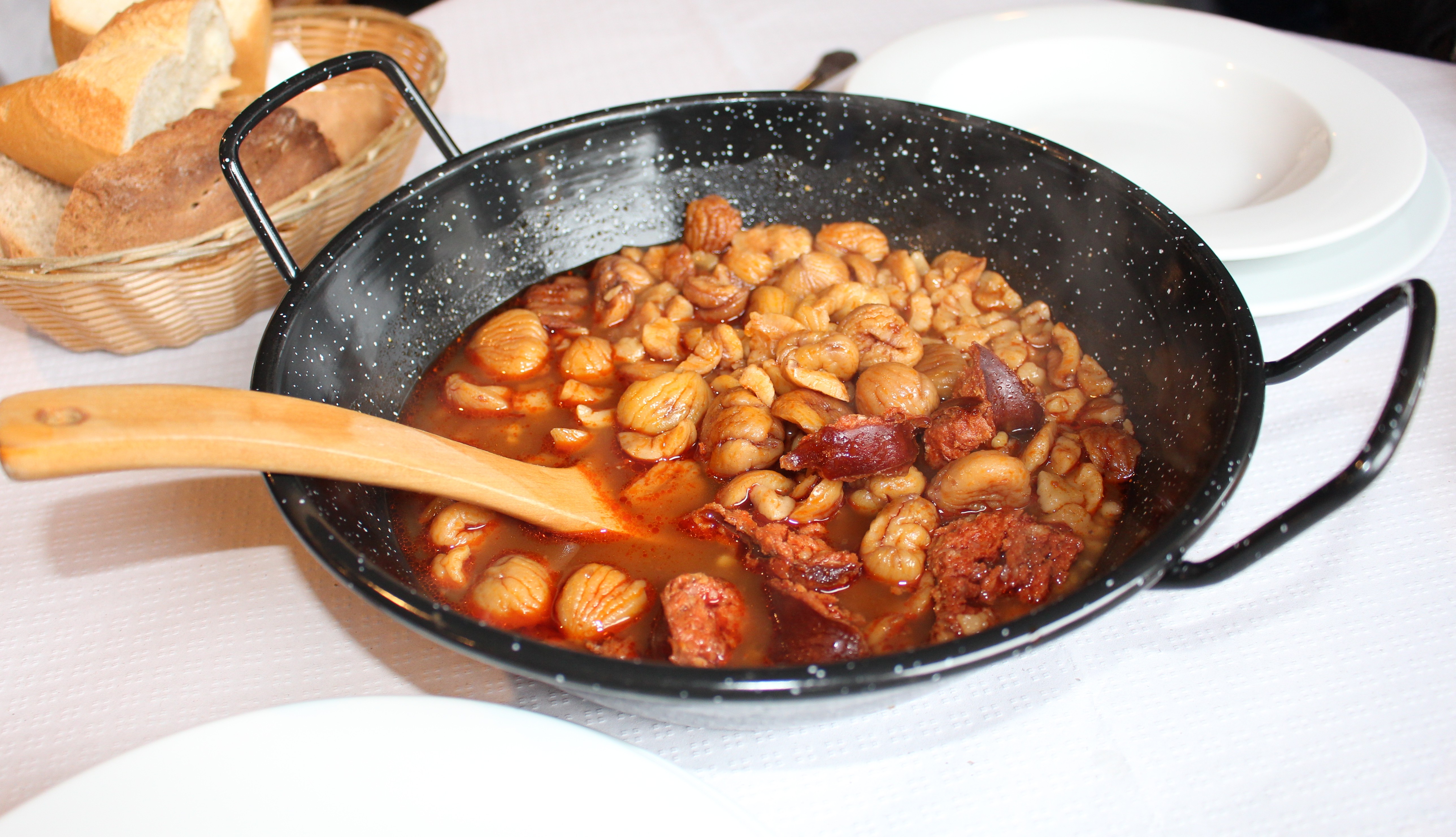 Tras unas cervezas al calor de la chimenea pasamos al comedor con una misión muy definida, el pote de castañas, de segundo una caldereta de cabrito. El pote estaba muy bueno pero me esperaba otra cosa, un pote de berzas en el que la patata fuese sustituida por la castaña al igual que sucede con el de nabos.