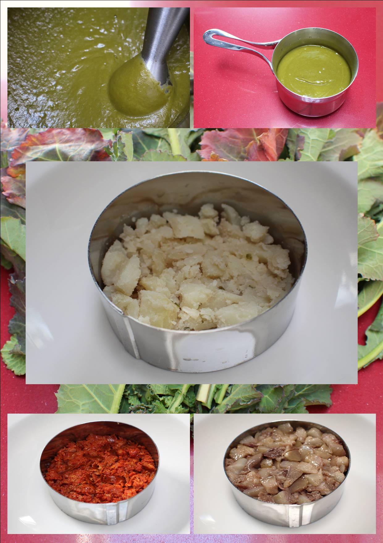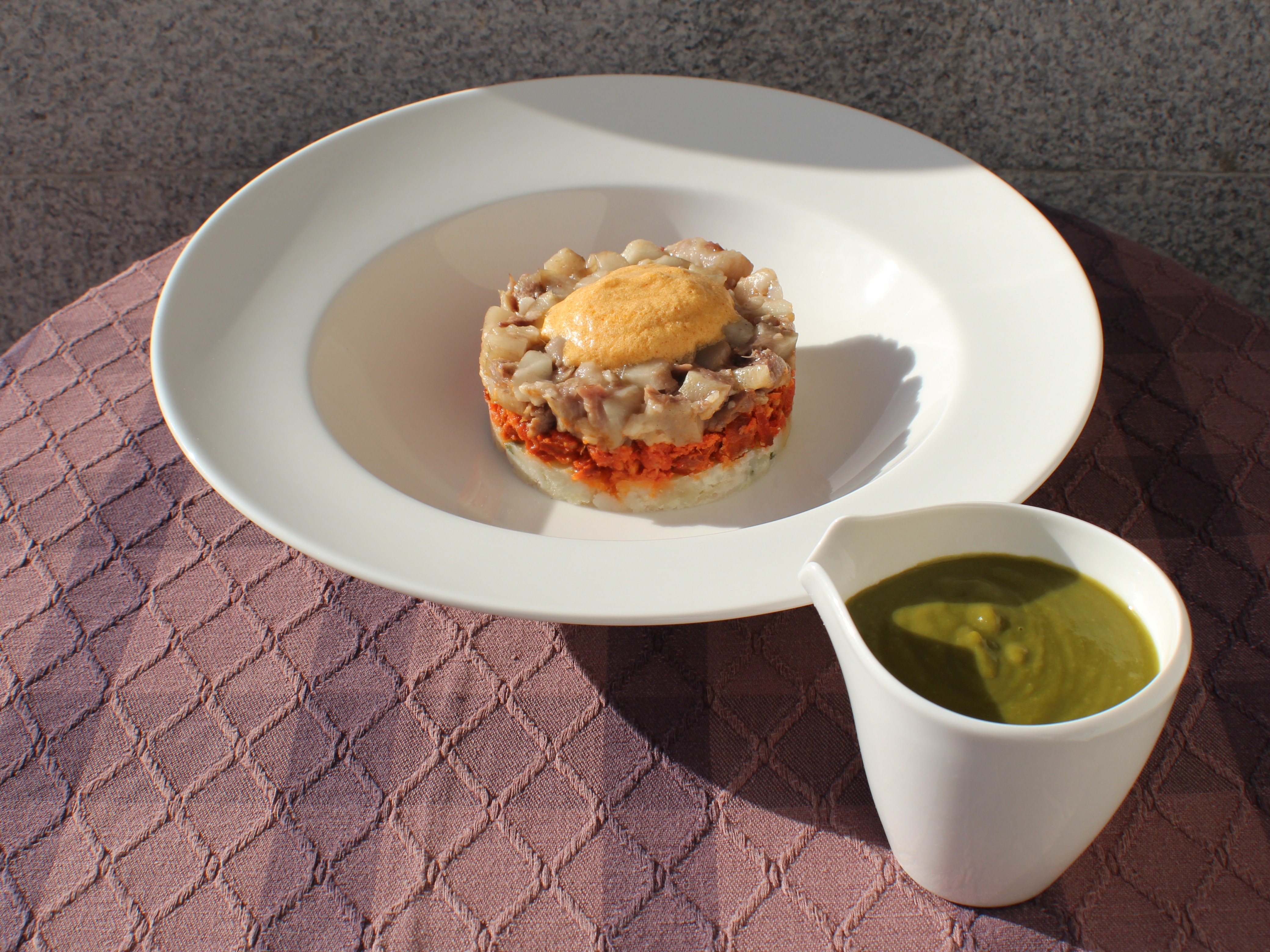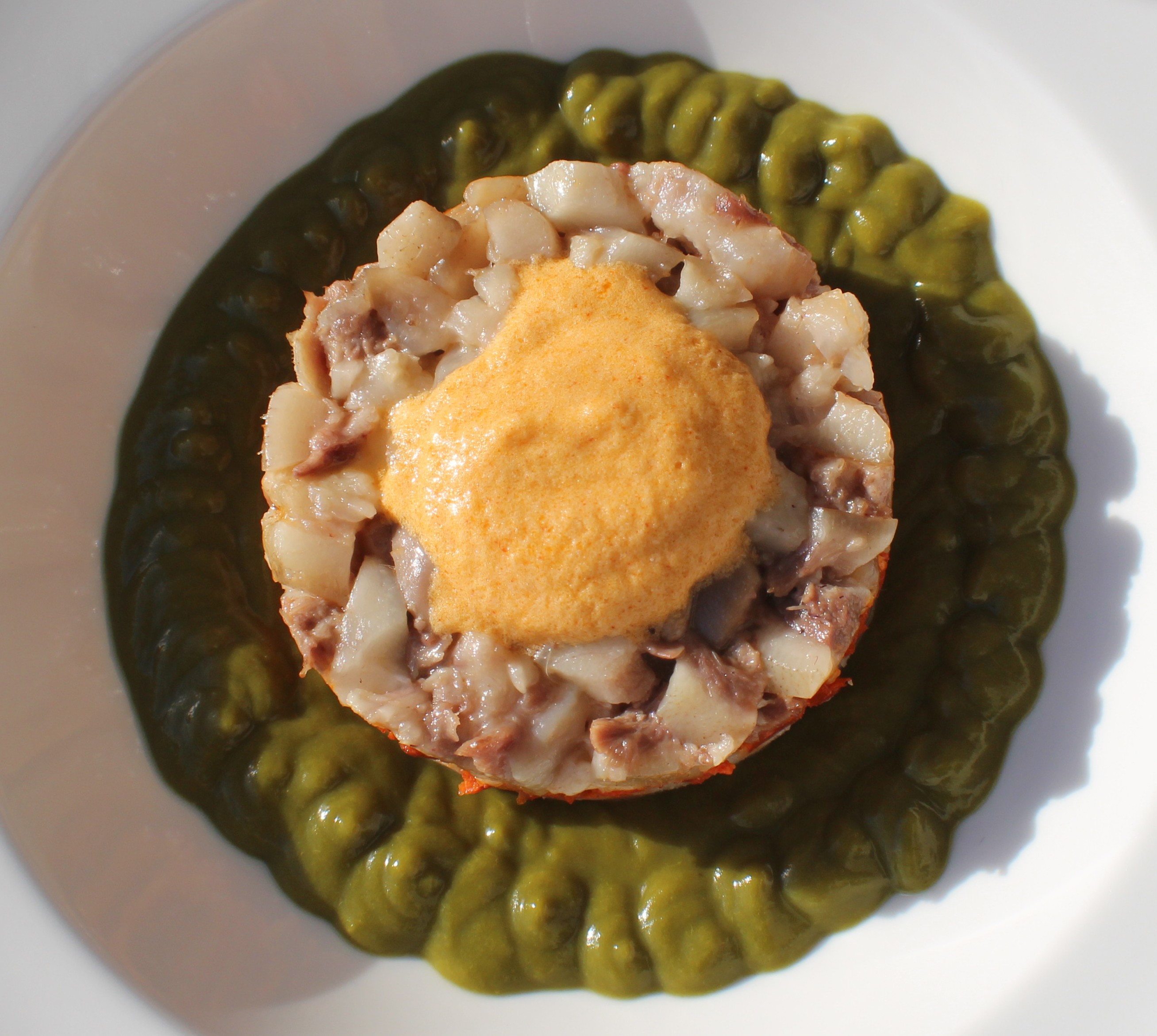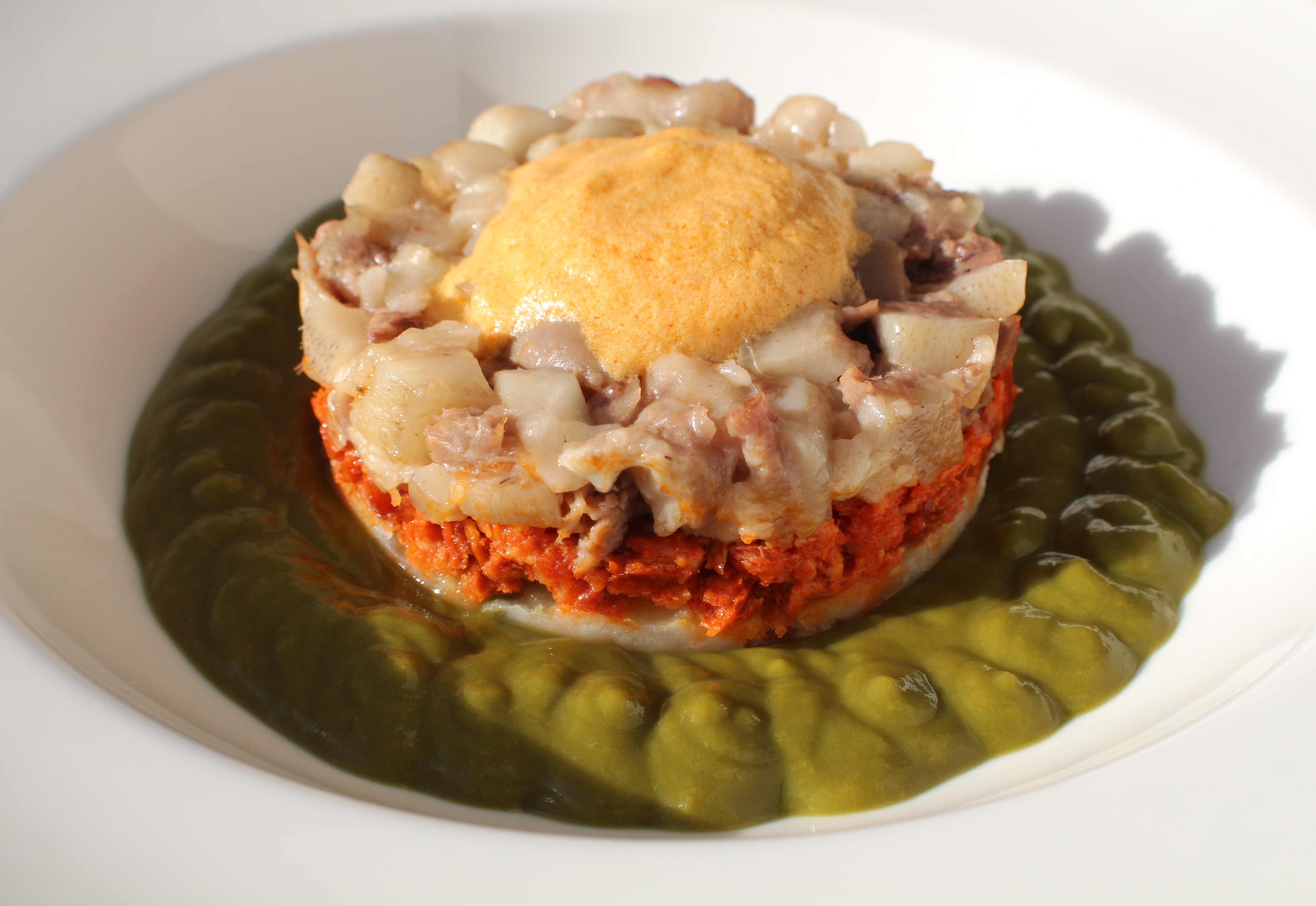 Conseguido uno de los ingredientes principales concluí que el formato que había de dar era un timbal, una visual forma de estratificar los ingredientes creando una isla rodeada de un mar de grelos y coronada por una espuma de pimentón y aceite.