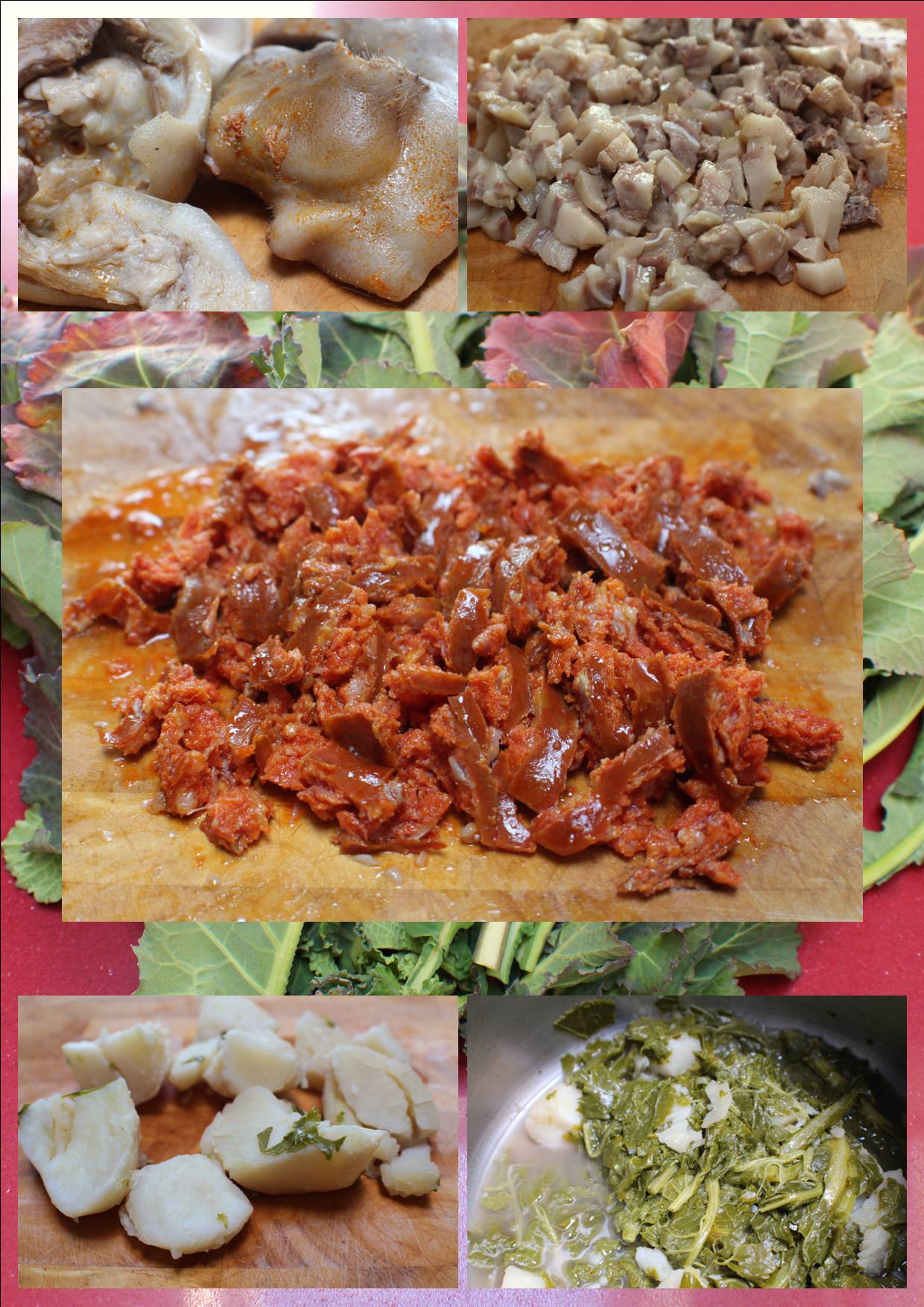 1 manojo de grelos, 3 patatas, 1 oreja y 1 morro de cerdo, 2 chorizos, 1 trozo de unto, 1 clara de huevo, pimentón picante, aceite de oliva virgen extra y sal.