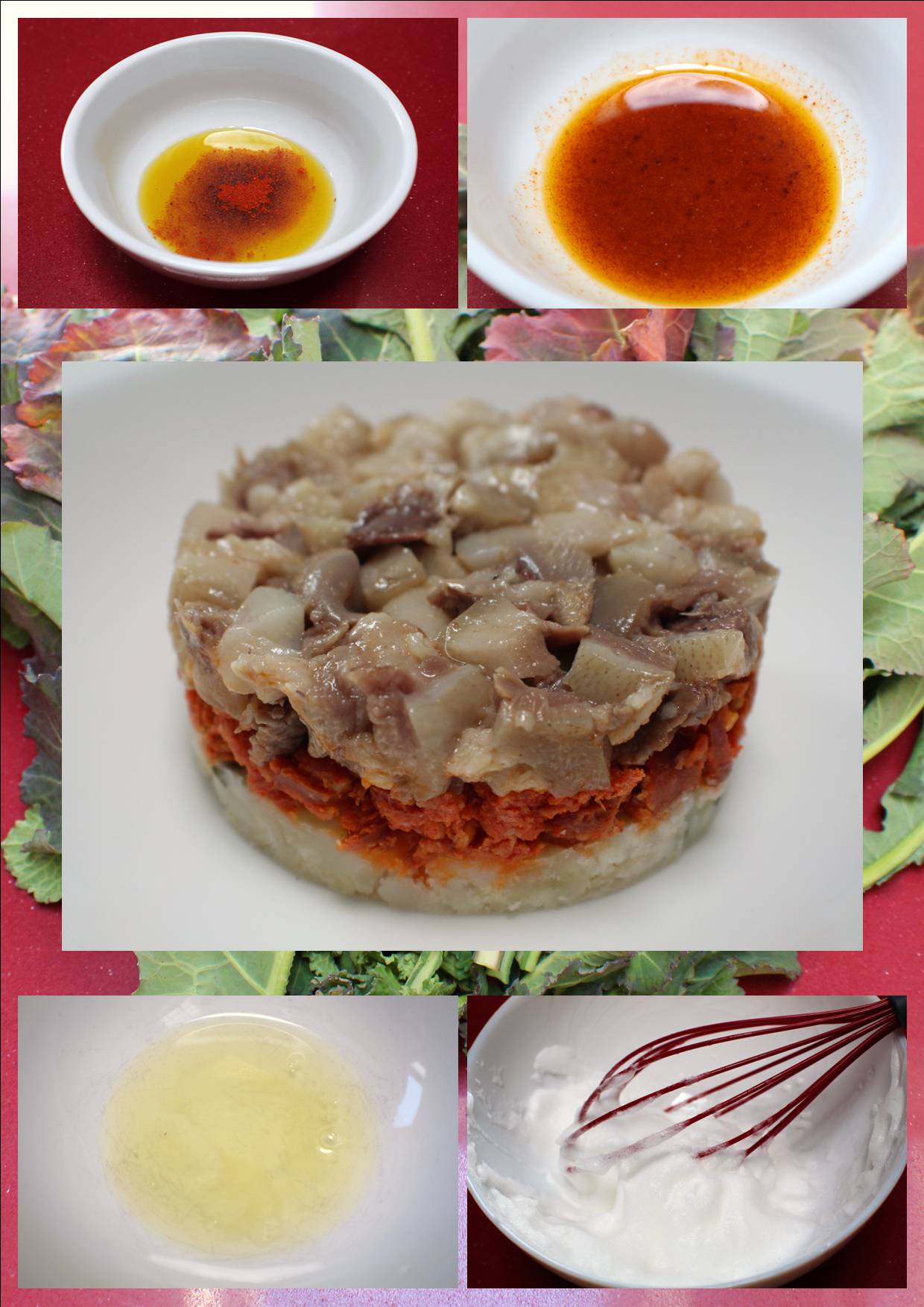 Para la espuma separamos la clara de la yema y batimos enérgicamente con una varilla. Con la ayuda de una espátula incorporaremos con cuidado una mezcla de aceite y pimentón picante.