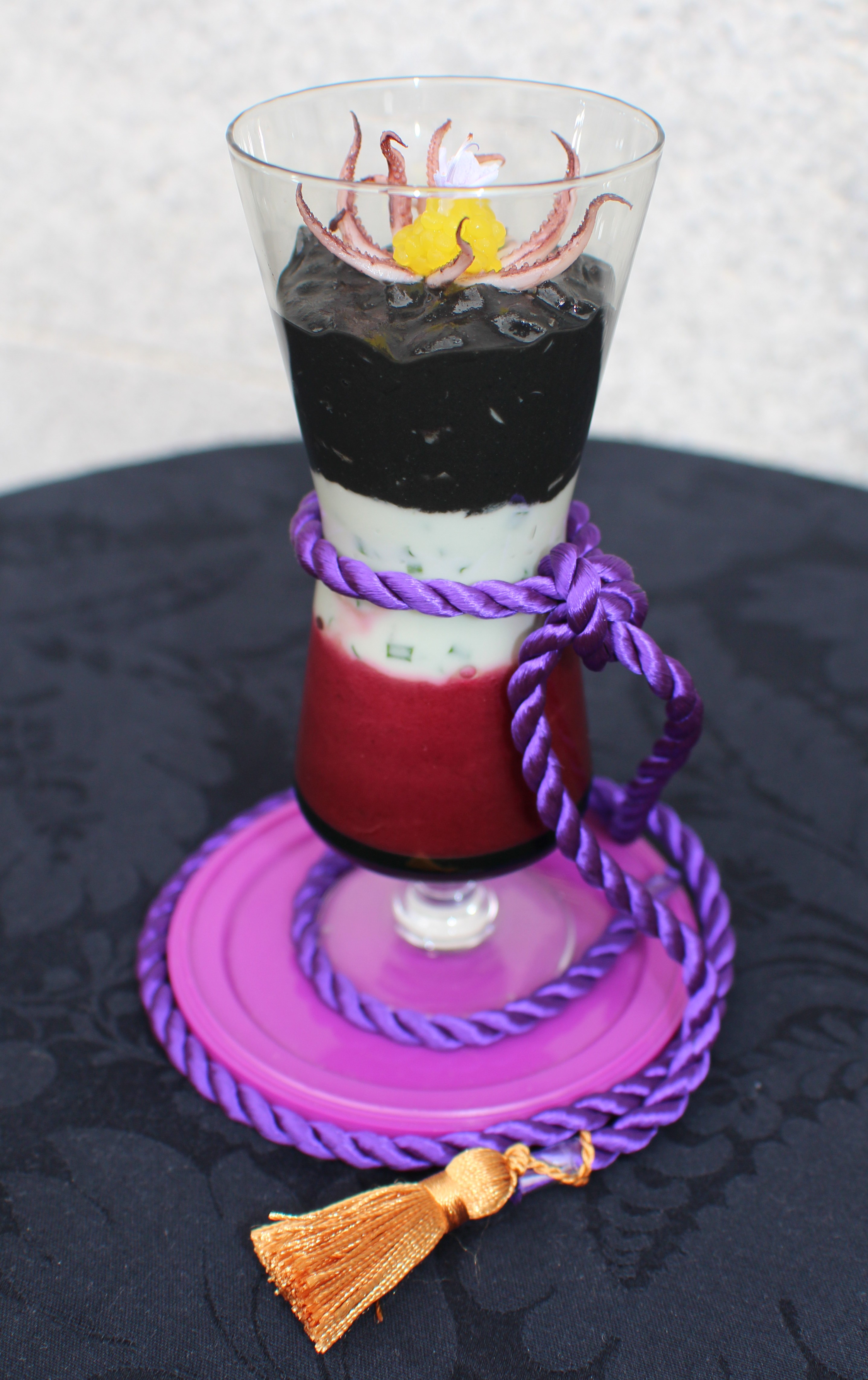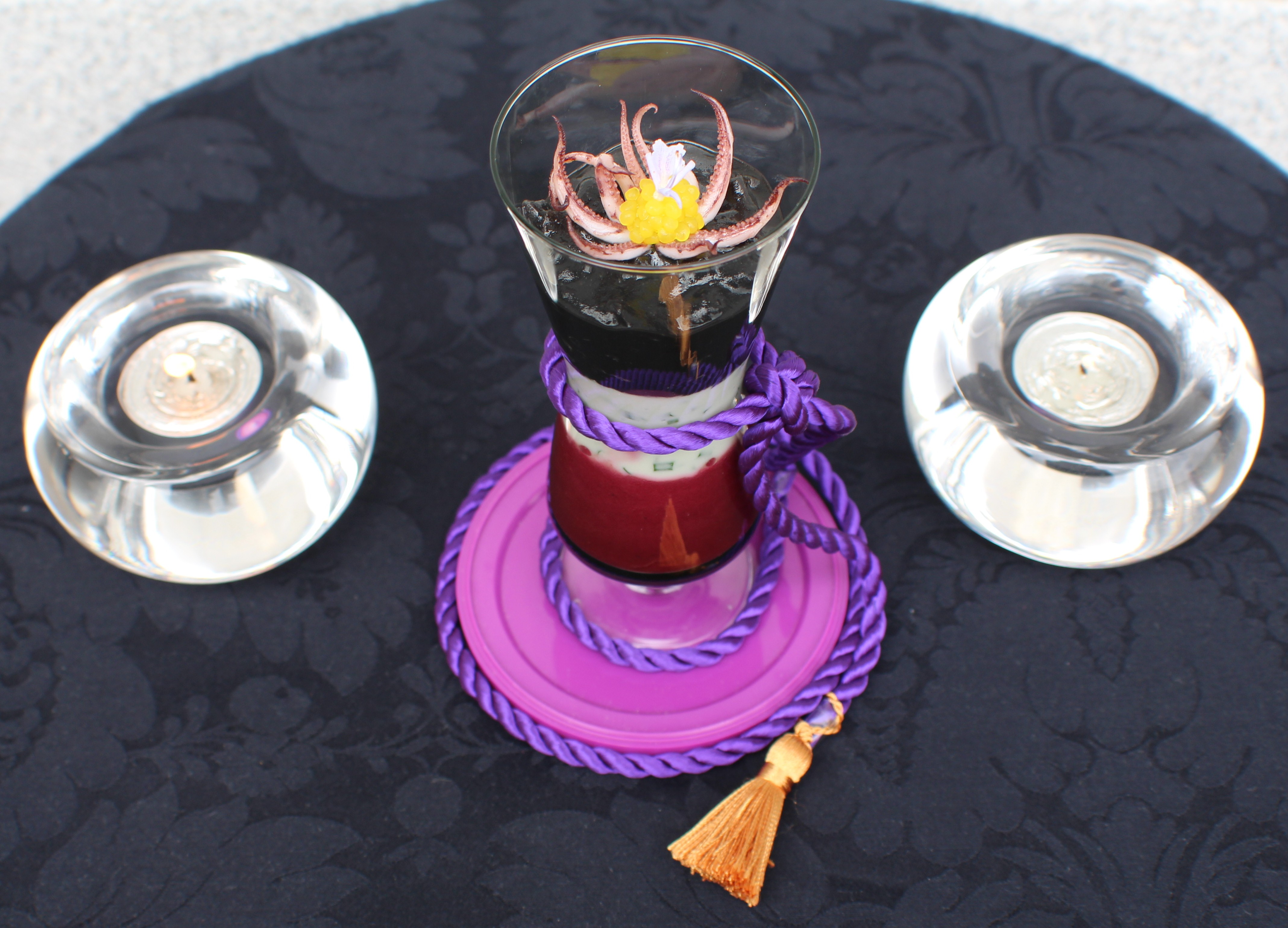 La idea del colorido es mezclar aquellos colores tradicionales de las hermandades, blanco, morado, negro, dorado. Por lo que atañe a los sabores vamos del dulzor de la remolacha al salado de los chipirones pasando por el agrio del queso fresco y rematado por el ácido del yuzu. Tomando la cuchara de abajo arriba podremos disfrutar de esta mezcla que nos hará resucitar.