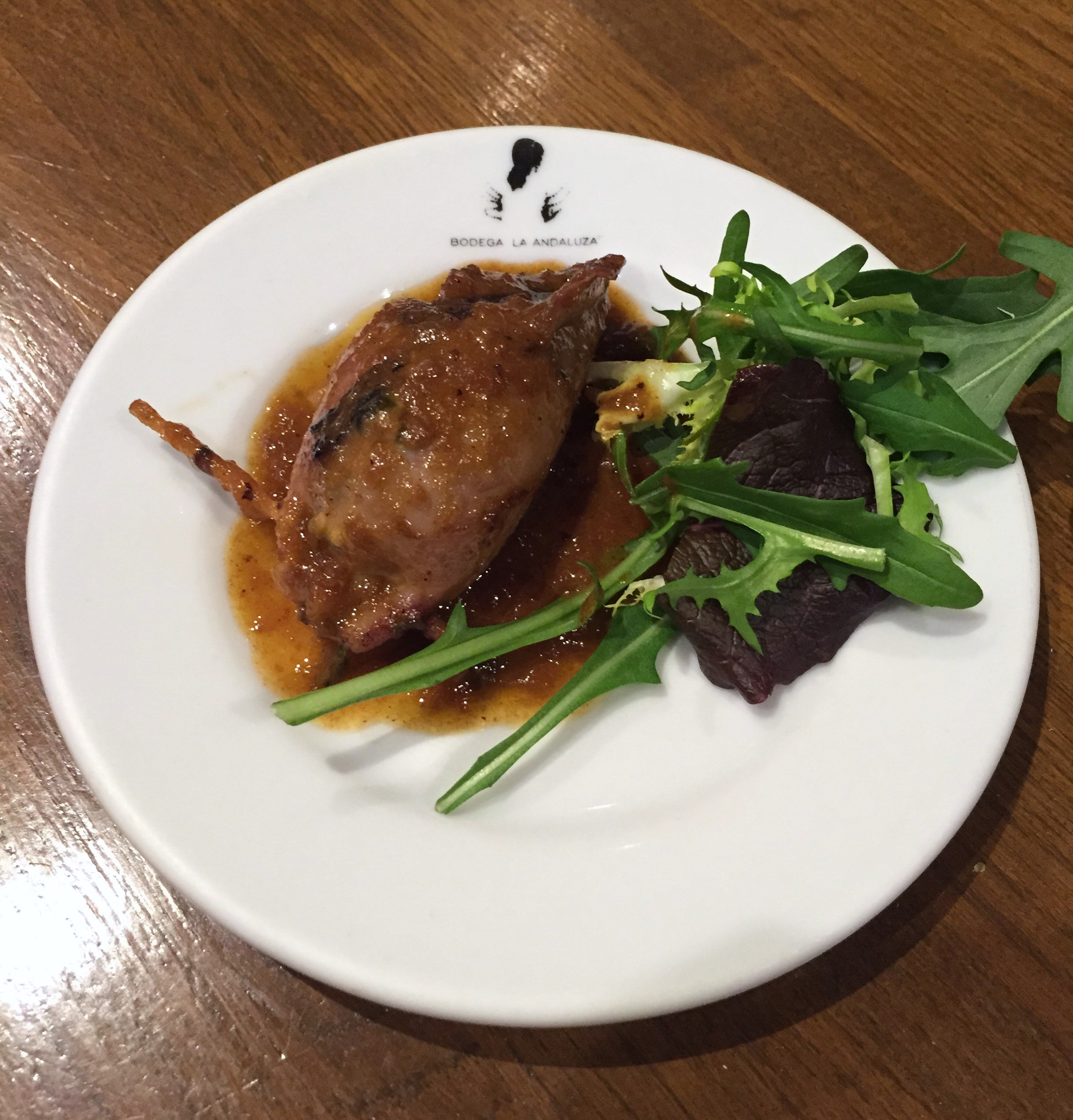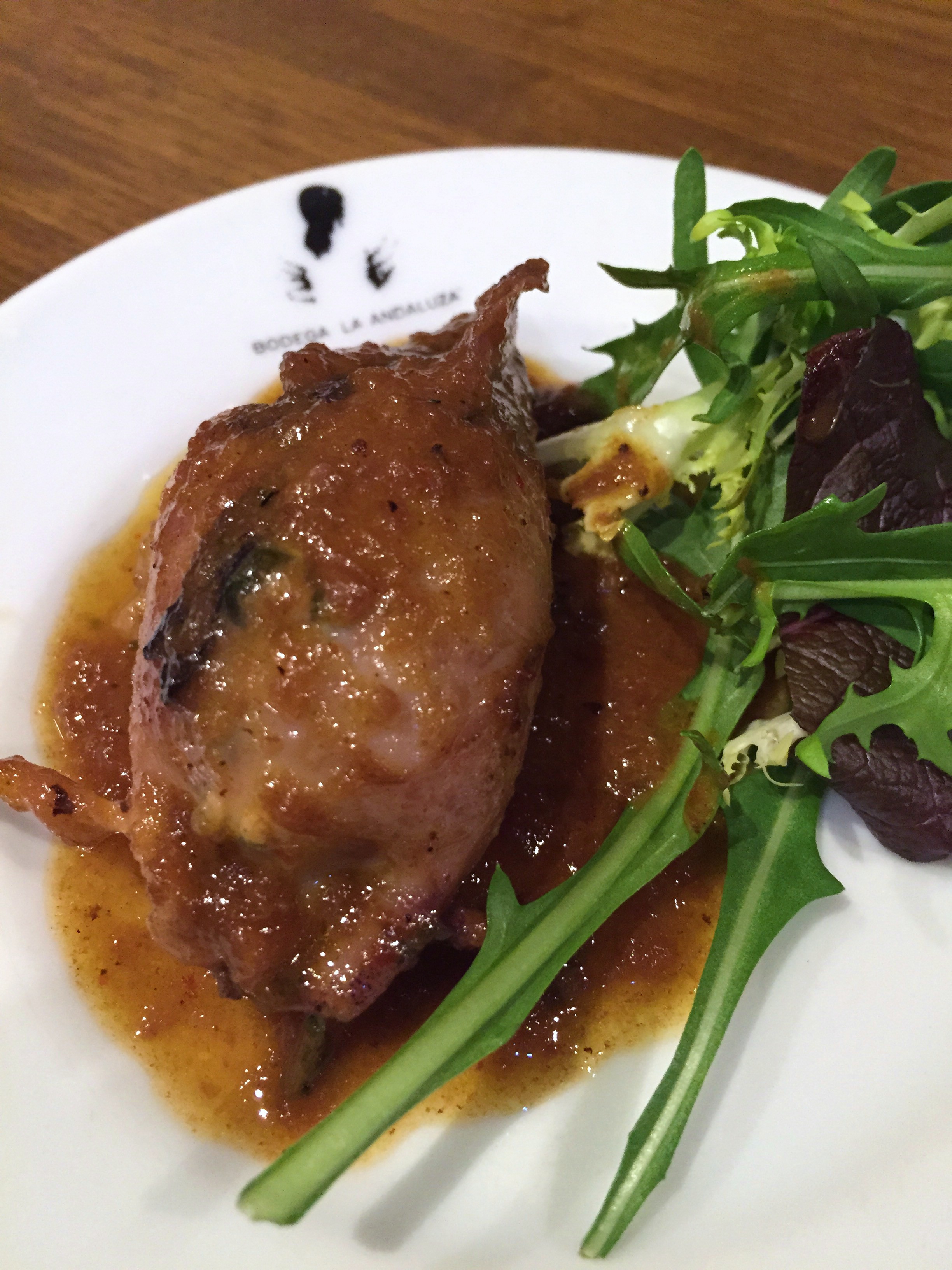 Homenaje a la Hermandad de los Estudiantes. Se trata de un chipirón relleno de un clásico pisto con sus patitas, espinacas y gambas. Muy agradable y tradicional, de gran sabor pero sobra tanta rúcula.