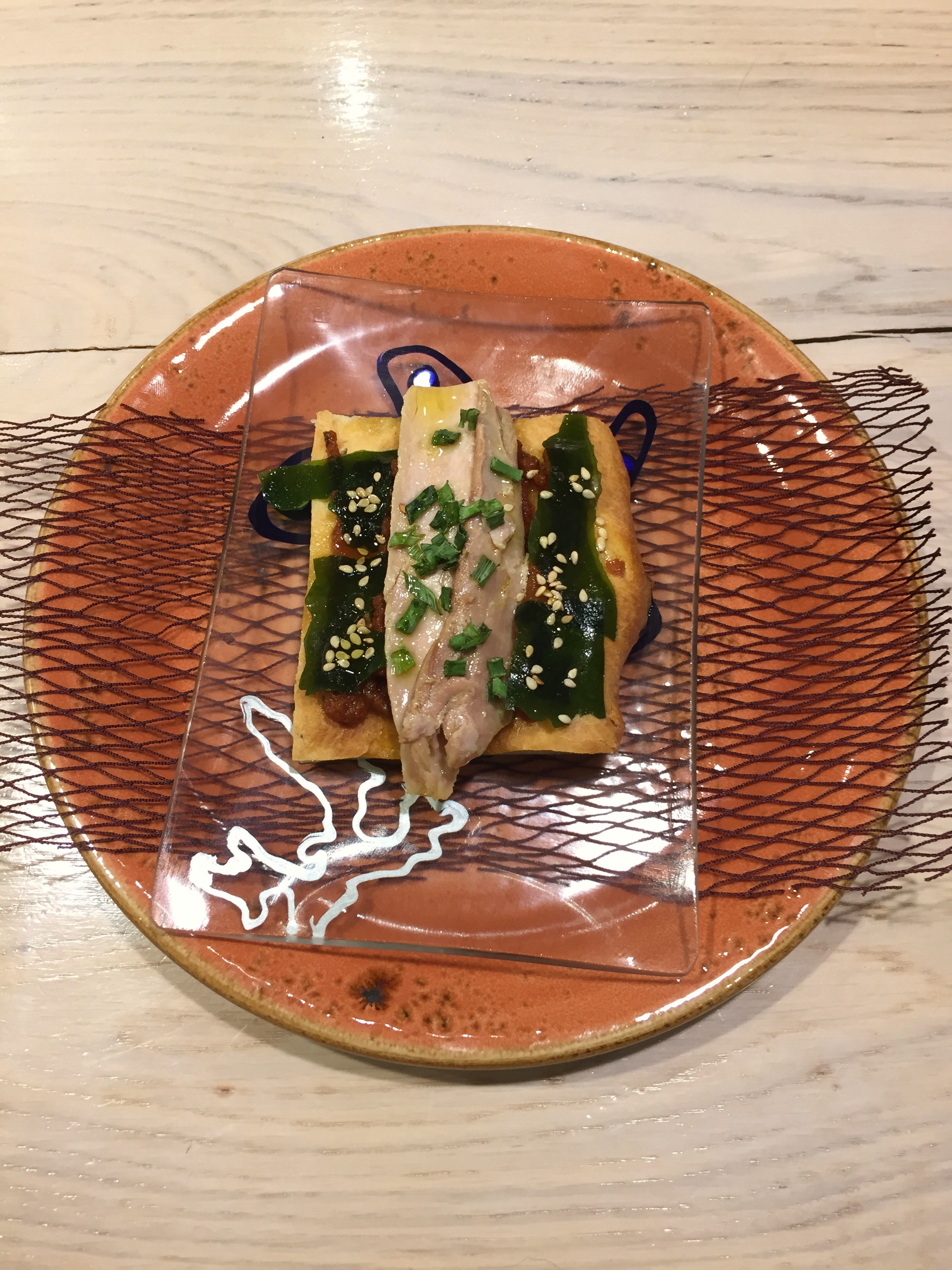 Es una tosta de focaccia con una base de picada de alcaparras y aceituna negra, con una pasta de tomate seco sobre la que va ventresca de bonito y unas algas. Trabajado, buena combinación de sabores, sencilla pero impactante presentación.