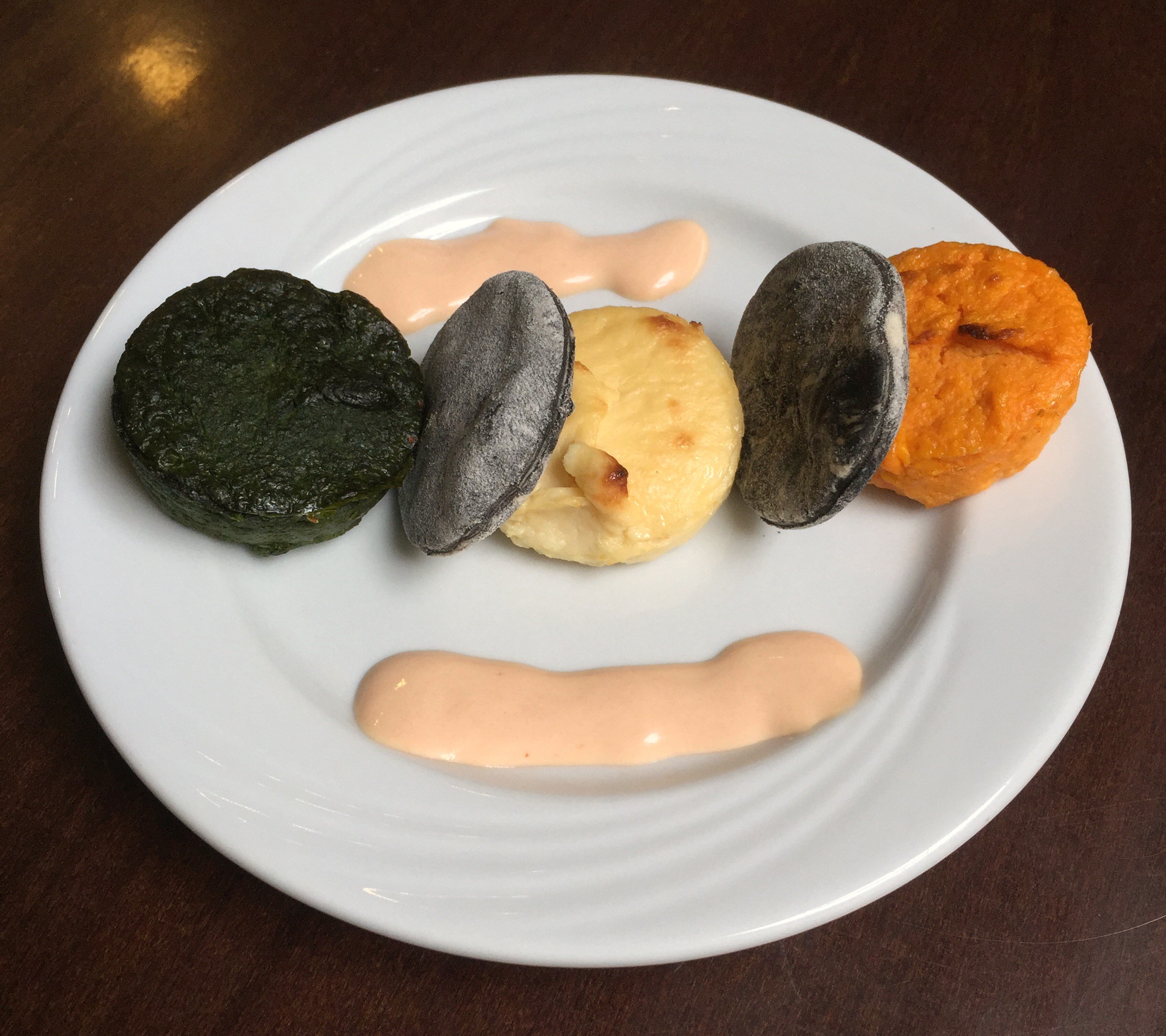 Efectivamente el colorido está servido con tres pasteles de espinacas, coliflor y zanahoria, alternados con dos panes negros y acompañado de una salsa rosa. Los pasteles tenían temperatura pero las cuentas no salen y me faltó un pan para acompañar. Los panes tenían textura goma, una pena y la salsa rosa podía haberse colocado con otra armonía más sutil.
