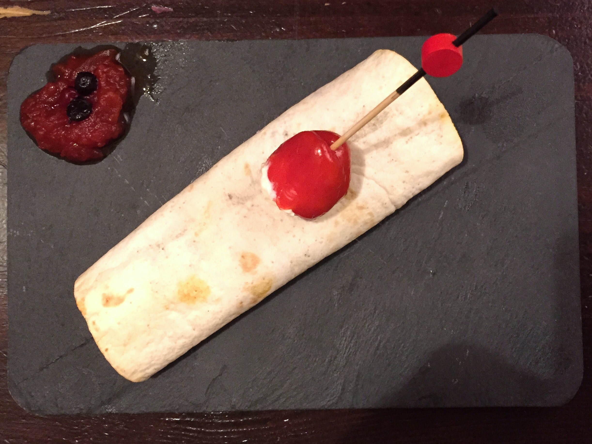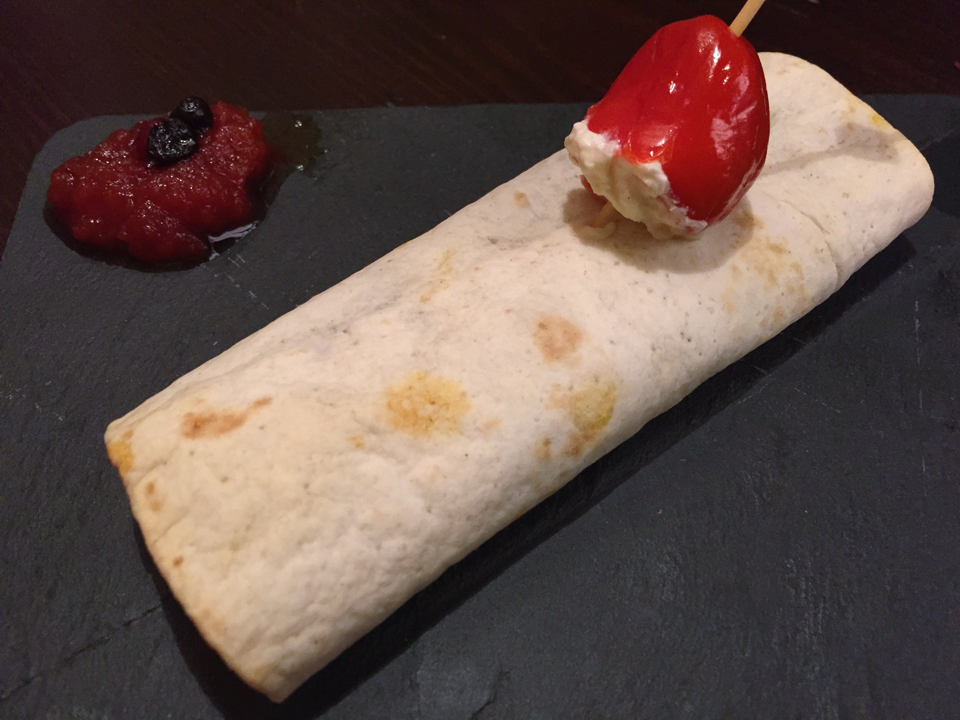 Se trata de un burrito con su tortilla de trigo, relleno de un pisto con bacalao acompañado de una mermelada de tomate y un pinchito de pimiento relleno con queso. Estaba recién hecho y el relleno era bueno aunque tardaron bastante en servirlo.
